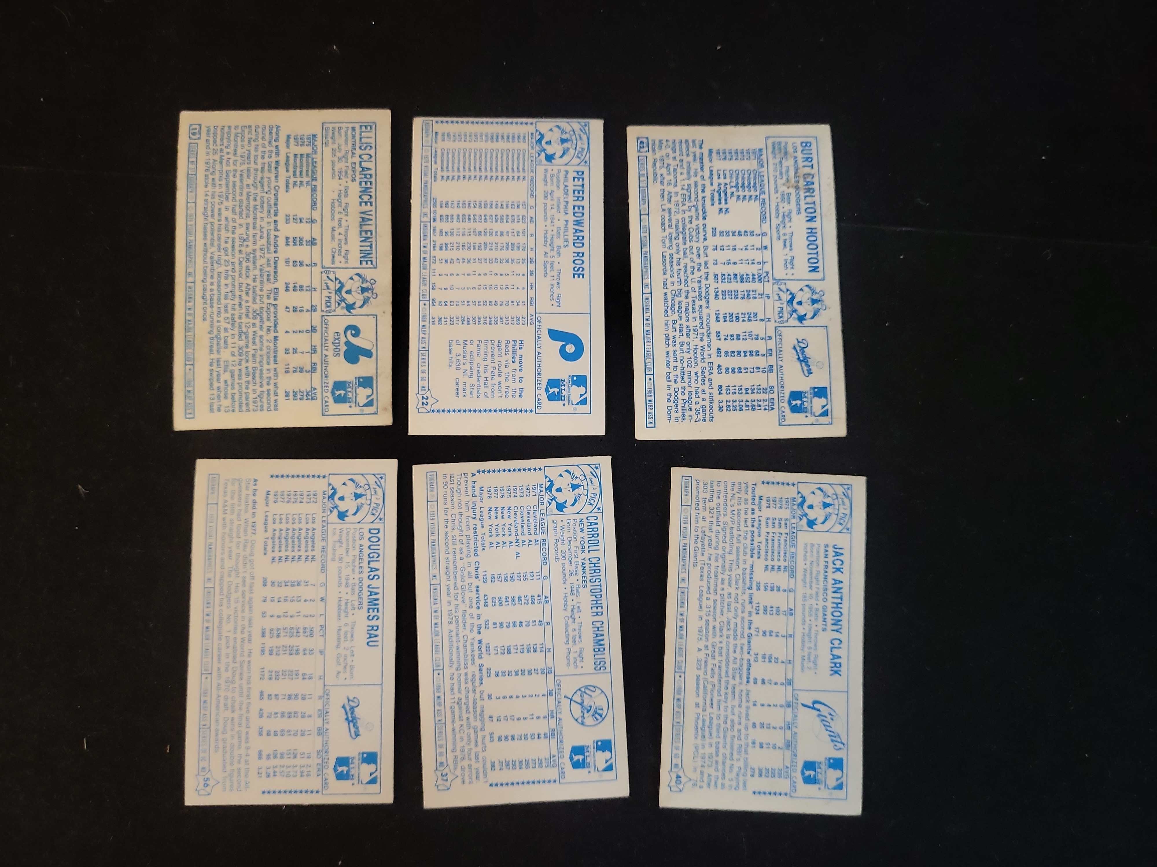 This collection consists of six vintage baseball cards from the 1978 Kellogg’s 3-D Super Stars set. These cards feature a lenticular 3-D design and were originally issued as cereal box prizes. The lot includes: #2 Pete Rose (Cincinnati Reds), #22 Ellis Valentine (Montreal Expos), #37 Chris Chambliss (New York Yankees), #40 Jack Clark (San Francisco Giants), #42 Burt Hooton (Los Angeles Dodgers), and #56 Doug Rau (Los Angeles Dodgers). All cards are raw and ungraded.