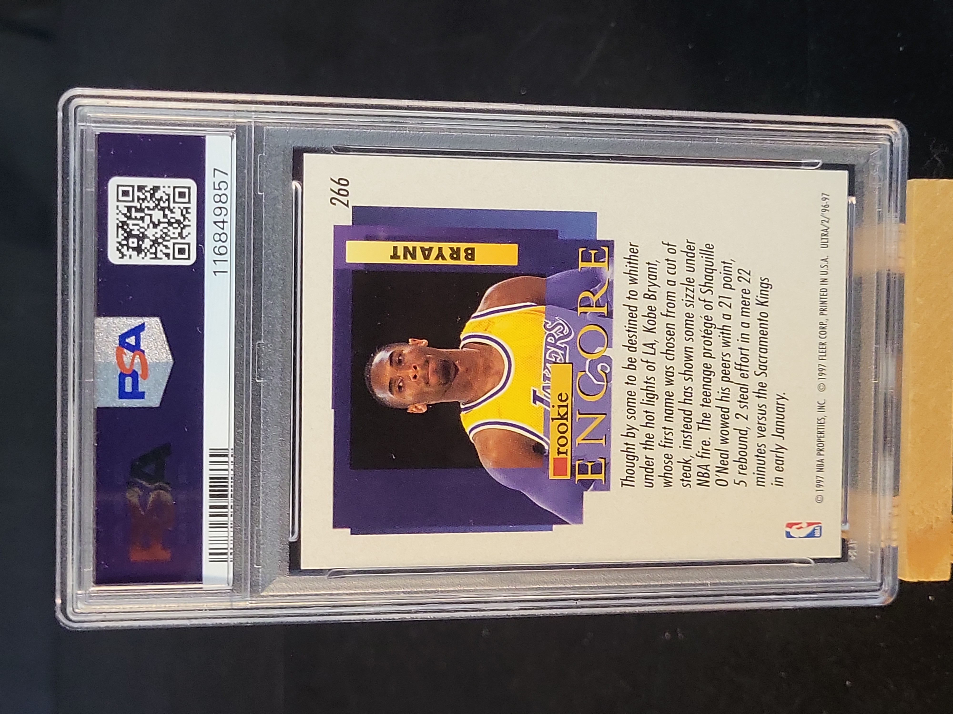 Fleer Ultra, 1996-97, Encore subset, card number 266, Kobe Bryant, rookie card status. This card features the Hall of Fame guard in his Los Angeles Lakers home gold jersey. The item is professionally authenticated and encapsulated by PSA with certification number 116849857.