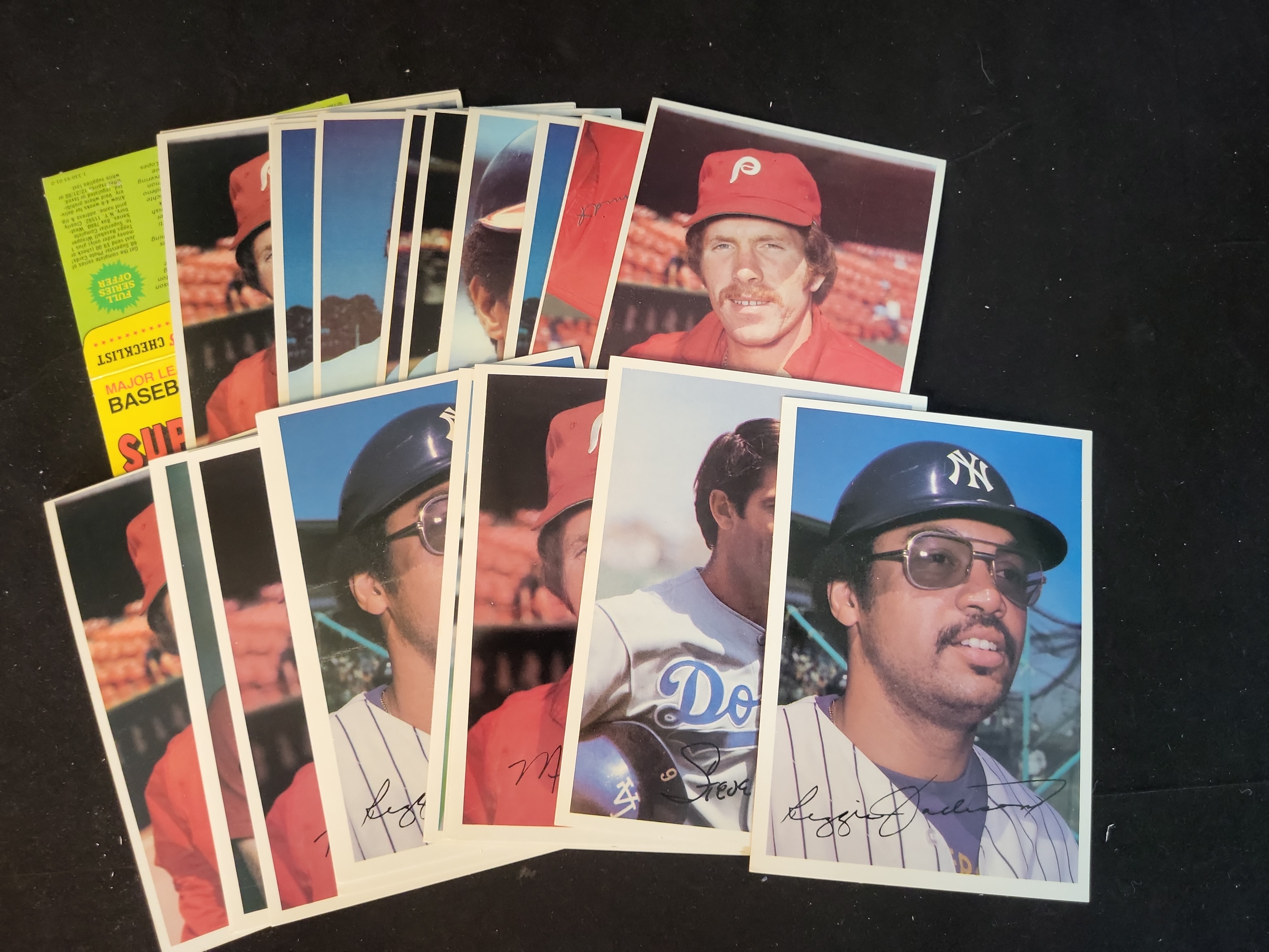 Brand: Topps. Year: 1980. Set: Superstar 5×7 Photographic Cards (Oversized Series). Players: Group of approximately 14 cards featuring multiple copies of Hall of Famers Reggie Jackson and Mike Schmidt, and a single copy of Steve Garvey. Card Number: Unnumbered on front; part of a 60-card set. Rookie Status: N/A (Veteran stars). Parallel/Insert Type: Standalone large-format photographic series. Certification: Raw (ungraded). This lot includes the original yellow Superstar Checklist and offer card.