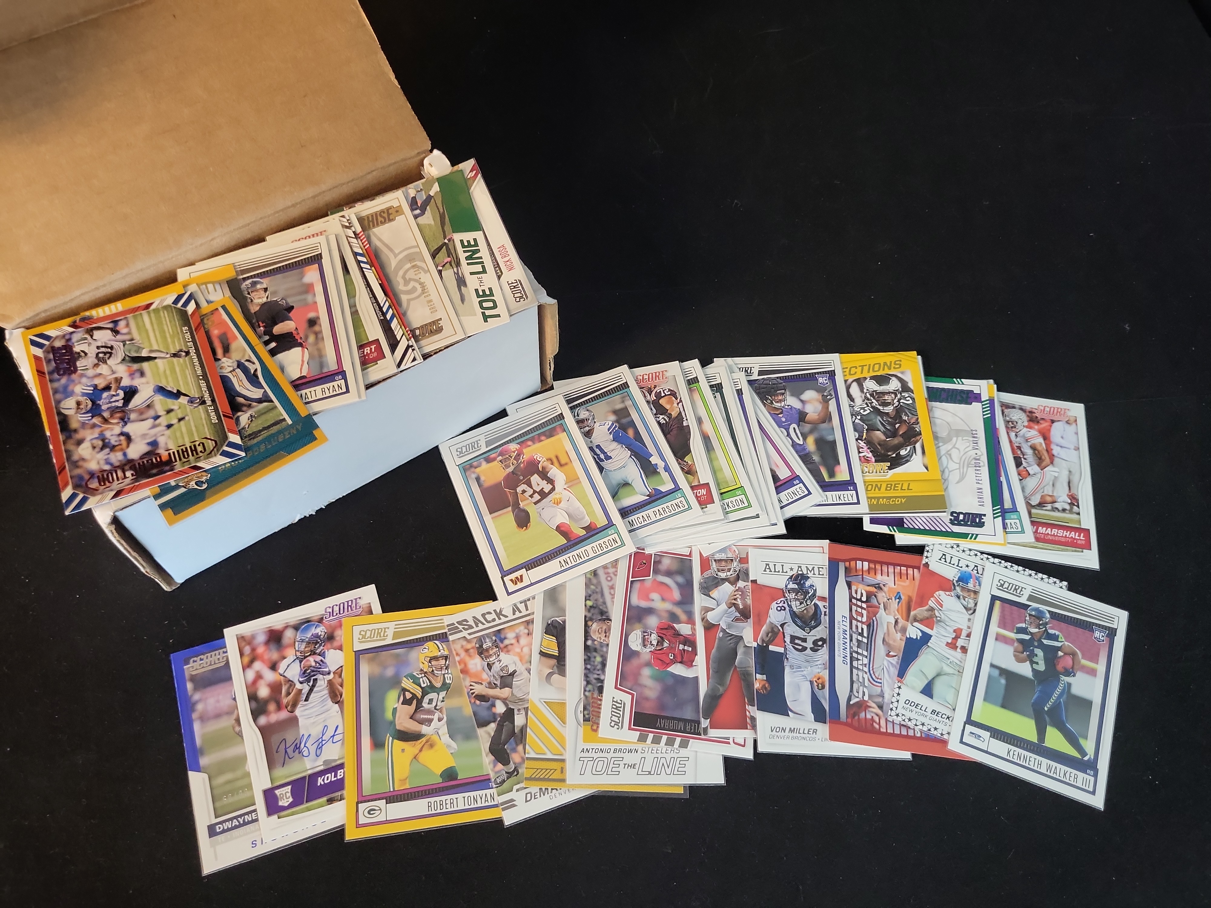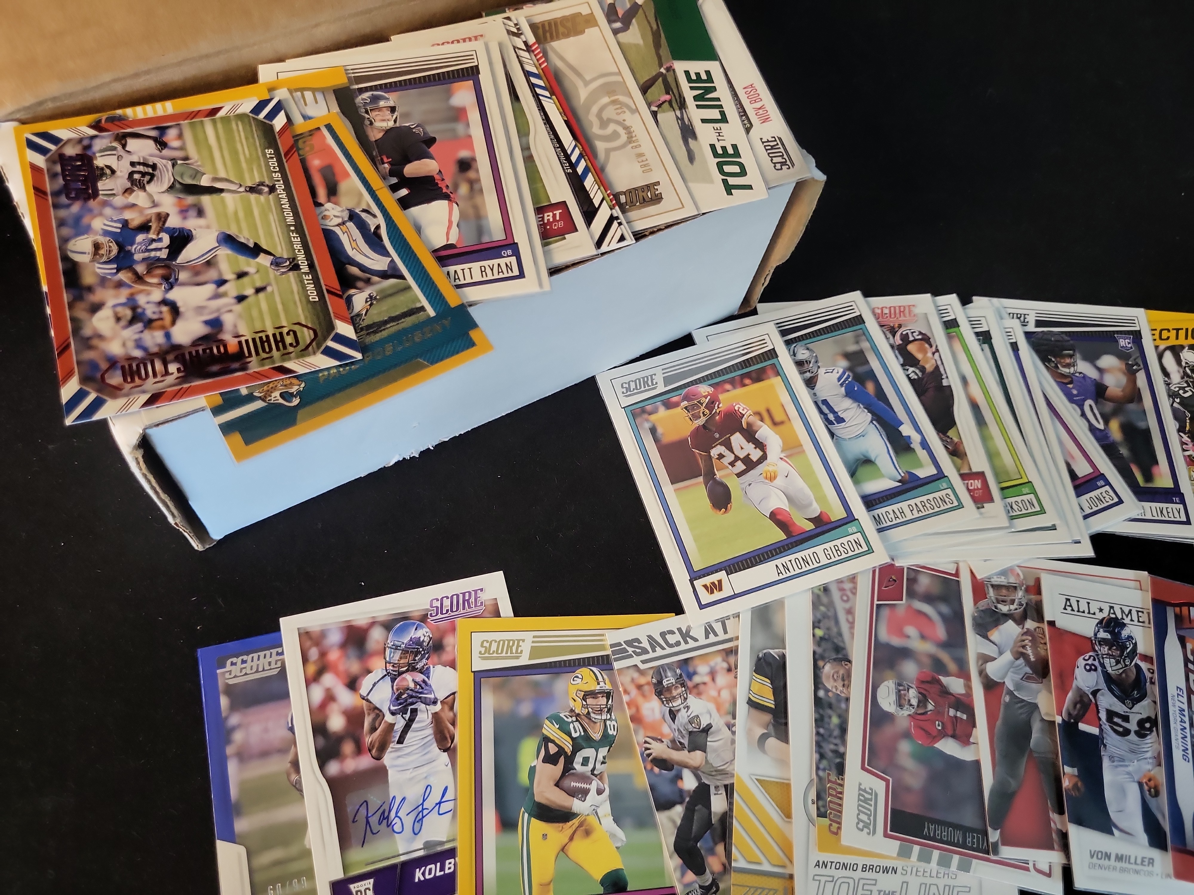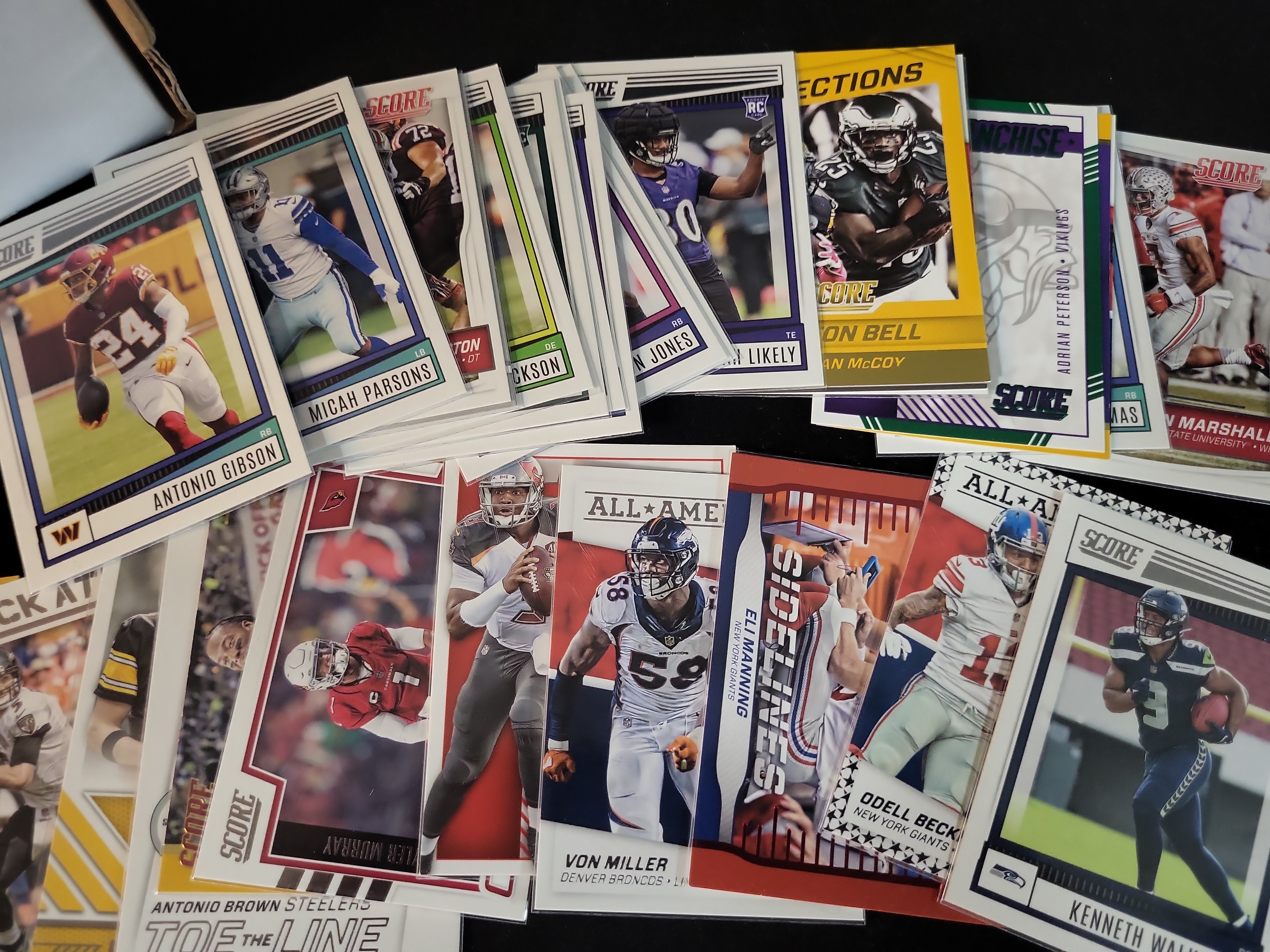 This auction features a comprehensive collection of modern NFL football trading cards, primarily issued under the Panini Score brand. The lot consists of a full standard white cardboard storage box containing an estimated 800 to 1,000 cards, alongside several dozen loose cards highlighted for display. The collection spans multiple recent production years, approximately 2014 through 2022. Notable Rookie Cards (RC) include Kenneth Walker III (Seahawks), Micah Parsons (Cowboys), and Isaiah Likely (Ravens). The lot is heavily populated with various insert sets including All-American (Von Miller, Odell Beckham Jr.), Toe the Line (Nick Bosa, Antonio Brown), Franchise (Adrian Peterson, Drew Brees), Sidelines (Eli Manning), and Chain Reaction (Donte Moncrief). Additionally, the collection contains various parallels with Gold, Purple, and Green borders featuring stars such as Matt Ryan and Kyler Murray, as well as a Kevin Kolb rookie card featuring a blue signature insert. This is an ideal lot for set builders or team collectors looking for high-volume modern base and inserts.
