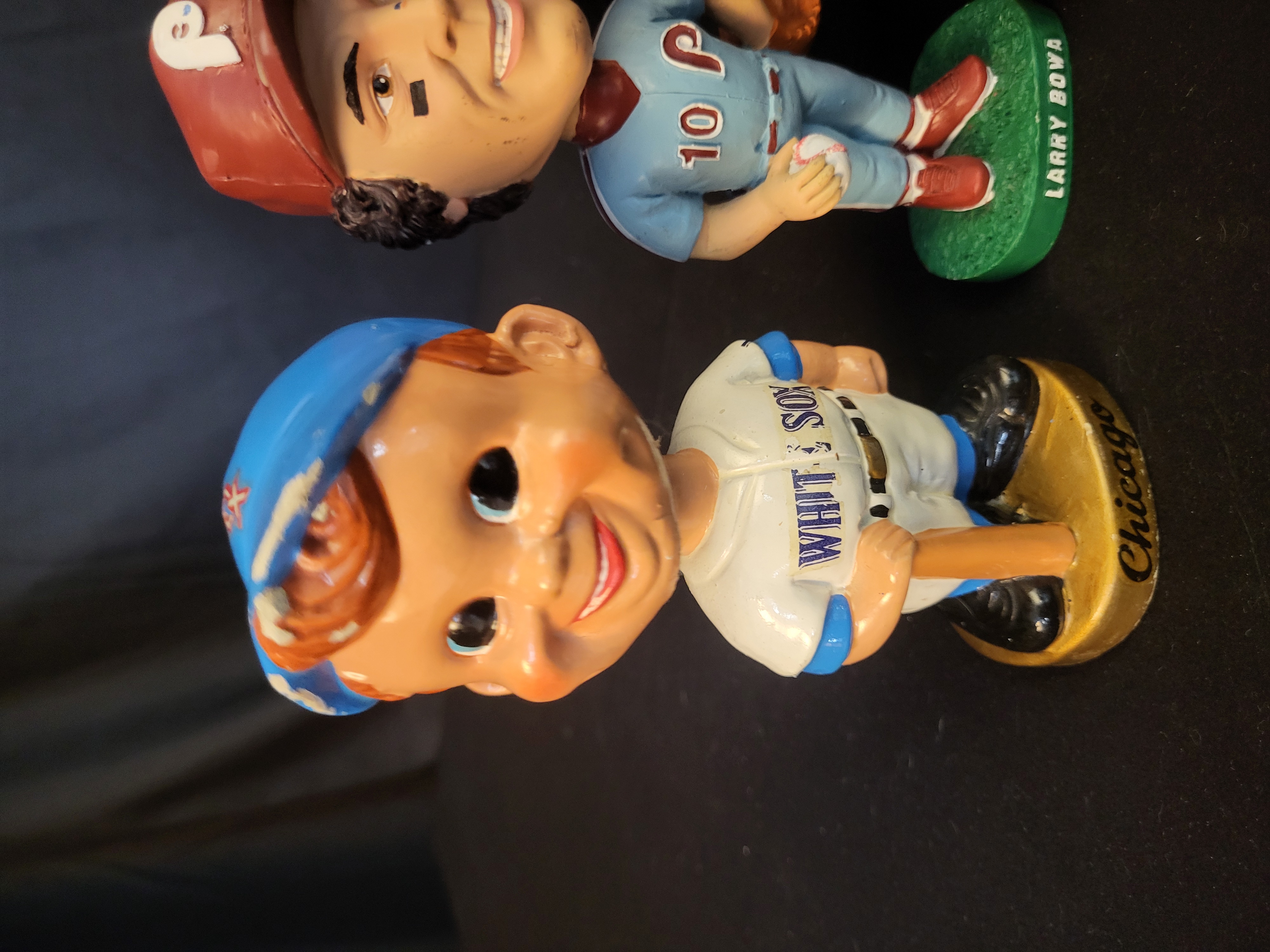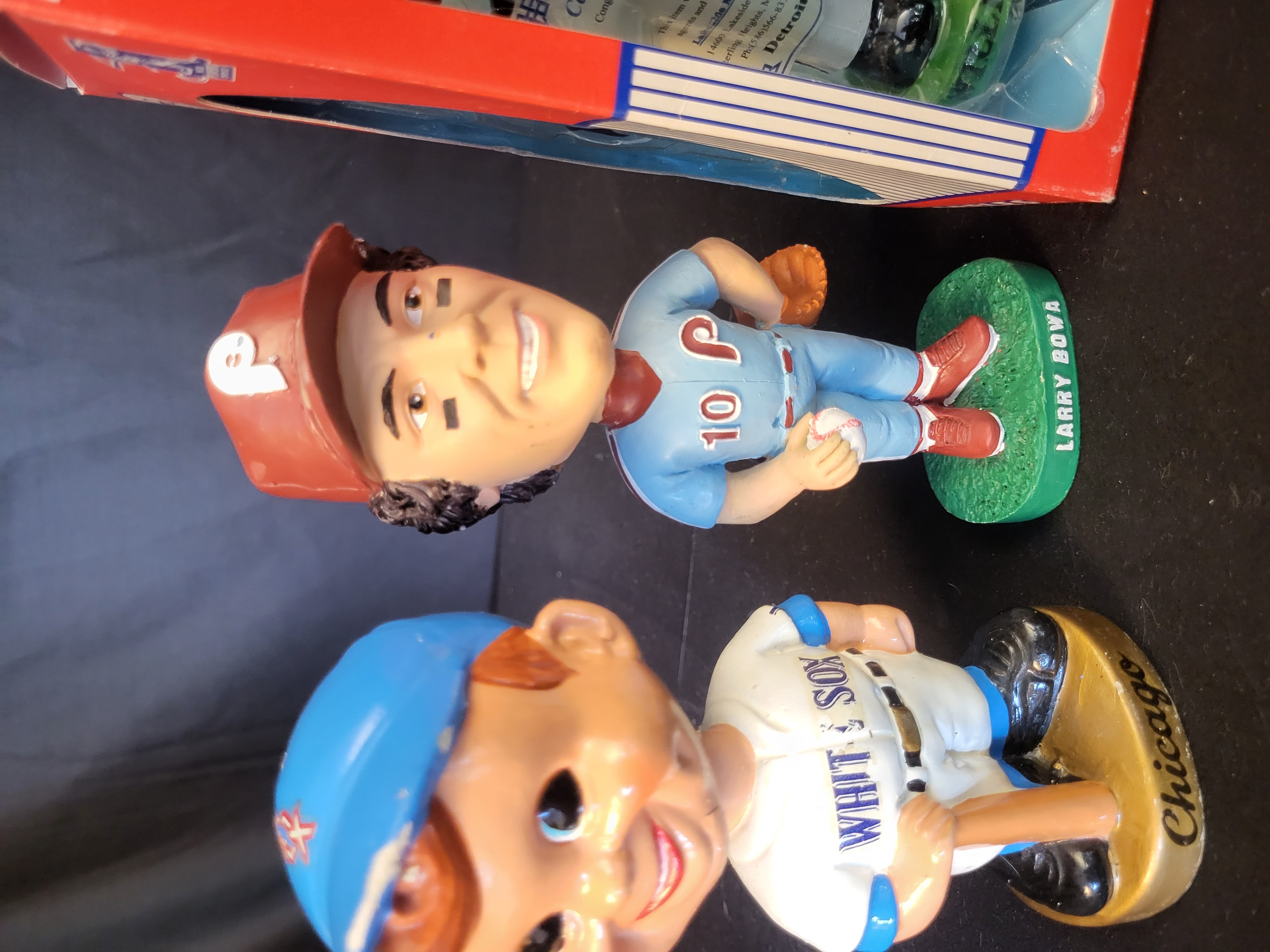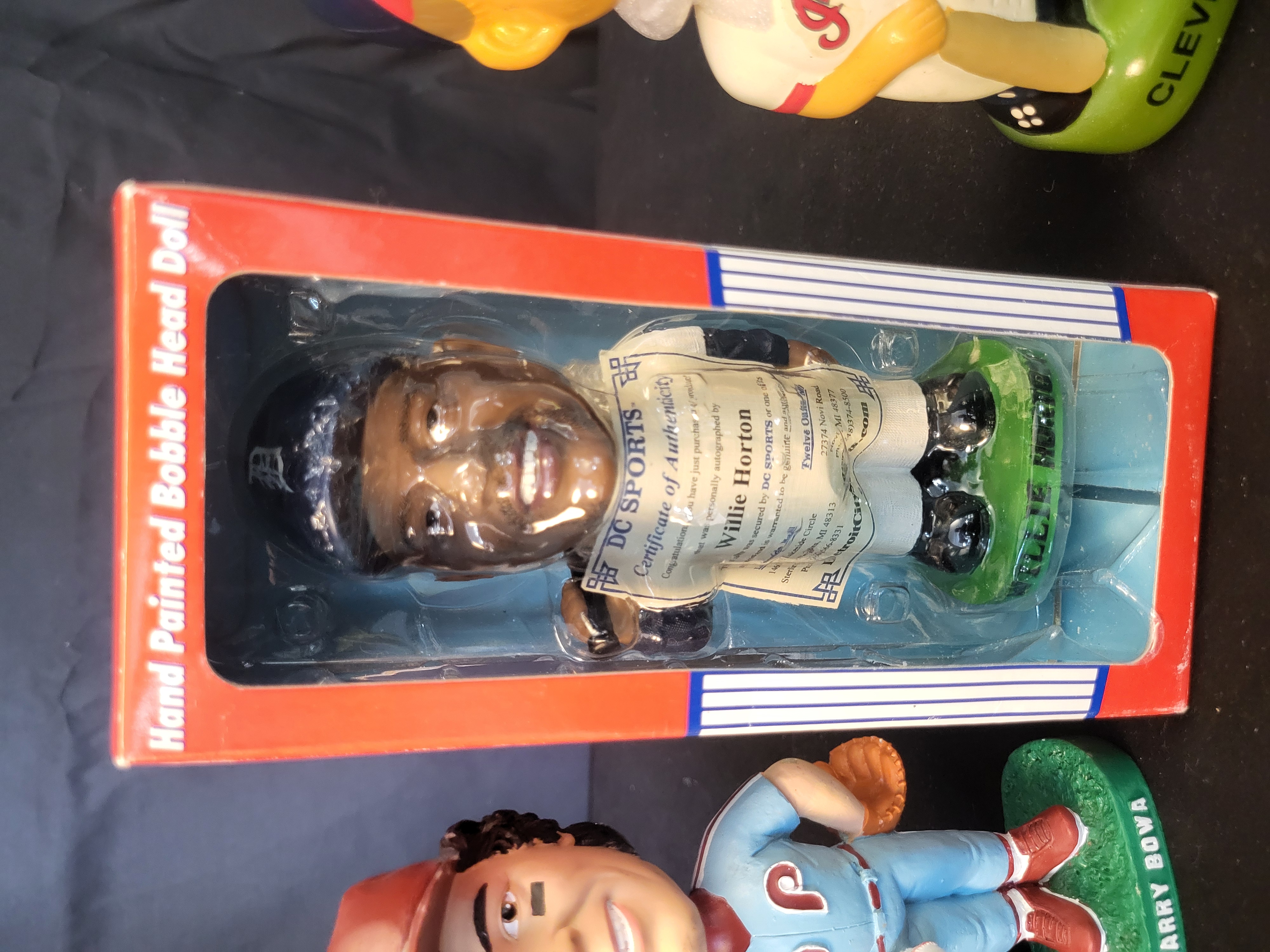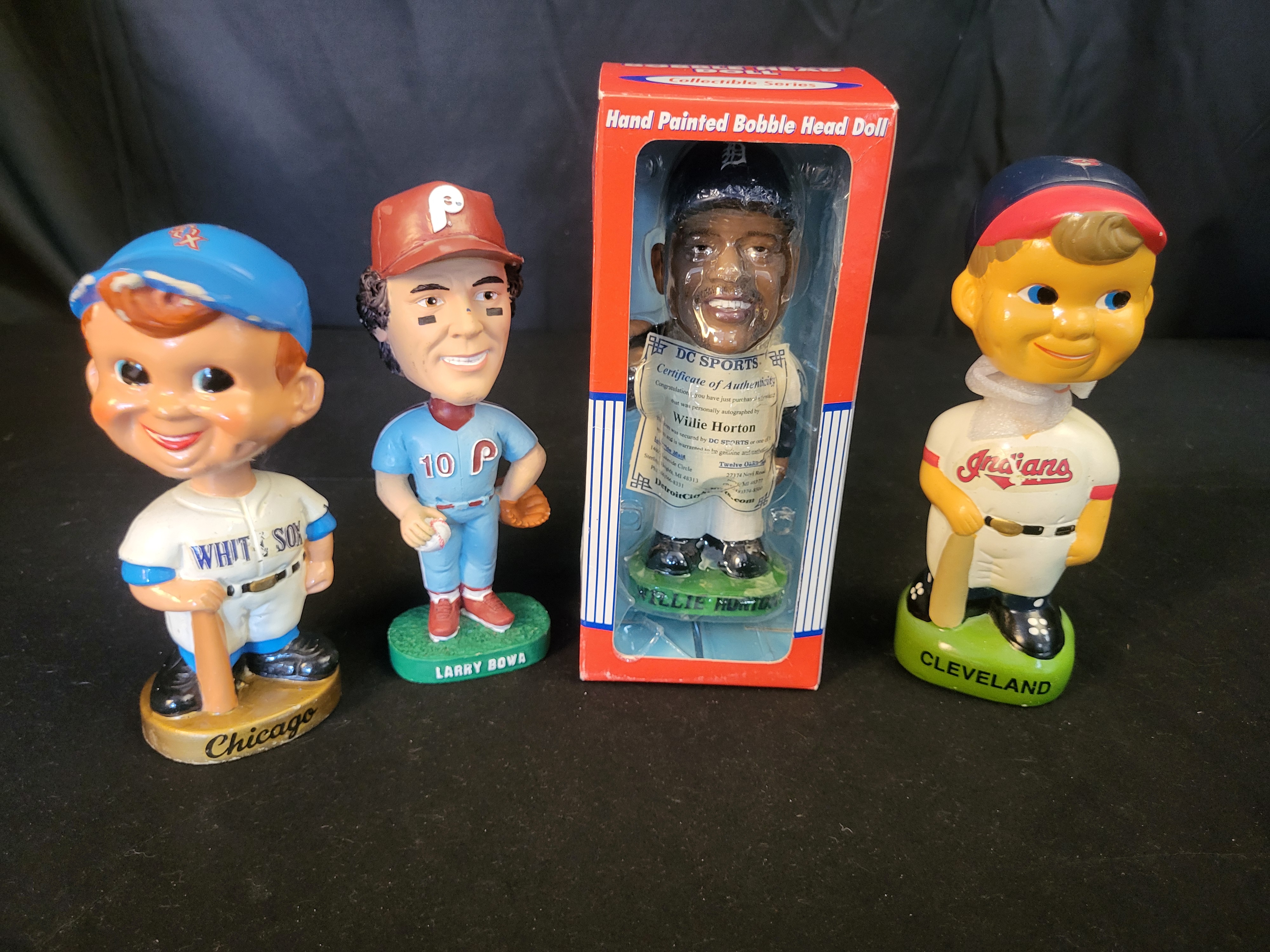 A collection of Major League Baseball bobblehead figures featuring various players and team styles. The assortment includes a vintage-style Chicago White Sox figure on a gold-tone base marked Chicago, a Larry Bowa figure in a Philadelphia Phillies away uniform on a green base marked Larry Bowa, and a vintage-style Cleveland Indians figure on a green base marked Cleveland. The collection further includes a Willie Horton Detroit Tigers figure, housed in its original red and white retail box titled Hand Painted Bobble Head Doll. This figure is accompanied by a certificate of authenticity from DC Sports visible through the packaging. The figures are composed of painted ceramic or resin. The packaging displays official MLB Genuine Merchandise and MLBPA licensing logos.