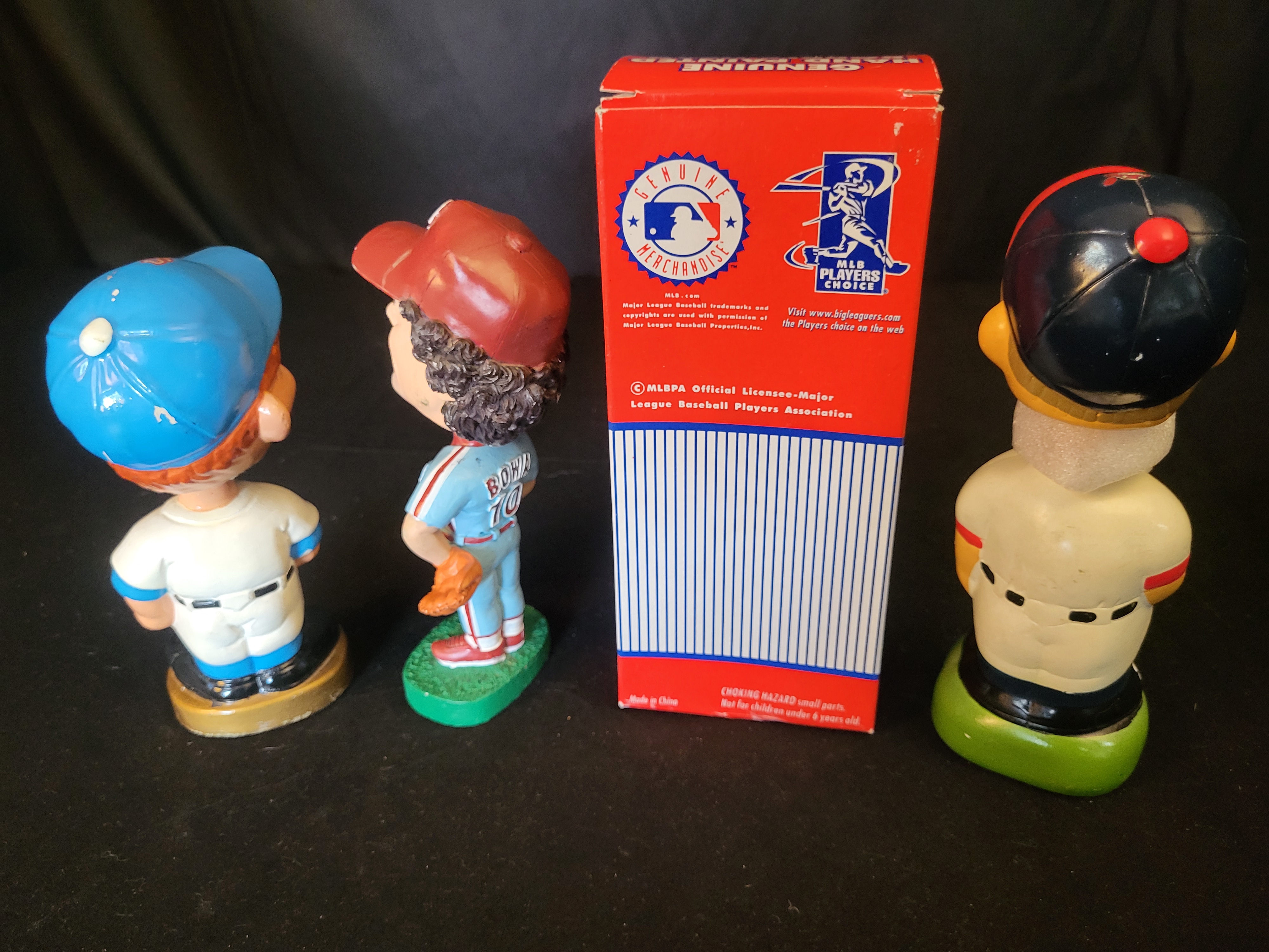 The unboxed figures exhibit minor surface wear and scattered paint loss consistent with age and handling. The Larry Bowa figure shows light surface wear. The boxed Willie Horton figure is in new, unused condition. The retail packaging shows minor shelf wear.