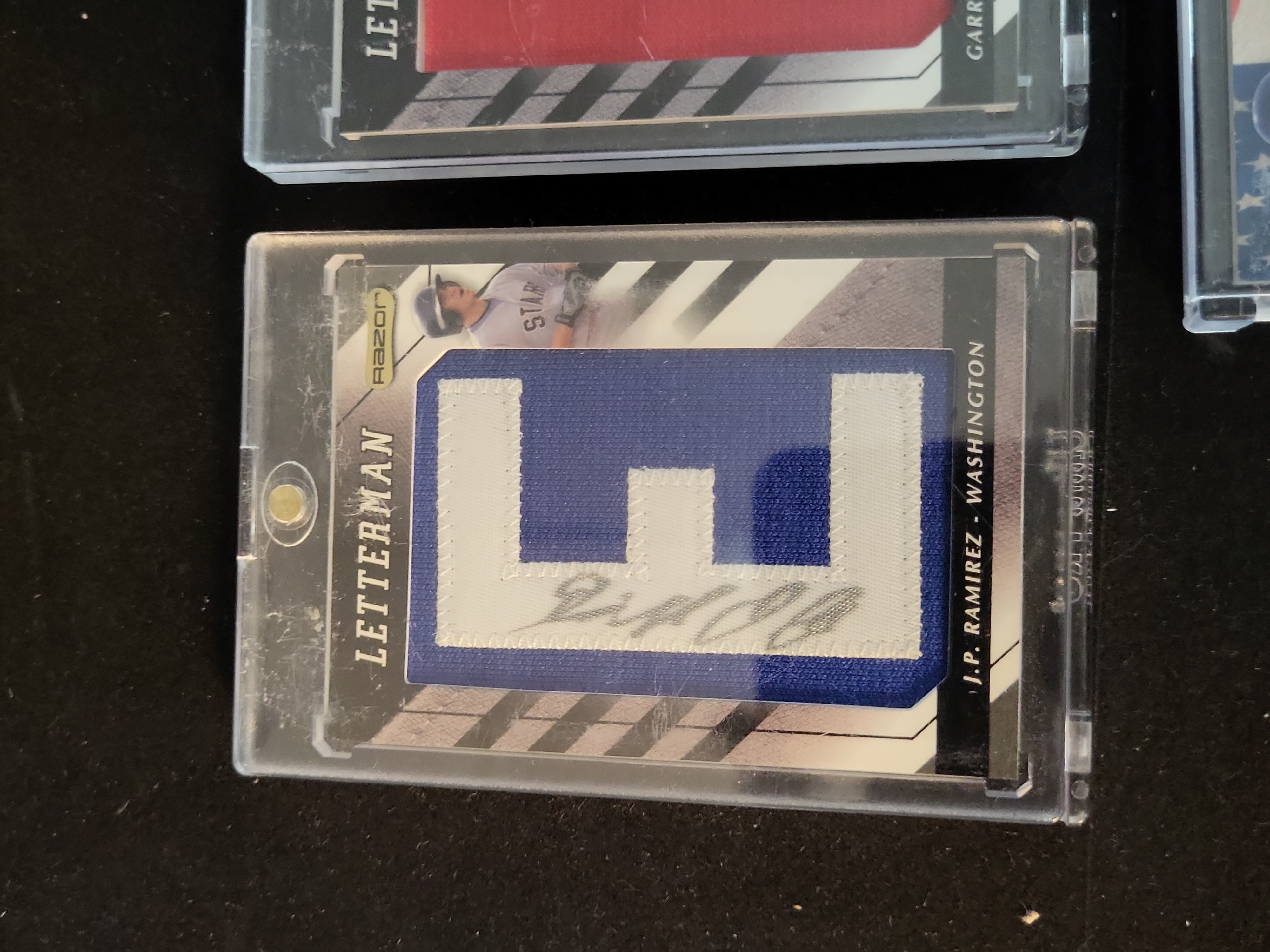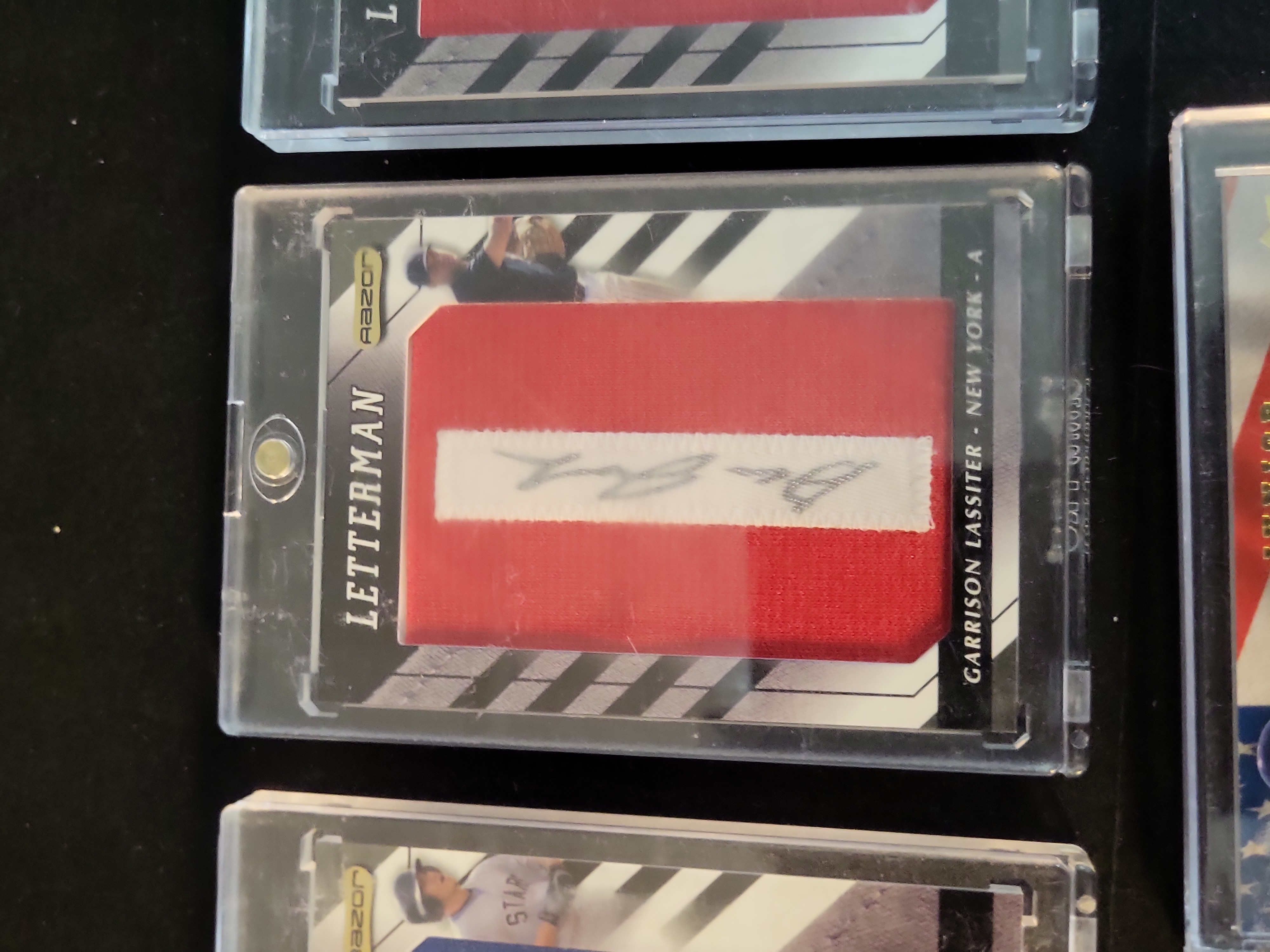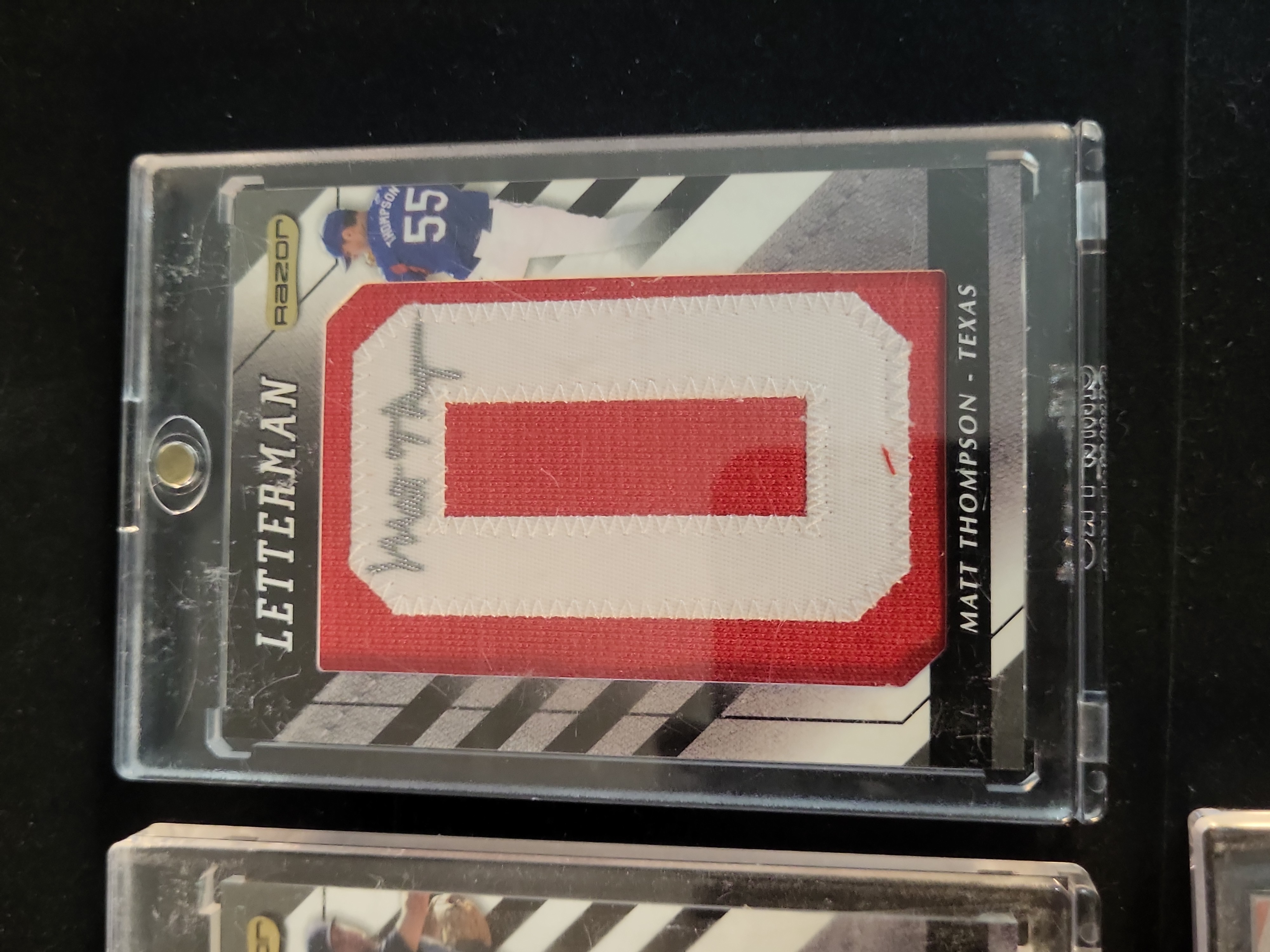 All cards in this collection are ungraded. The three Razor Letterman cards are housed in magnetic one-touch holders. While the holders show surface scratching and some internal dust, the cards appear to be in Near Mint condition with sharp corners and clean edges visible through the plastic. The Matt Thompson holder has minor exterior scuffing. The Kyle Skipworth card is housed in a screw-down protector that exhibits significant surface scratching. The Skipworth card itself has a visible small brown stain or mark on the bottom left corner of the front surface near the player\'s leg. Centering on all cards appears within standard manufacturing tolerances for the respective sets.