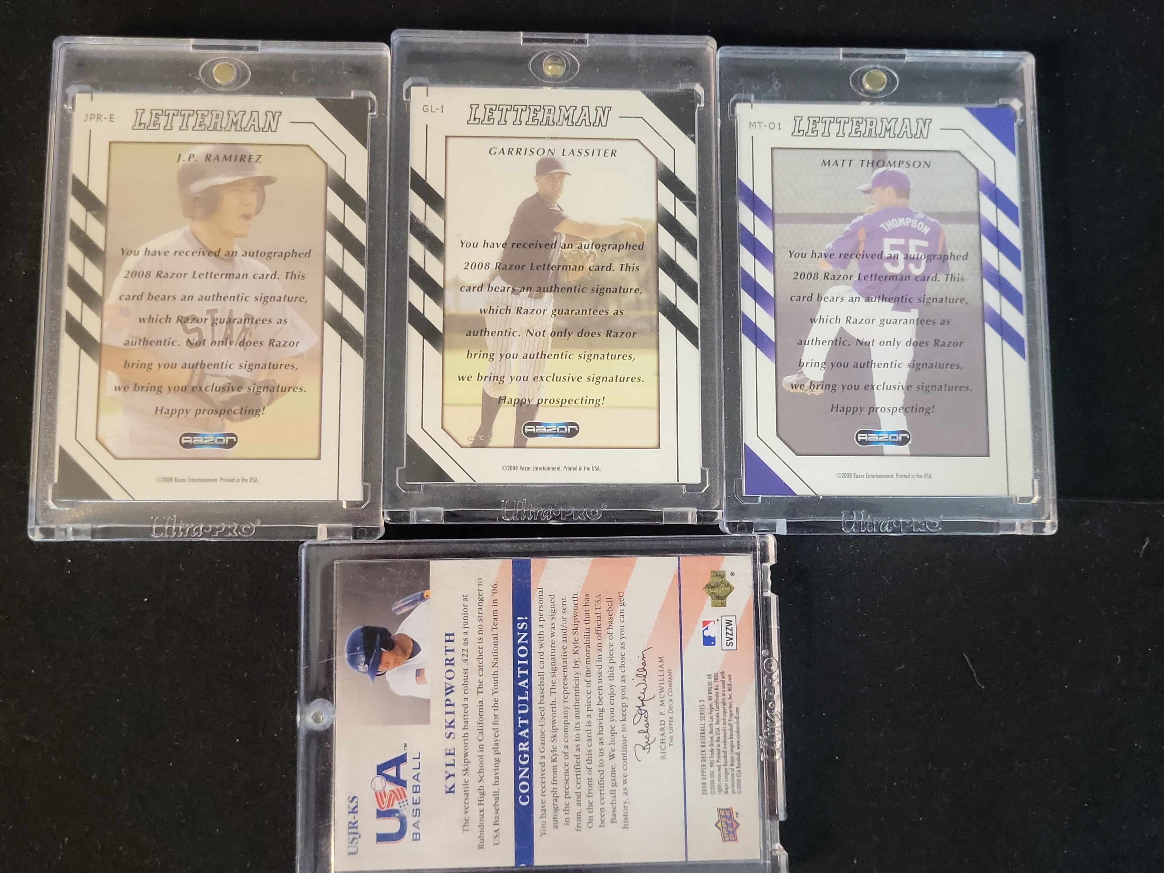 BID PER WHAT YOU SEE IN THE PHOTO, NOT THE AI GENERATED TITLES AND DESCRIPTIONS! 2008 Razor Letterman and Upper Deck USA Baseball Autograph Jersey Card Collection 4 Cards