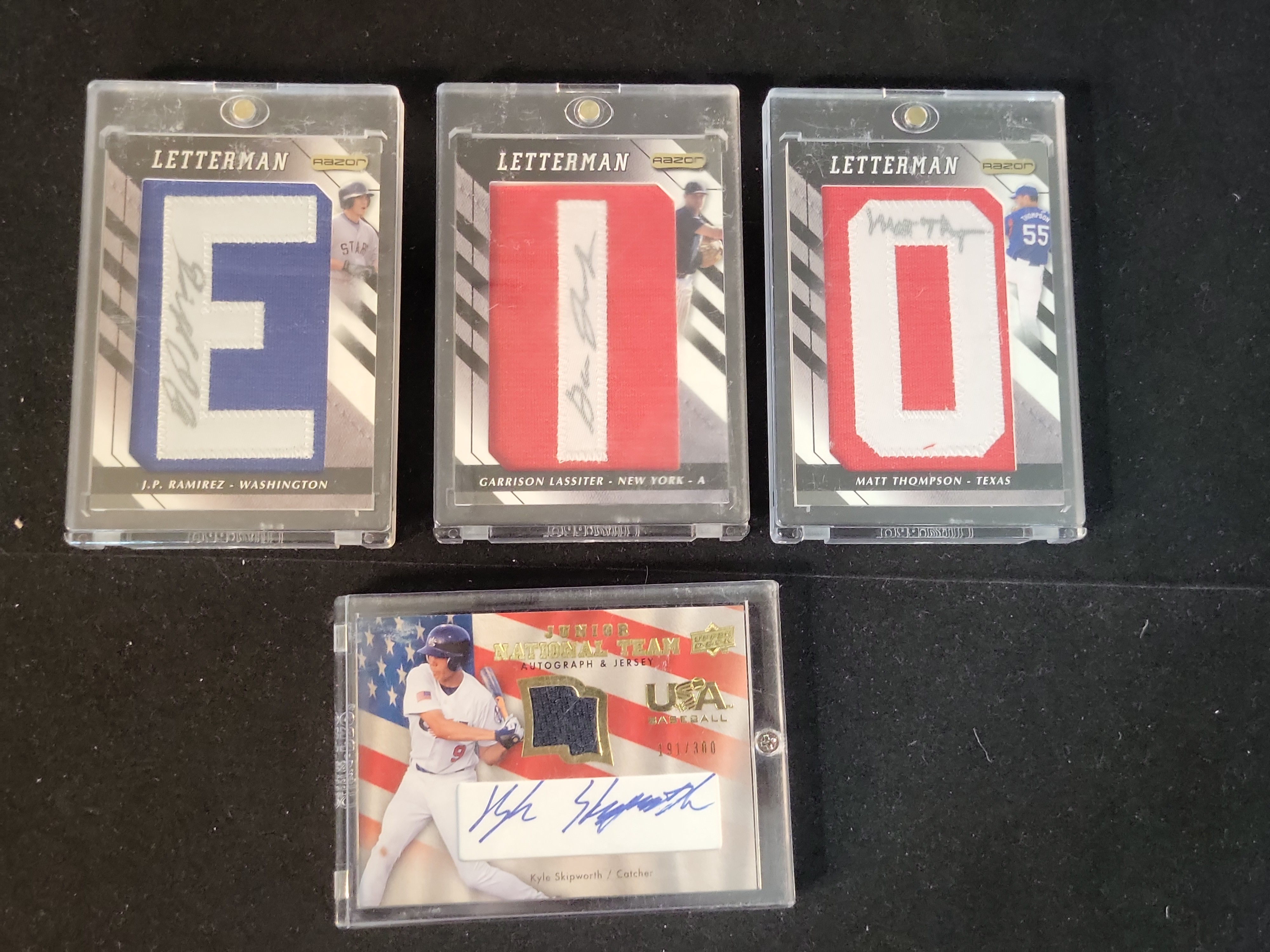 This collection features four autographed memorabilia cards from the 2008 season, highlighting prominent prospects of the era. The lot includes three cards from the 2008 Razor Letterman series and one limited edition card from 2008 Upper Deck USA Baseball Series 2. The Razor Letterman cards feature manufactured jersey letters with authentic autographs signed directly onto the fabric of the patch. This set includes J.P. Ramirez (Washington) card number JPR-E featuring the letter E, Garrison Lassiter (New York – A) card number GL-I featuring the letter I, and Matt Thompson (Texas) card number MT-O1 featuring a double-layered letter O. The fourth card is a Kyle Skipworth (Catcher) Junior National Team Autograph and Jersey card from Upper Deck USA Baseball Series 2, card number USJR-KS. This card is a limited edition serial numbered 191/300 and features a blue ink sticker autograph alongside a navy blue game-used jersey swatch set within a flag-shaped window. The Skipworth card includes a gold foil design and an Upper Deck hologram (SVZZW) on the reverse.