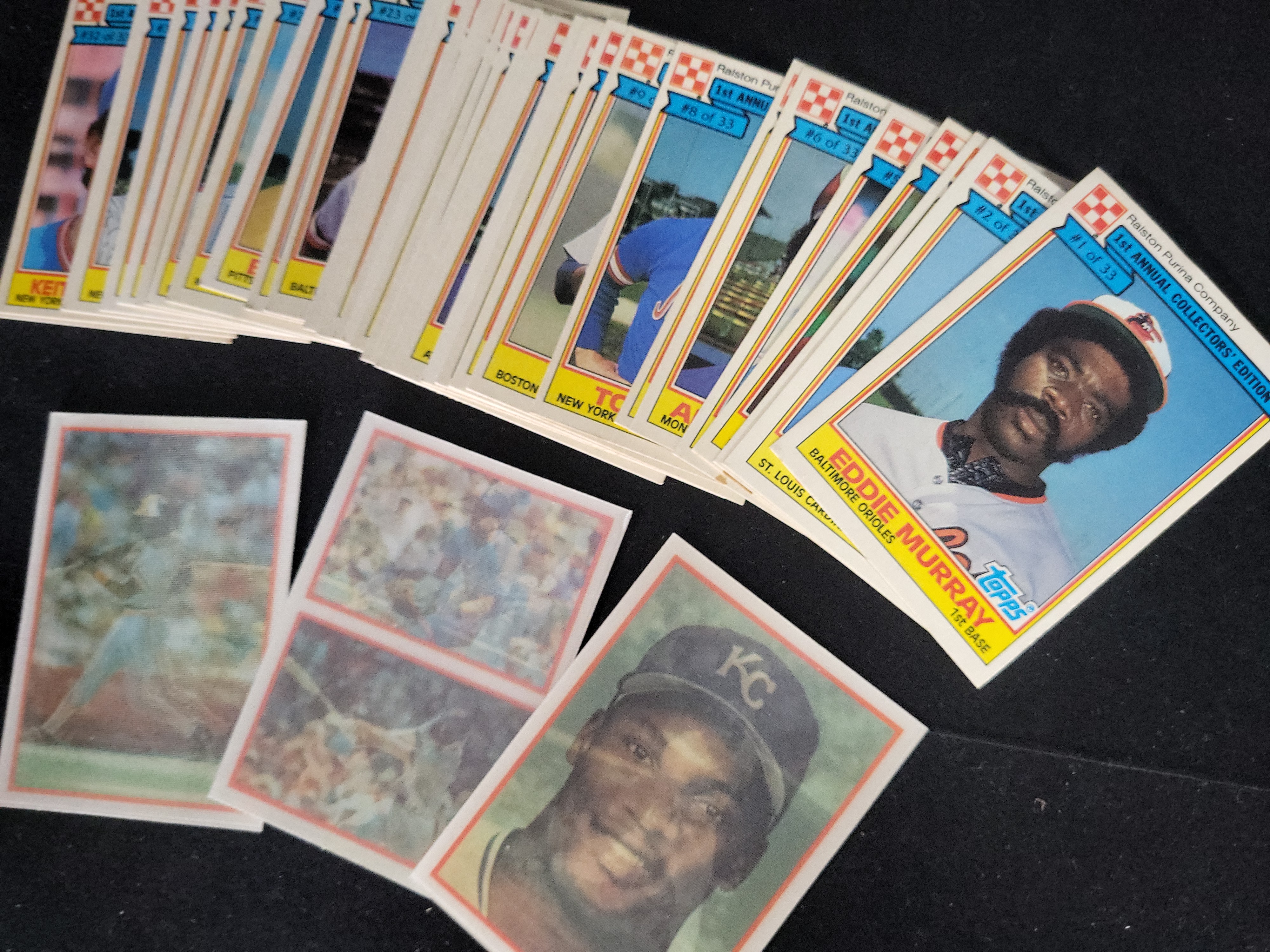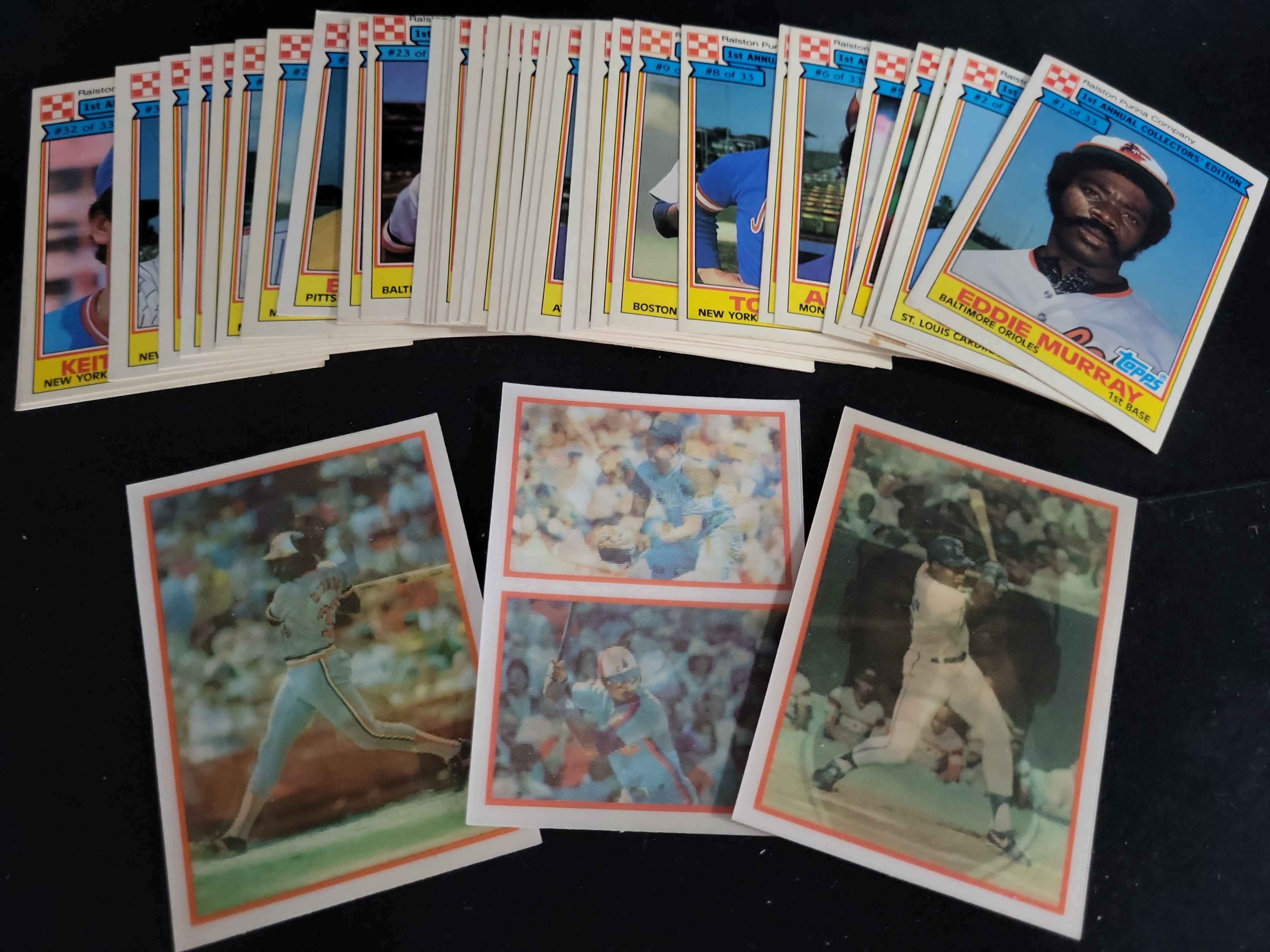 All items are in raw, ungraded condition. The Fleer basketball sheet shows visible horizontal and vertical creases from folding and minor edge wear. The 1985 Topps Hershiser rookie card is off-center to the right with soft corners. The 1984 Ralston Purina Eddie Murray card features 45/55 centering and minor edge white-out. Remaining loose cards range from fair to good condition, while cards in top-loaders generally exhibit sharper corners.