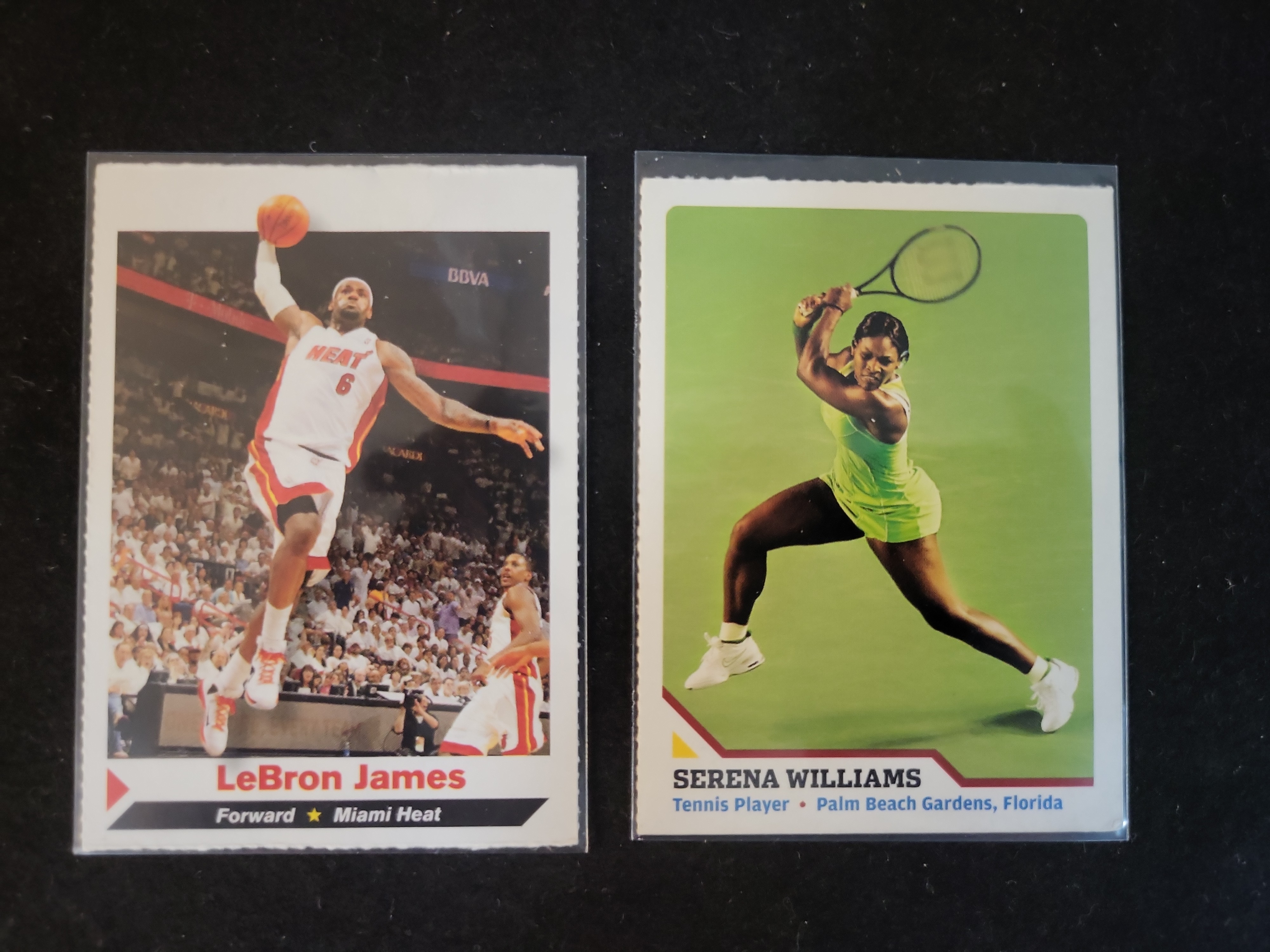 LeBron James: Centering favored right; top corners perforated, bottom sharp; top edge perforated, others clean. Serena Williams: Centering shifted top; top corners perforated, bottom sharp; top edge perforated, others clean. Both cards are raw with well-preserved surfaces.