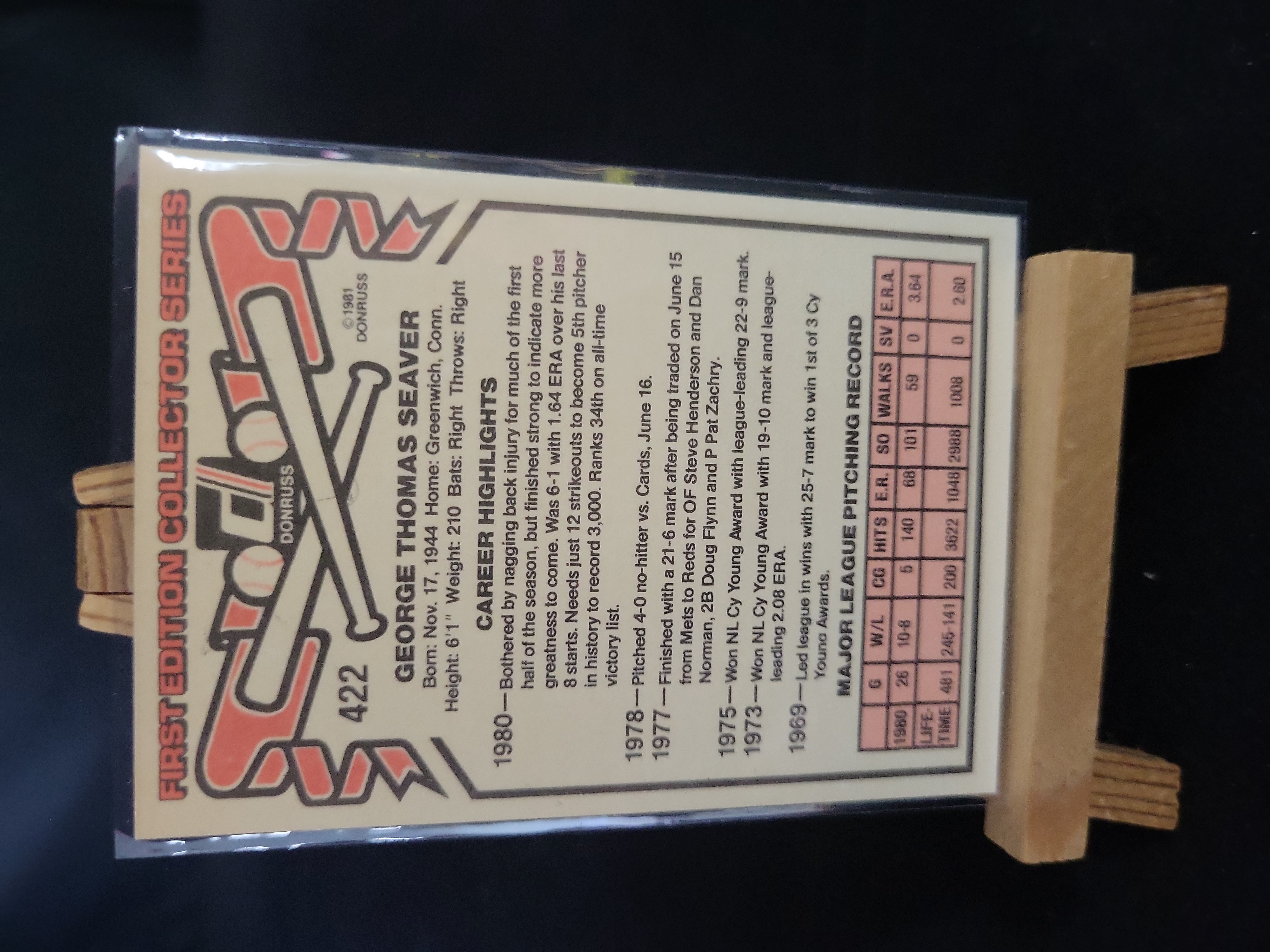 Brand: Donruss. Year: 1981. Set: First Edition Collector Series. Card Number: 422. Player: Tom Seaver. Rookie Status: No. Parallel Type: Base Card. Certification: Raw (Ungraded).
