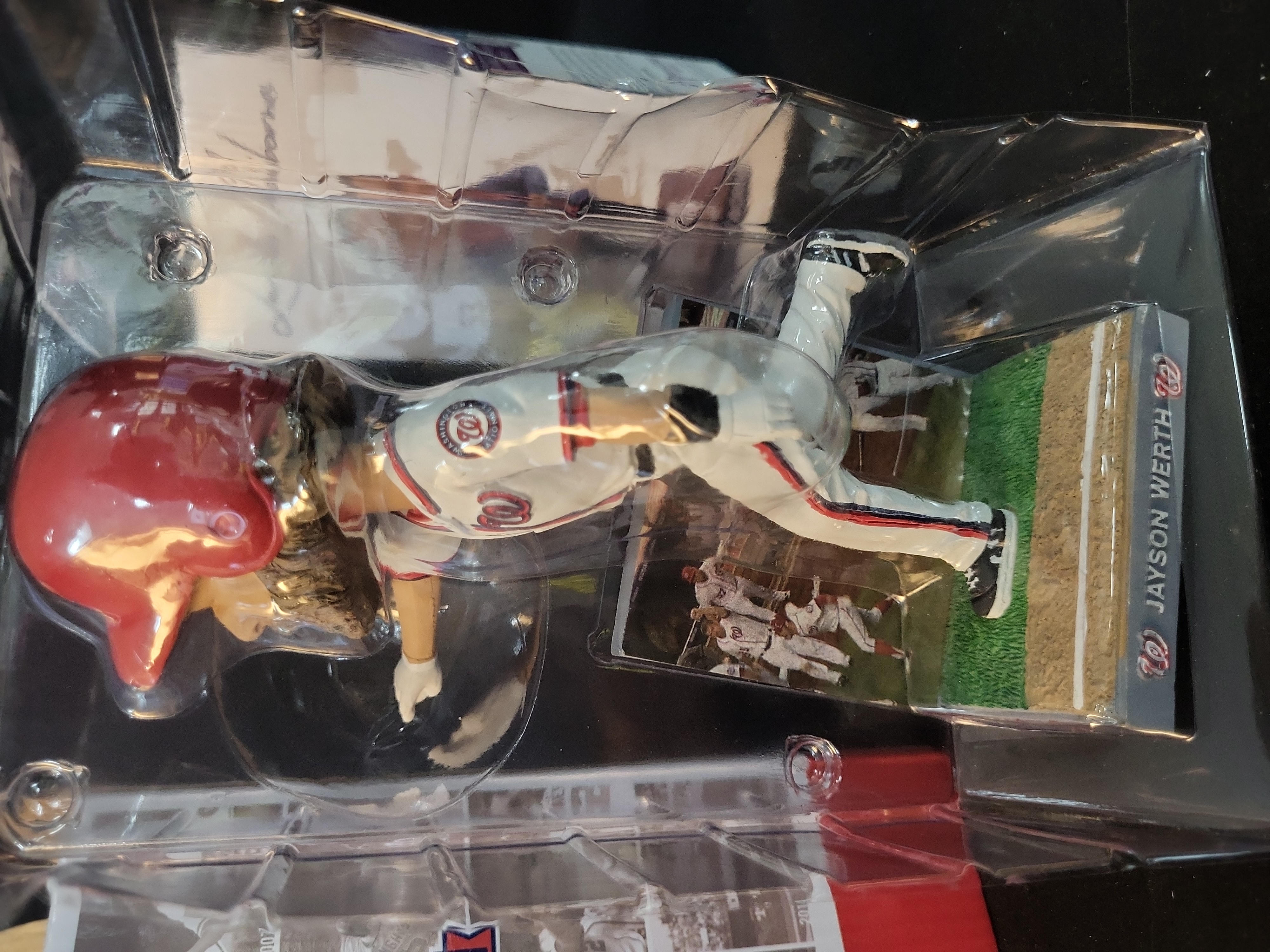 The bobbleheads are in unused condition and remain in their original packaging. The boxes show light shelf wear and minor corner blunting, with a crease present on the Jayson Werth box. The Bluefield Barons cap shows no significant wear, staining, or damage.