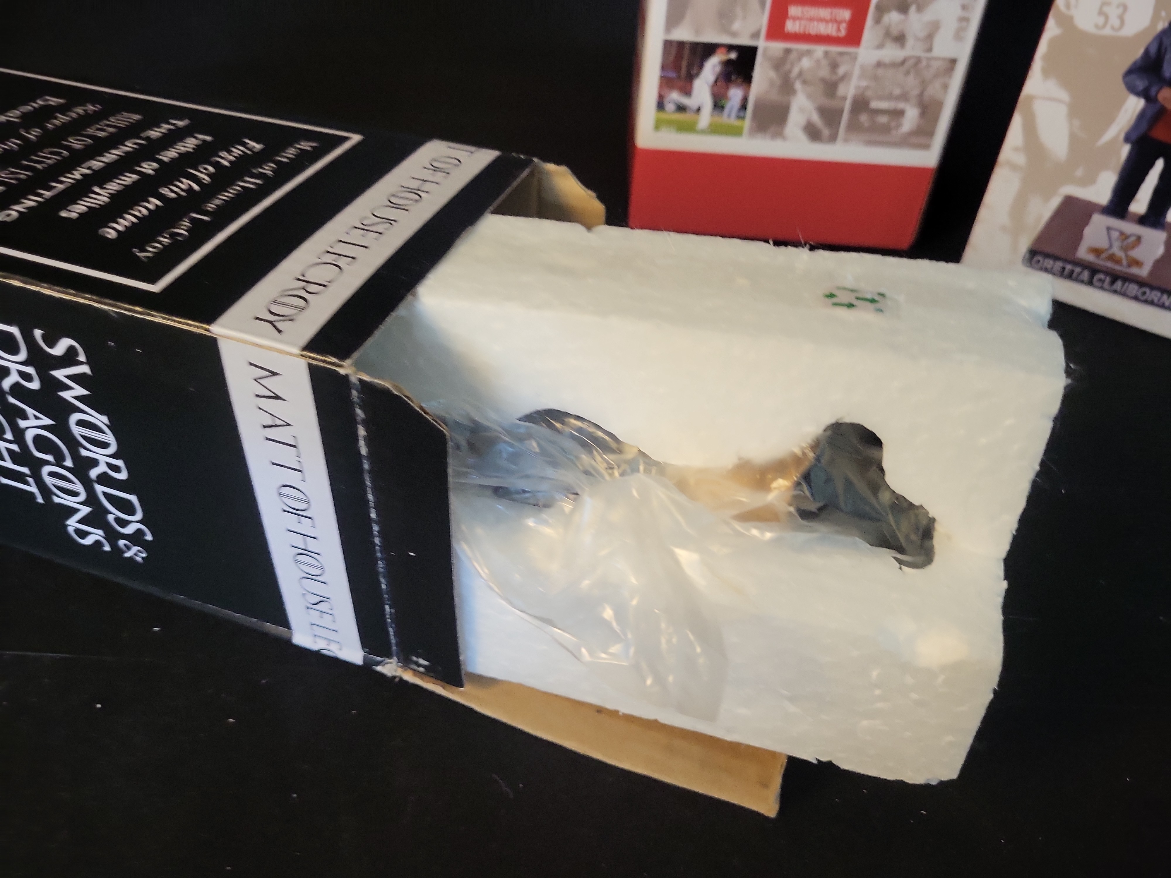 This collection contains four items of sports memorabilia focused on professional baseball and the Special Olympics. The group includes a Matt LeCroy Matt of House LeCroy promotional bobblehead issued by the Harrisburg Senators for their Swords and Dragons Night, featuring a theme inspired by Game of Thrones. Also included is a Jayson Werth Washington Nationals 10th Anniversary commemorative bobblehead (2005-2015) depicting the player in a sliding pose. The third bobblehead features world-renowned Special Olympian Loretta Claiborne, released as part of the York Revolution Celebrate York series; the box features a printed facsimile signature. The final item is a red and off-white snapback baseball cap for the Bluefield Barons featuring an embroidered team logo. All bobbleheads are contained in their original promotional boxes with internal foam or plastic housing.