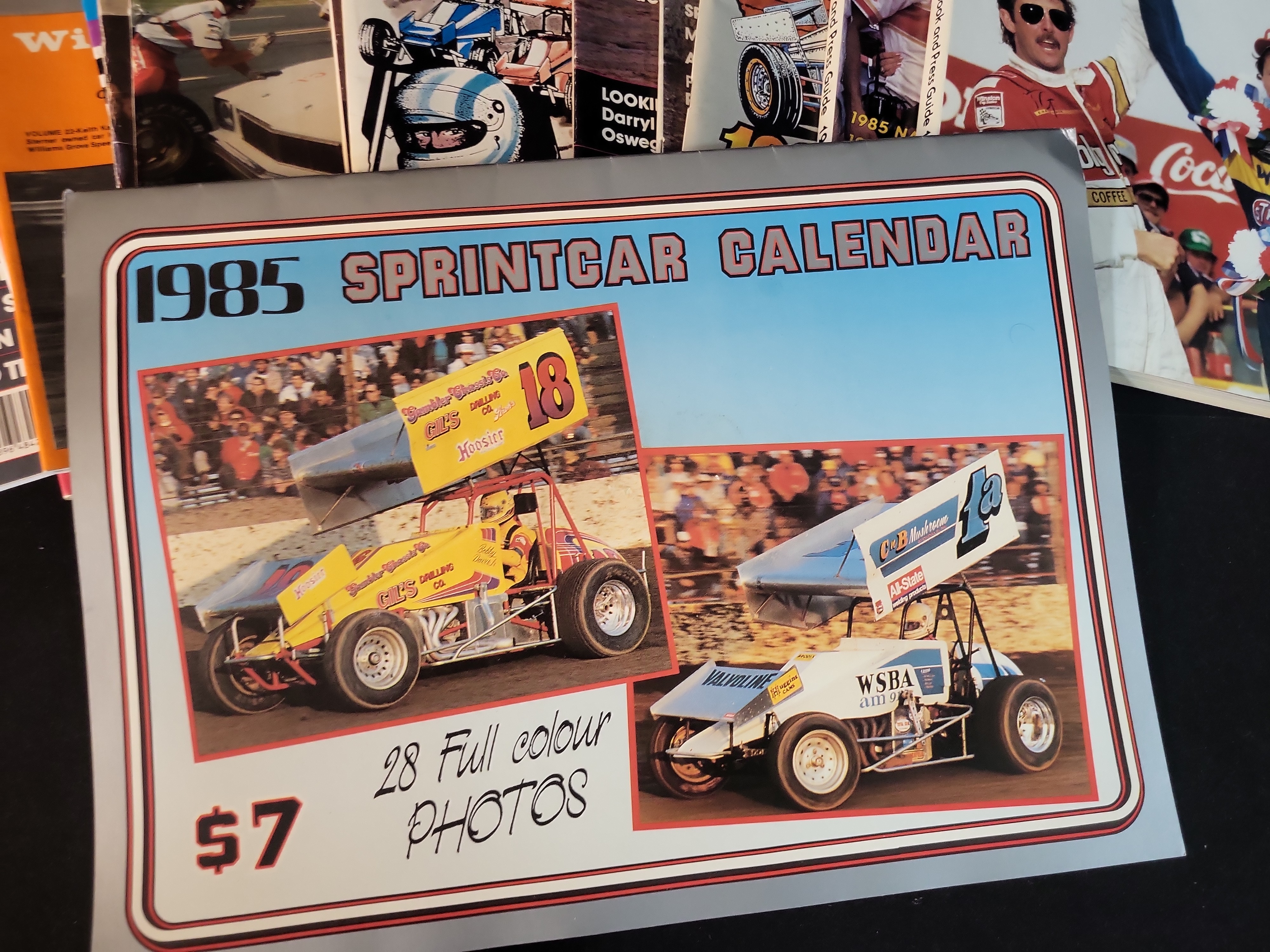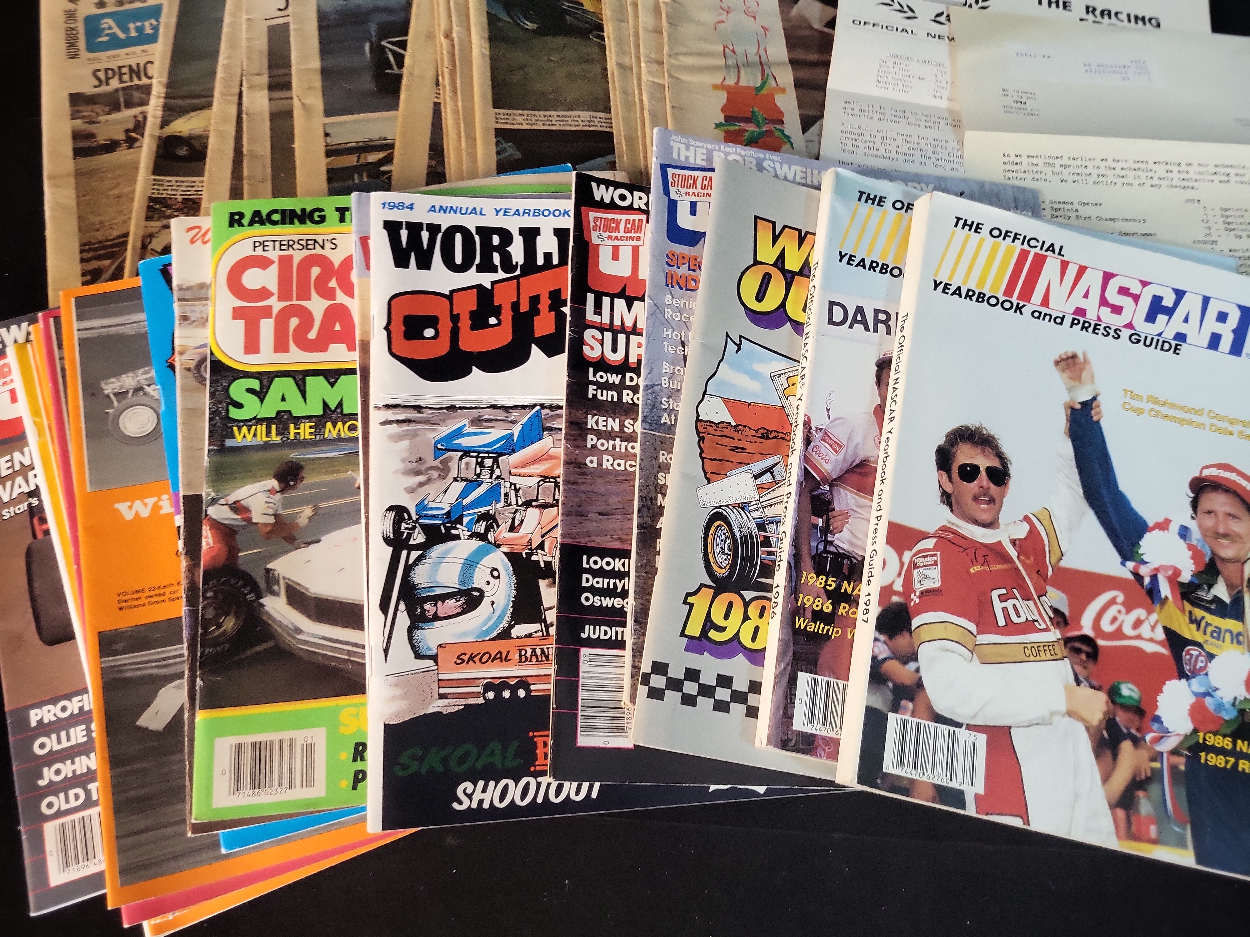 This professional collection of mid-1980s motorsports memorabilia features a diverse array of NASCAR, World of Outlaws, and Sprint Car racing publications. Key highlights include The Official NASCAR Yearbook and Press Guide for 1987 (featuring Dale Earnhardt and Tim Richmond) and 1986 (featuring Darrell Waltrip). The lot contains the 1984 World of Outlaws Annual Yearbook and a 1985 Sprintcar Calendar featuring Bobby Davis Jr. in the number 18 car. Magazines include the January 1984 issue of Petersen’s Circle Track with Sammy Swindell and the January 1985 issue of Stock Car Racing featuring Ken Schrader. Additionally, the lot includes a significant stack of Area Auto Racing News newspapers and United Racing Club (URC) official news sheets. All driver images and names are part of the original printed publications; there are no hand-signed autographs included in this lot.