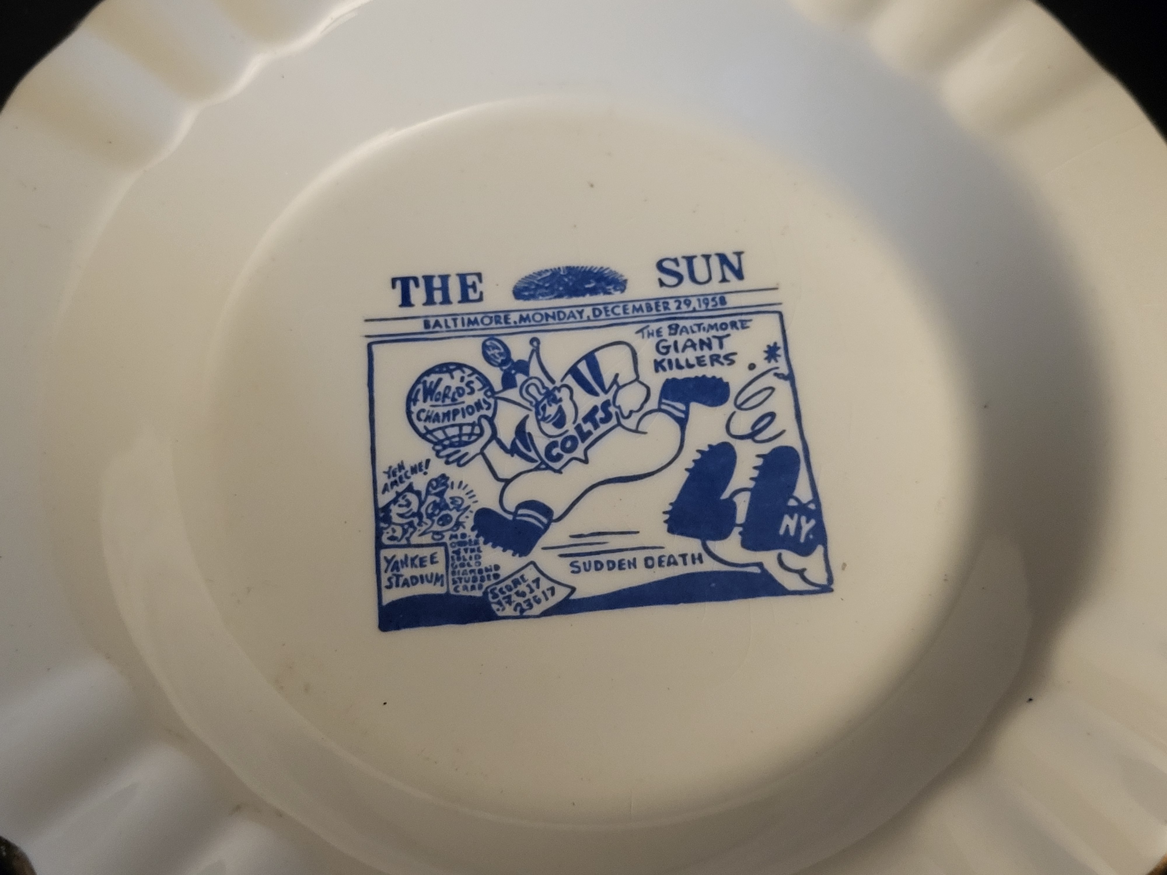 This pair of commemorative ceramic items includes a mug and an ashtray honoring the Baltimore Colts. The white ceramic mug is decorated with a blue Baltimore Colts logo featuring a horse and football motif. The white ceramic ashtray features a blue transfer-print editorial cartoon from The Sun newspaper dated December 29, 1958, commemorating the 1958 NFL Championship victory over the New York Giants at Yankee Stadium. The cartoon includes text such as World’s Champions, Sudden Death, and The Baltimore Giant Killers. The ashtray is finished with a gold-toned rim and bears a backstamp on the reverse reading The Sabina Line, Warranted 22 karat gold, Made in U.S.A.