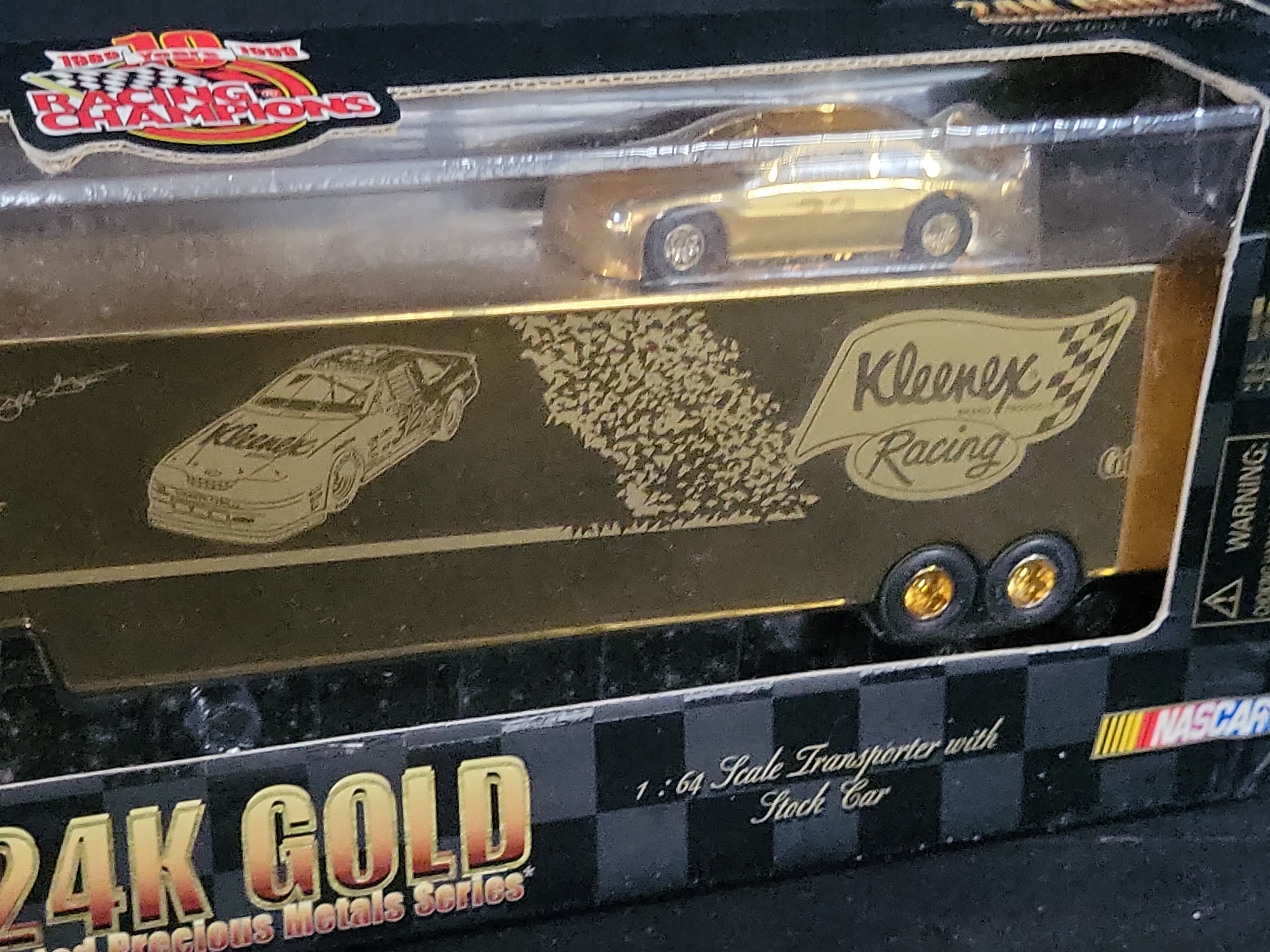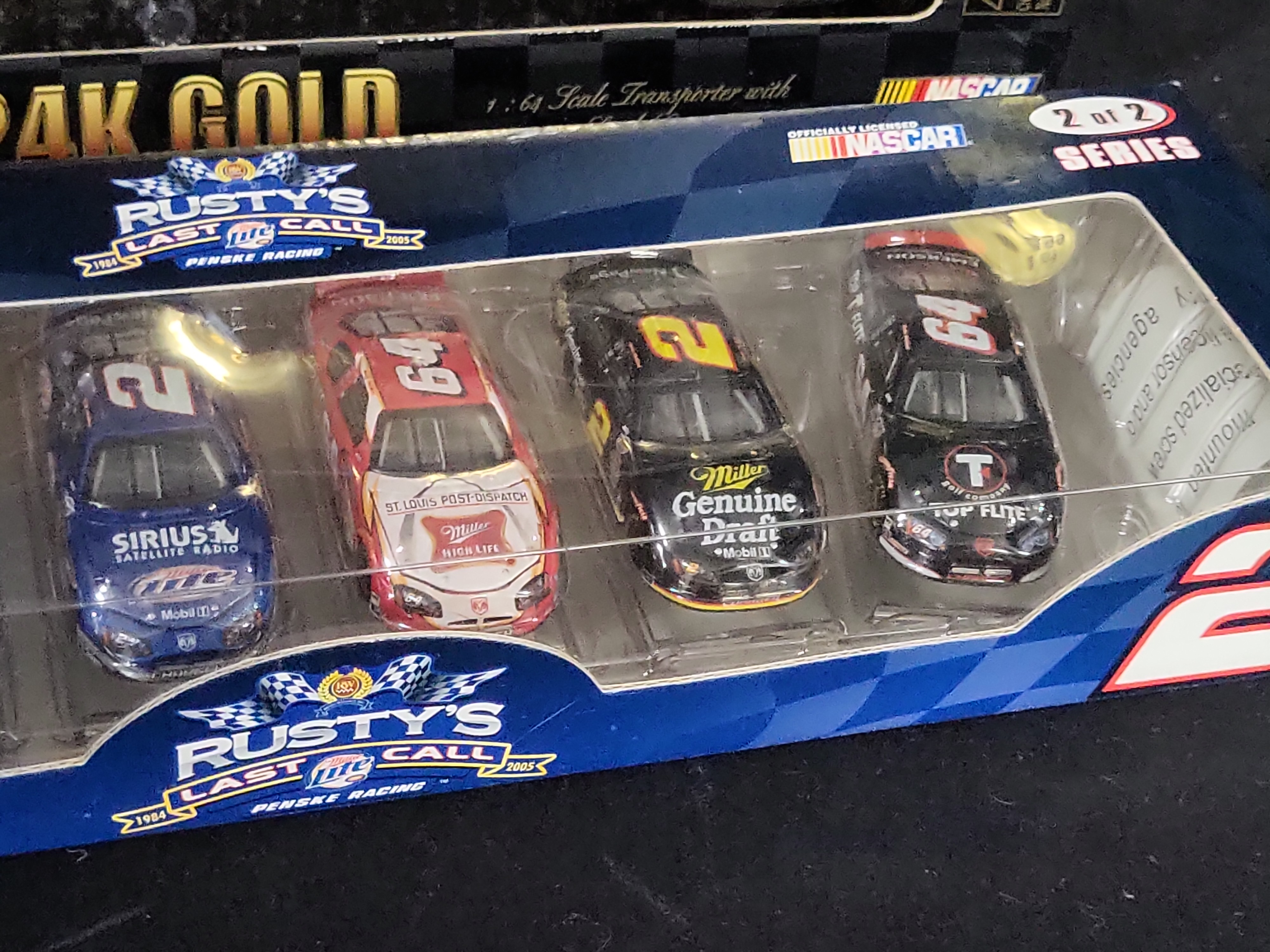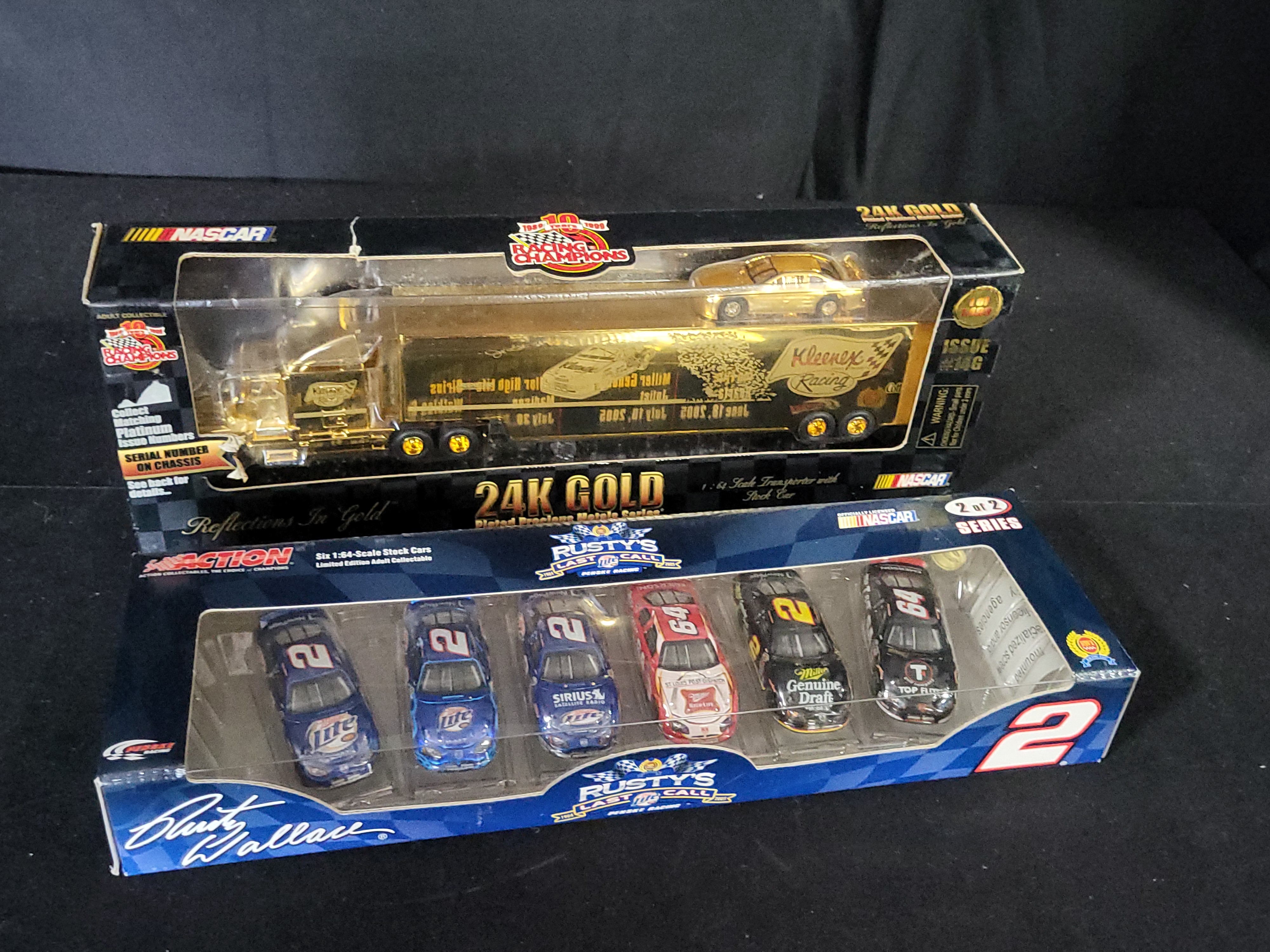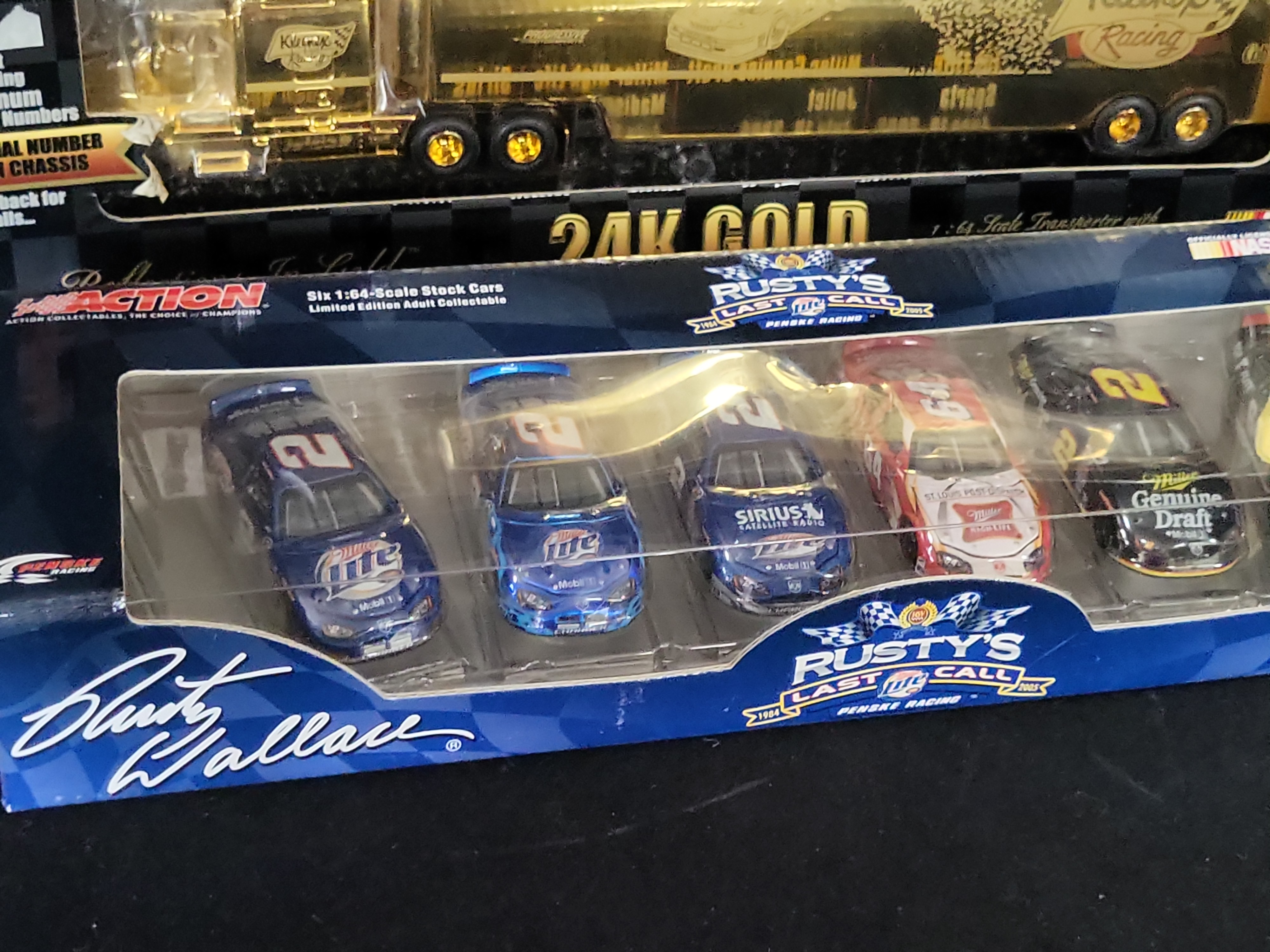 Racing Champions and Action Collectables. This lot features two 1:64 scale die-cast NASCAR sets in their original factory window boxes. The first set is a Racing Champions 24K Gold Plated Precious Metals Series Reflections in Gold 10th Anniversary Edition (1989-1999), Issue number 146. This set includes a transporter tractor-trailer and a matching stock car, both featuring Kleenex Racing number 32 graphics. The manufacturer states the transporter cab, hauler body, and stock car body are 24 karat gold plated. The second set is an Action Collectables Rustys Last Call Penske Racing commemorative 6-car set, Series 2 of 2, honoring Rusty Wallaces final racing season. This set includes six die-cast stock cars with various career paint schemes including Miller Lite, Sirius Satellite Radio, Miller High Life/St. Louis Post-Dispatch, Miller Genuine Draft, and Top Flite.