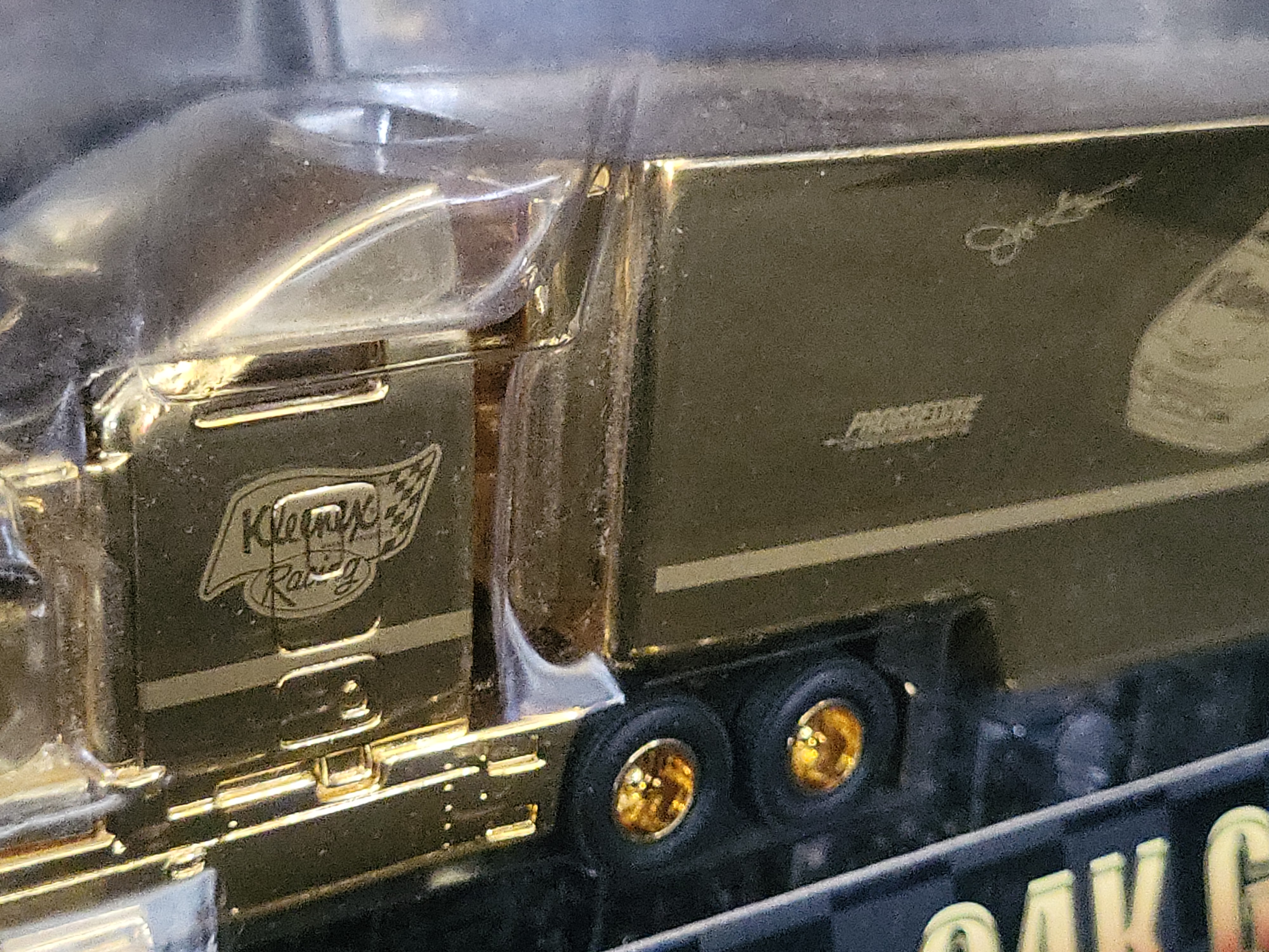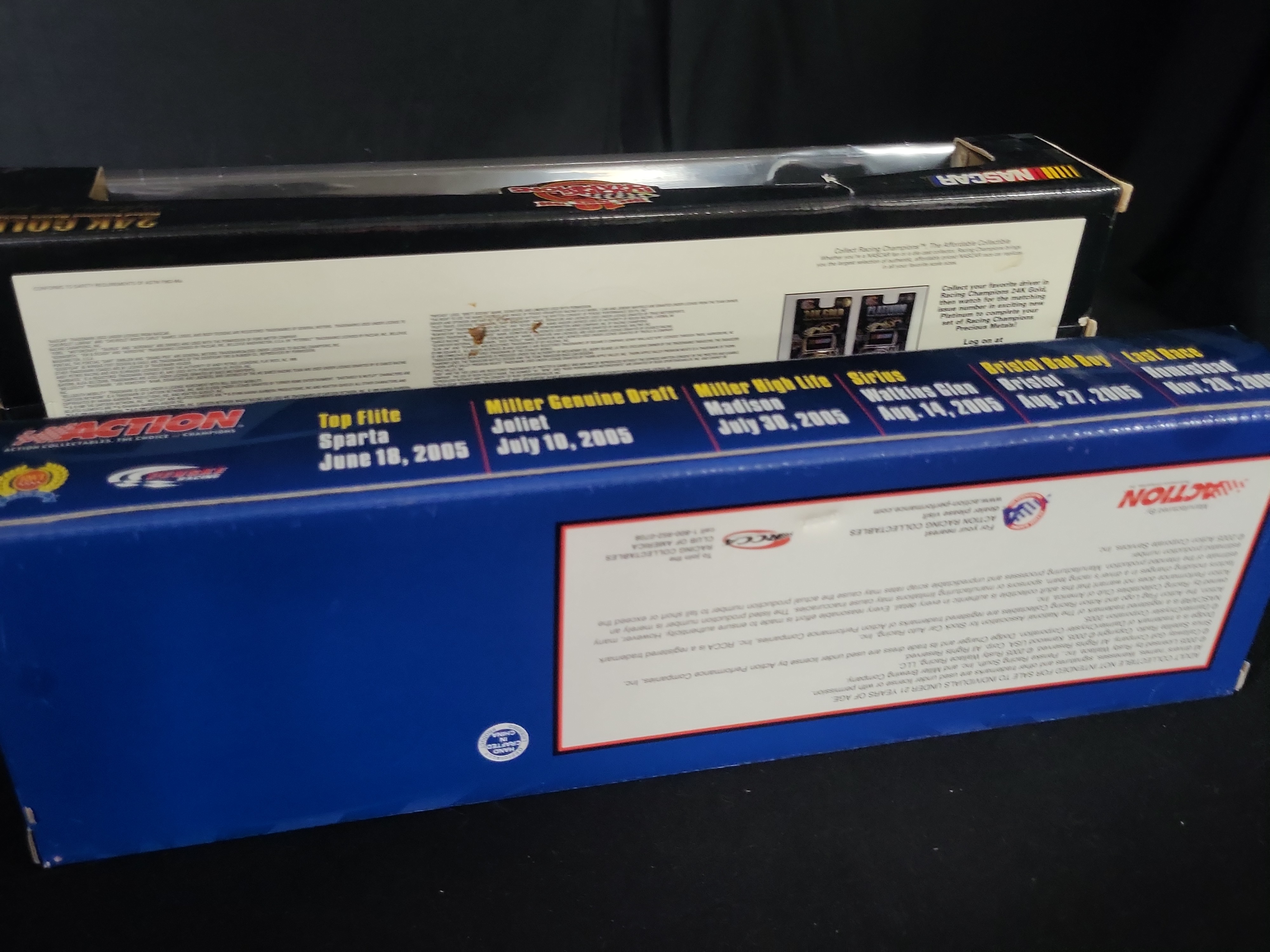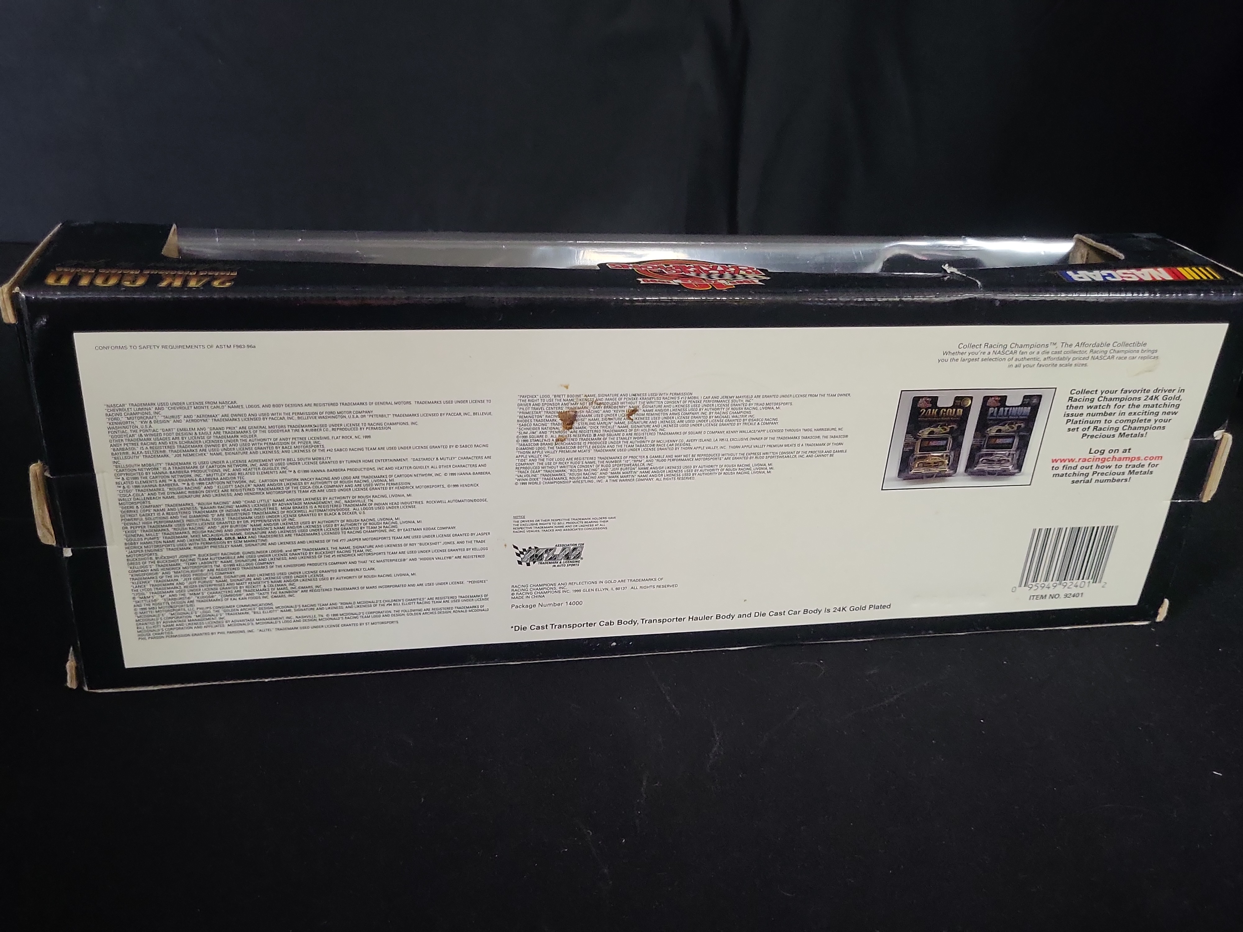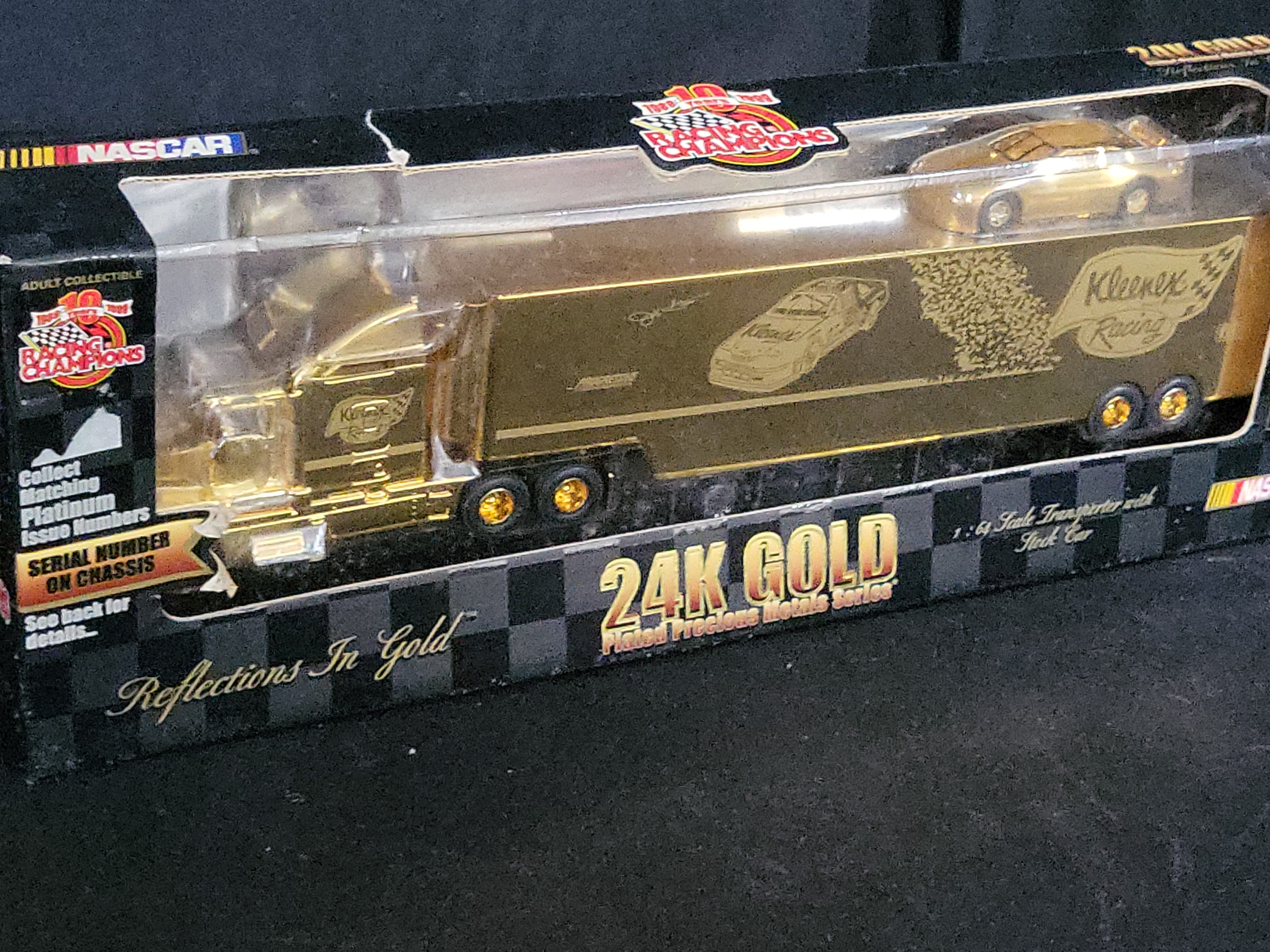 Racing Champions and Action Collectables. This lot features two 1:64 scale die-cast NASCAR sets in their original factory window boxes. The first set is a Racing Champions 24K Gold Plated Precious Metals Series Reflections in Gold 10th Anniversary Edition (1989-1999), Issue number 146. This set includes a transporter tractor-trailer and a matching stock car, both featuring Kleenex Racing number 32 graphics. The manufacturer states the transporter cab, hauler body, and stock car body are 24 karat gold plated. The second set is an Action Collectables Rustys Last Call Penske Racing commemorative 6-car set, Series 2 of 2, honoring Rusty Wallaces final racing season. This set includes six die-cast stock cars with various career paint schemes including Miller Lite, Sirius Satellite Radio, Miller High Life/St. Louis Post-Dispatch, Miller Genuine Draft, and Top Flite.
