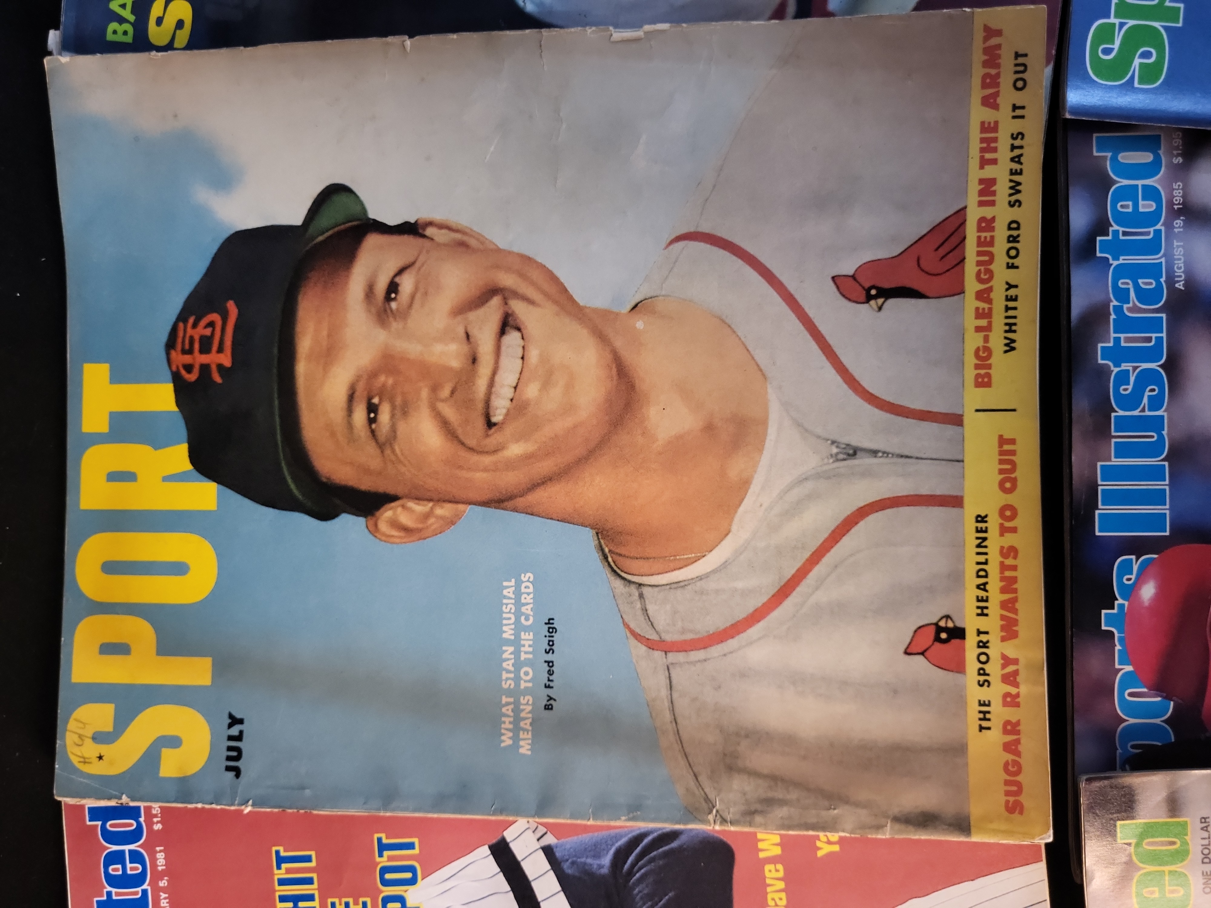 The magazines are in varied vintage condition ranging from Fair to Very Good. The 1953 SPORT magazine exhibits the most significant age-related wear, including heavy surface creasing, scuffing, and edge wear. The Sports Illustrated issues show typical handling wear, corner blunting, and shelf wear. Several issues retain original mailing subscription labels or small inventory stickers on the covers. No third-party authentication is present as the items are unsigned.