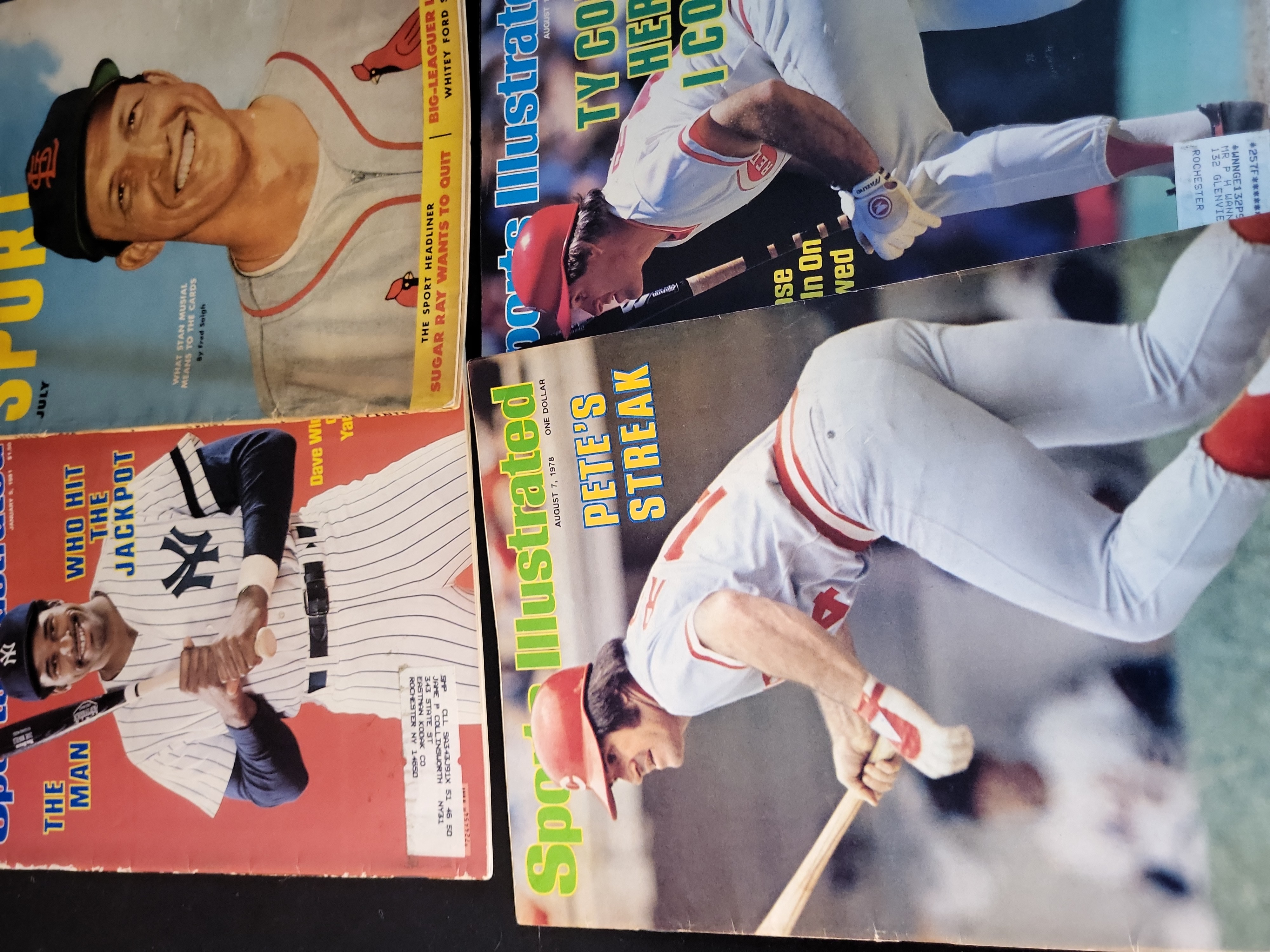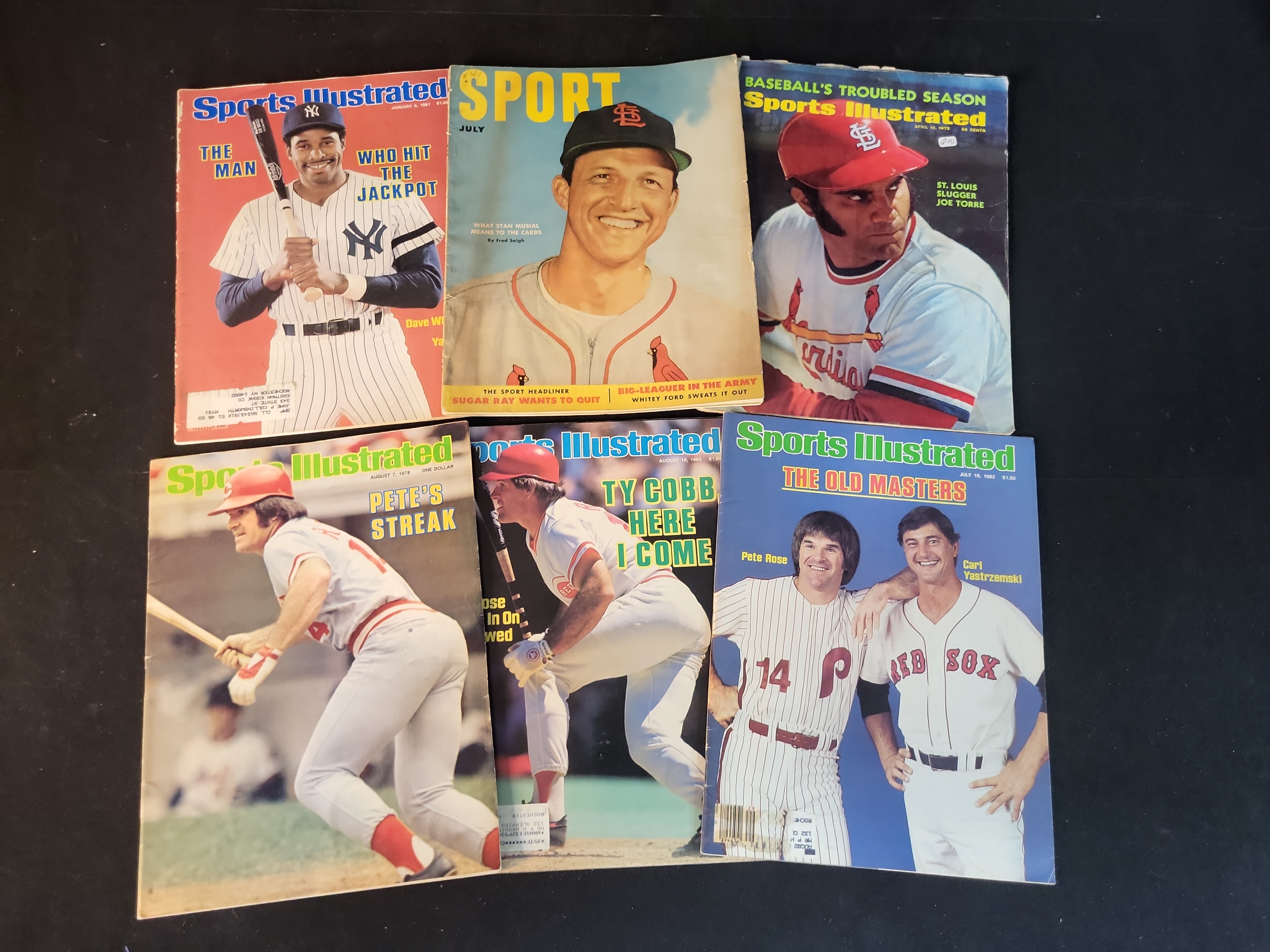 This lot features a collection of six vintage baseball magazines spanning 1953 to 1985, documenting several eras of Major League Baseball history. The collection is anchored by a July 1953 issue of SPORT Magazine featuring Hall of Famer Stan Musial of the St. Louis Cardinals, which includes articles on Sugar Ray Robinson and Whitey Ford. The lot further includes five issues of Sports Illustrated: April 10, 1972, featuring Joe Torre (St. Louis Cardinals); August 7, 1978, featuring Pete Rose (Cincinnati Reds) during his historic hitting streak; January 5, 1981, featuring Dave Winfield (New York Yankees) regarding his record-breaking contract; July 19, 1982, featuring Pete Rose (Philadelphia Phillies) and Carl Yastrzemski (Boston Red Sox); and August 19, 1985, featuring Pete Rose (Cincinnati Reds) as he chased the all-time hit record. These are original period publications and are not autographed.