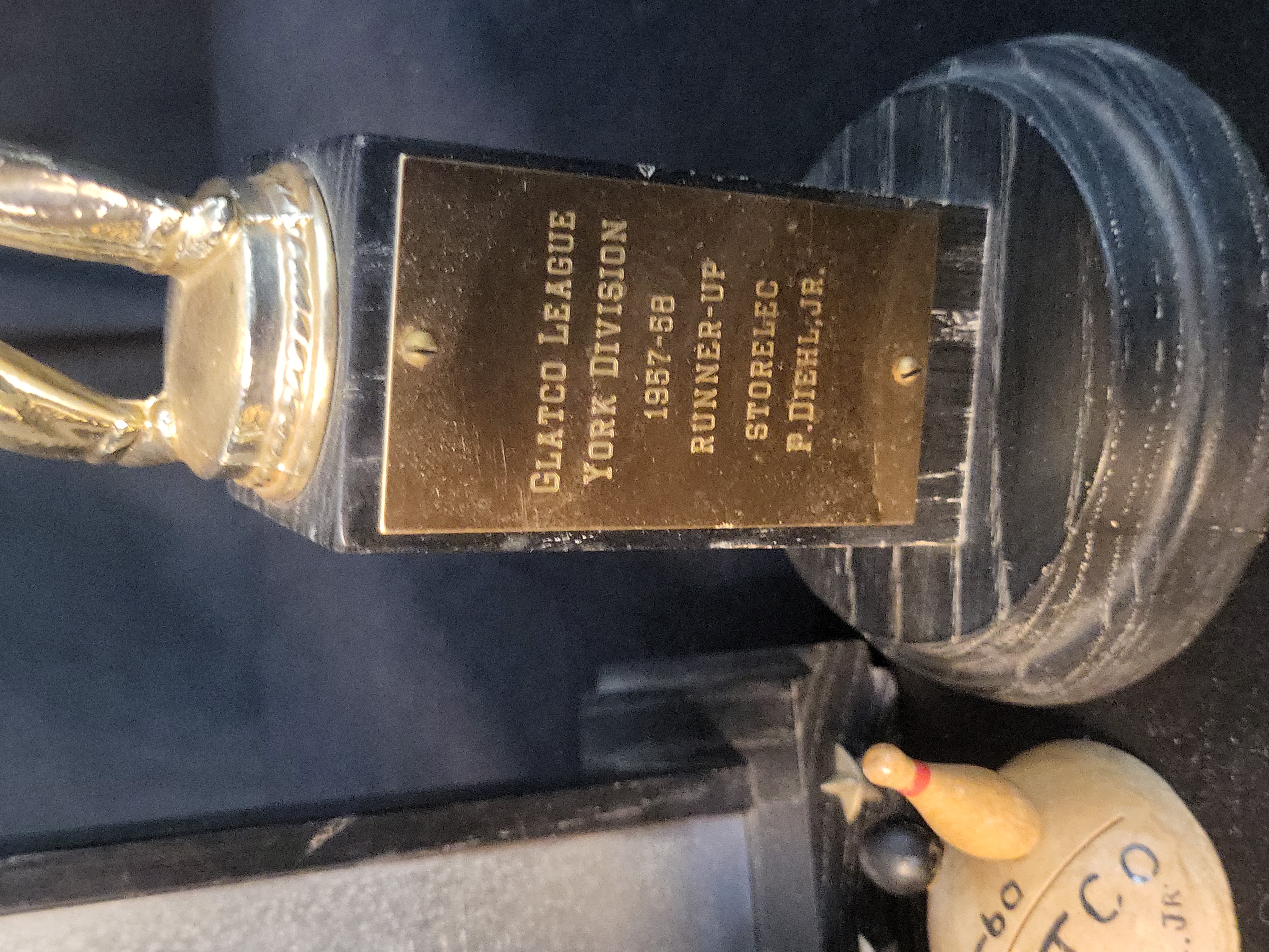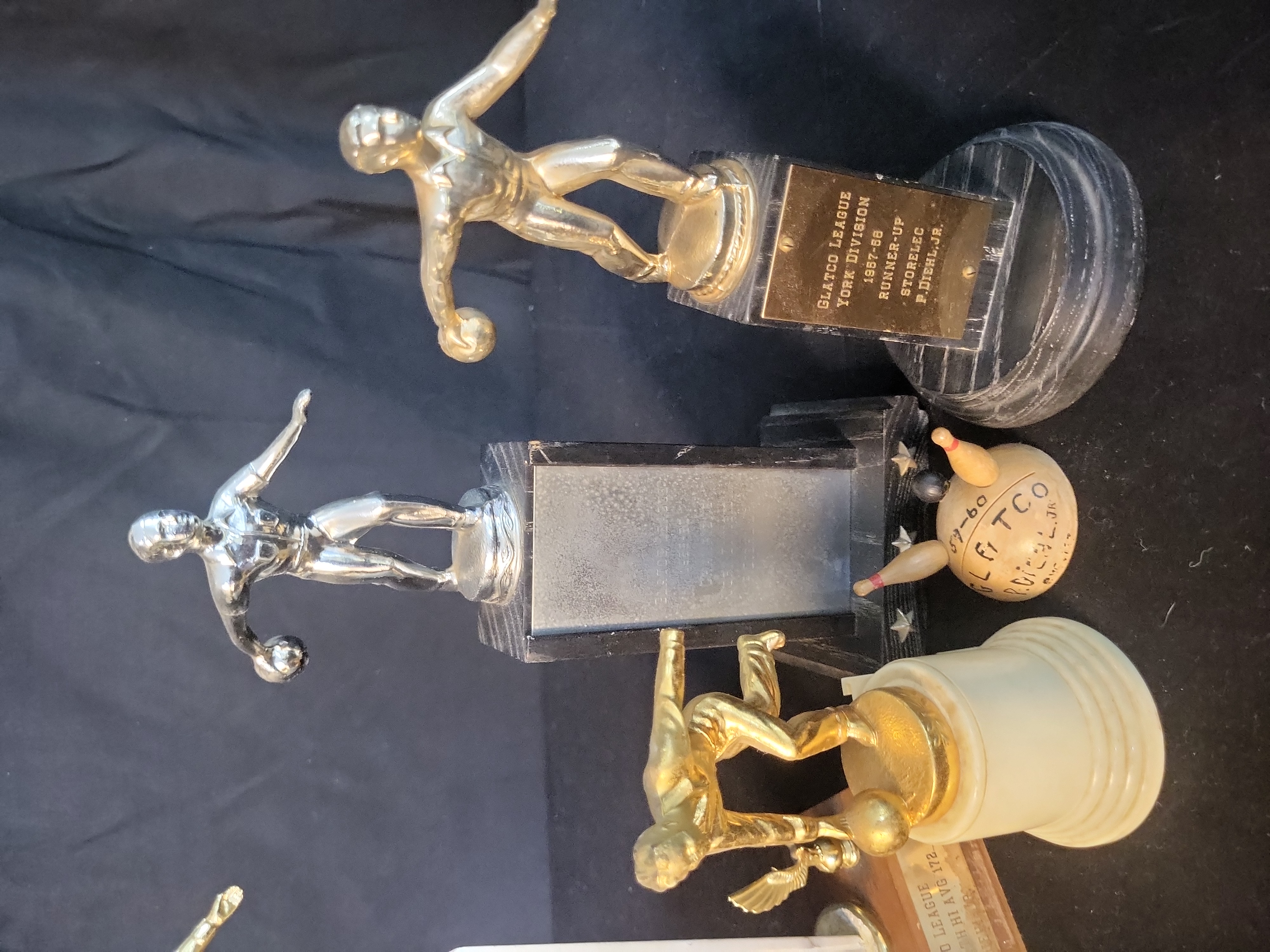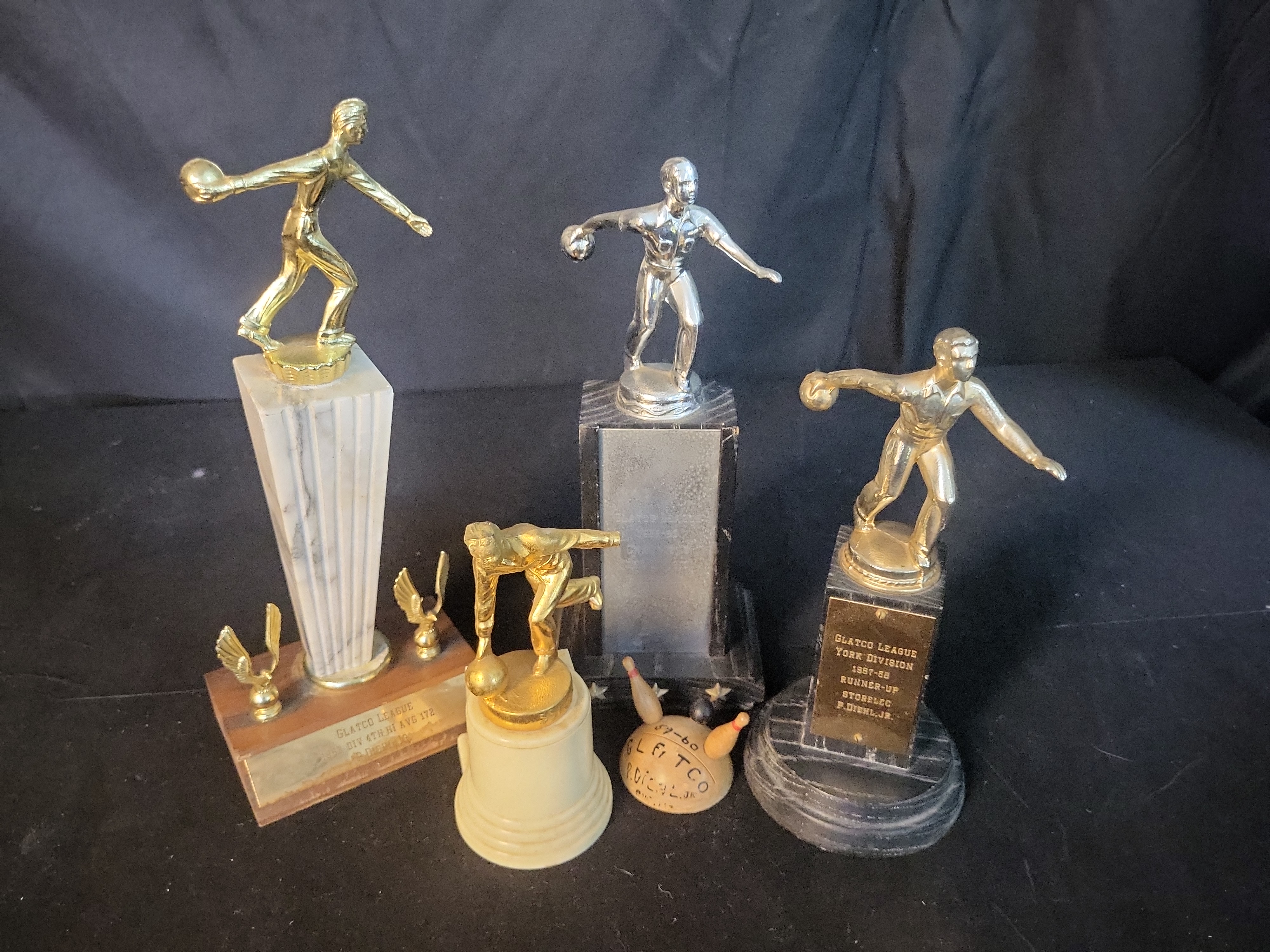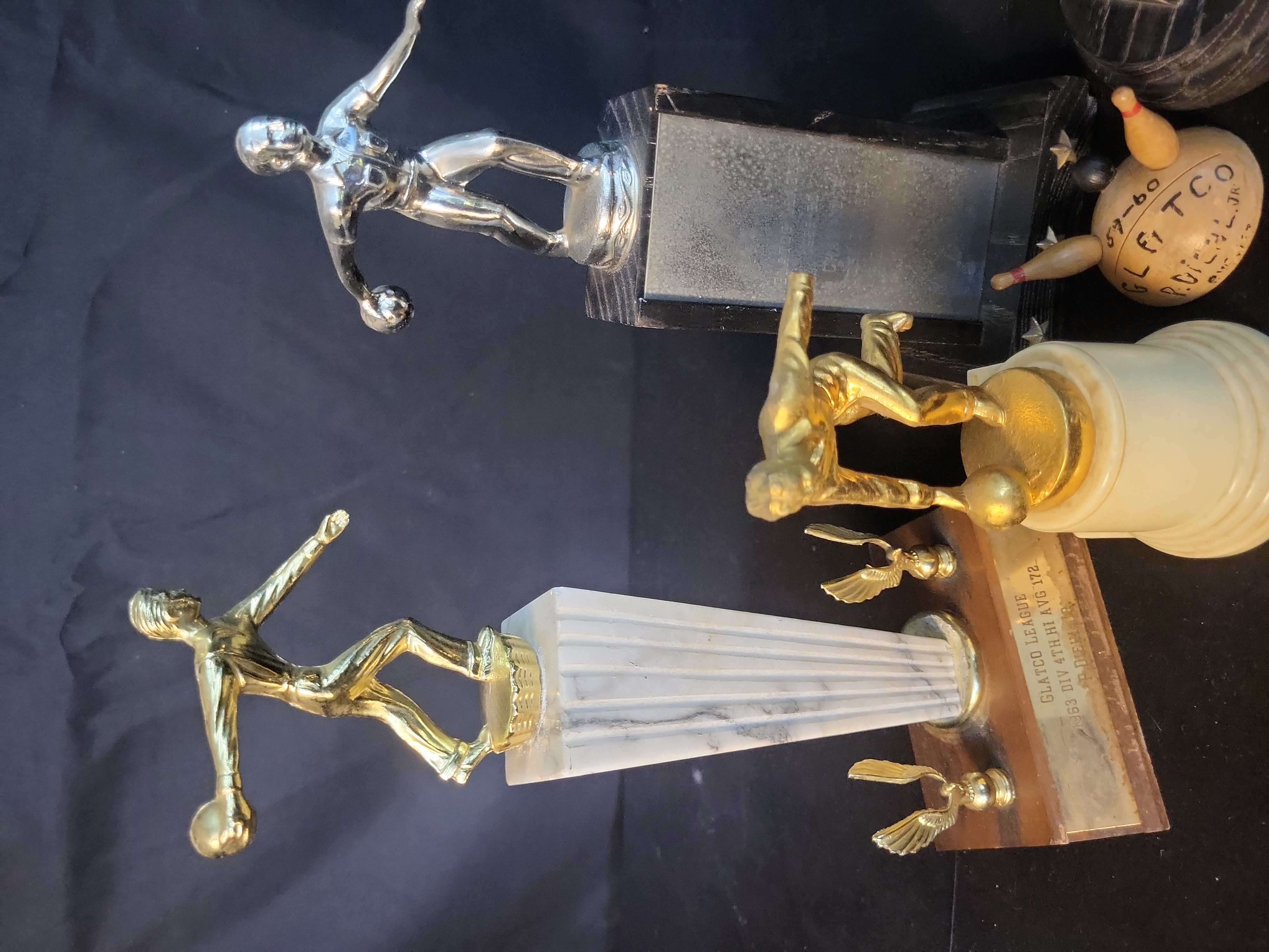 BID PER WHAT YOU SEE IN THE PHOTO, NOT THE AI GENERATED TITLES AND DESCRIPTIONS! GLATCO League Mid-Century Bowling Trophy Collection, Bakelite and Wood, 1957-1963