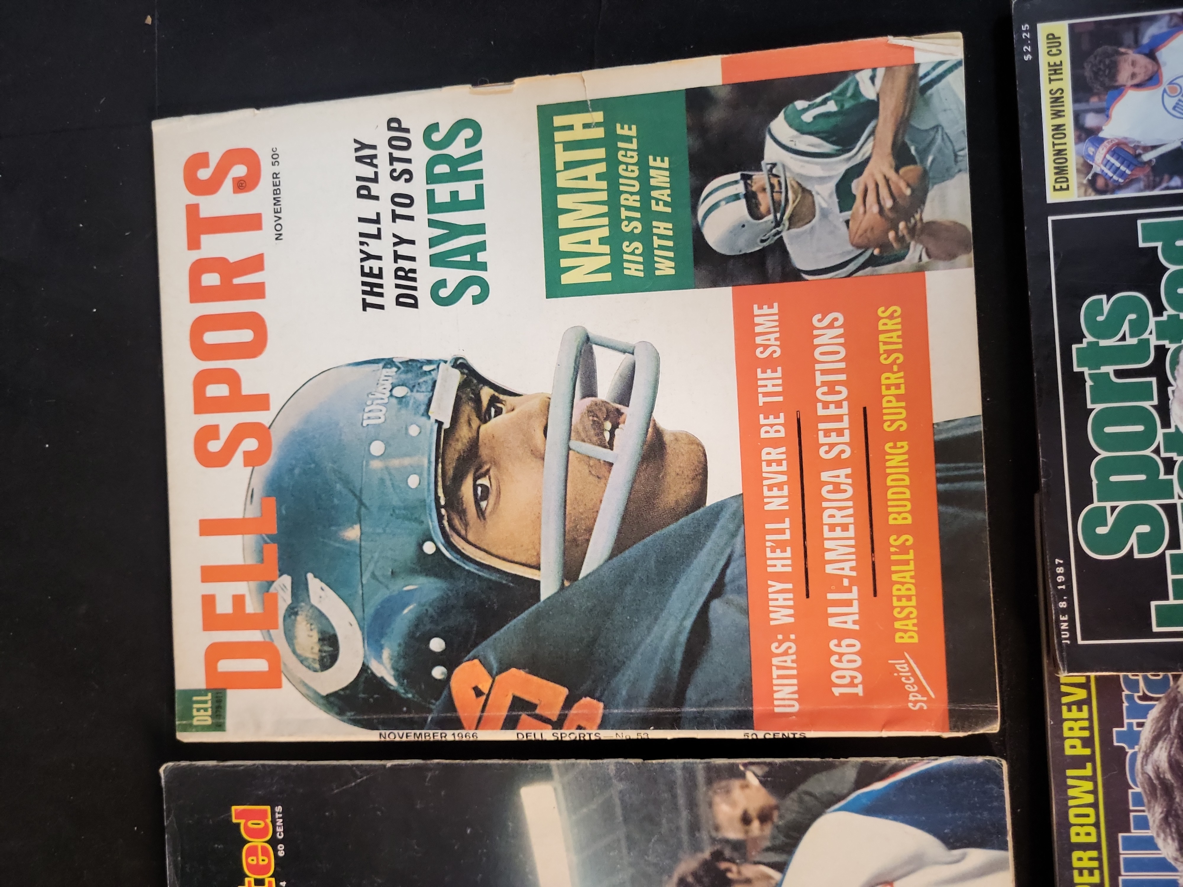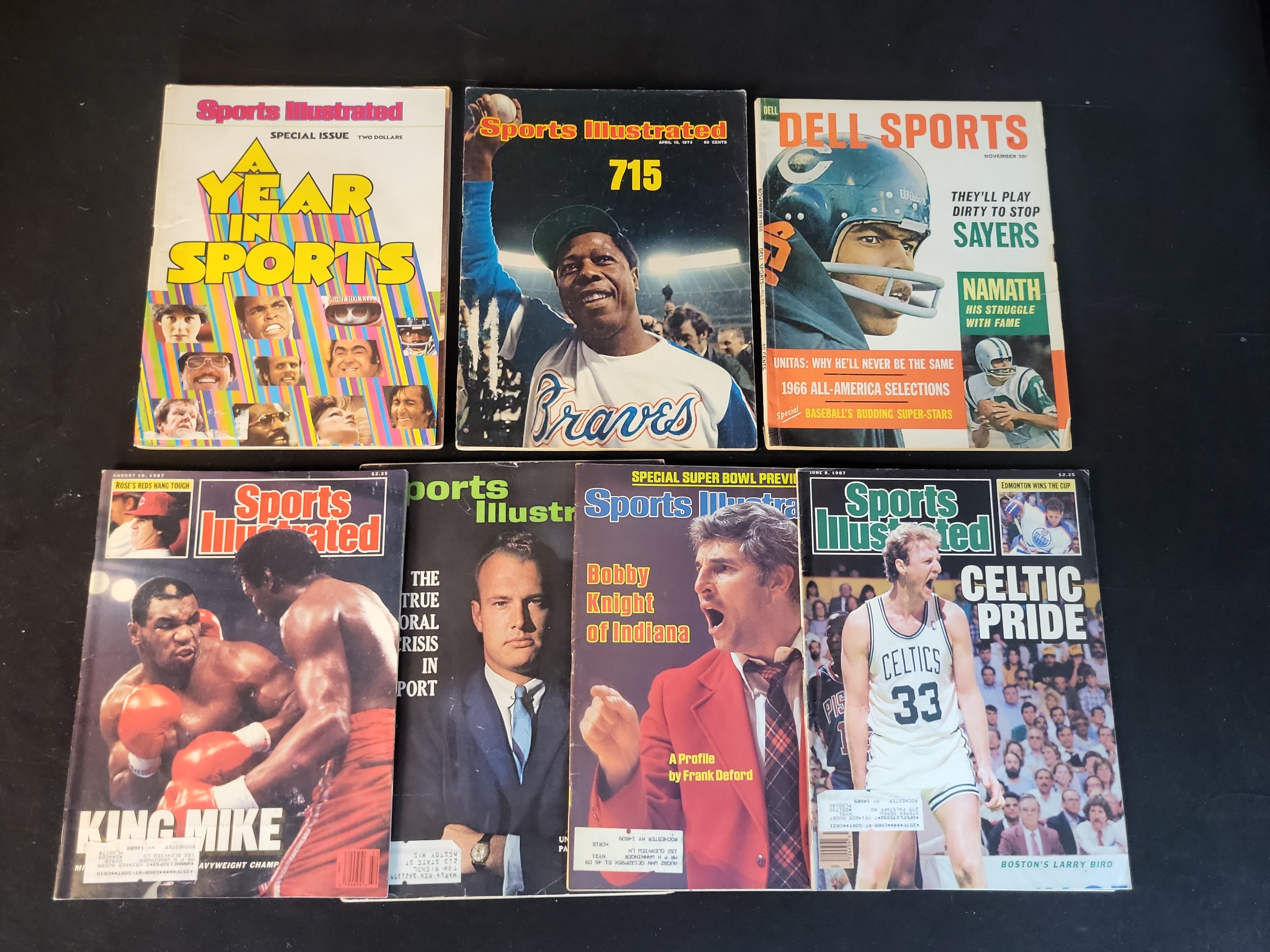 This lot features seven vintage sports magazines documenting pivotal moments and legendary athletes from the 1960s through the 1980s. The collection is anchored by the April 15, 1974, issue of Sports Illustrated commemorating Hank Aaron of the Atlanta Braves breaking Babe Ruth’s all-time home run record with his 715th blast. Basketball is represented by the June 8, 1987, "Celtic Pride" Sports Illustrated featuring Hall of Fame forward Larry Bird of the Boston Celtics, which also includes a cover inset of Wayne Gretzky celebrating the Edmonton Oilers’ Stanley Cup victory. Boxing highlights include the August 10, 1987, "King Mike" Sports Illustrated featuring Heavyweight Champion Mike Tyson in his prime. The collection also includes a rare November 1966 issue of Dell Sports featuring Chicago Bears legend Gale Sayers, with additional features on Joe Namath and Johnny Unitas. Collegiate sports are represented by the January 26, 1981, Sports Illustrated featuring Indiana Hoosiers coach Bobby Knight. Rounding out the lot are two special interest Sports Illustrated issues: the 1981 "A Year in Sports" commemorative issue featuring a montage of stars including Muhammad Ali and Pete Rose, and a mid-1980s topical issue titled "The True Moral Crisis in Sport." No signatures or third-party authentication are present.