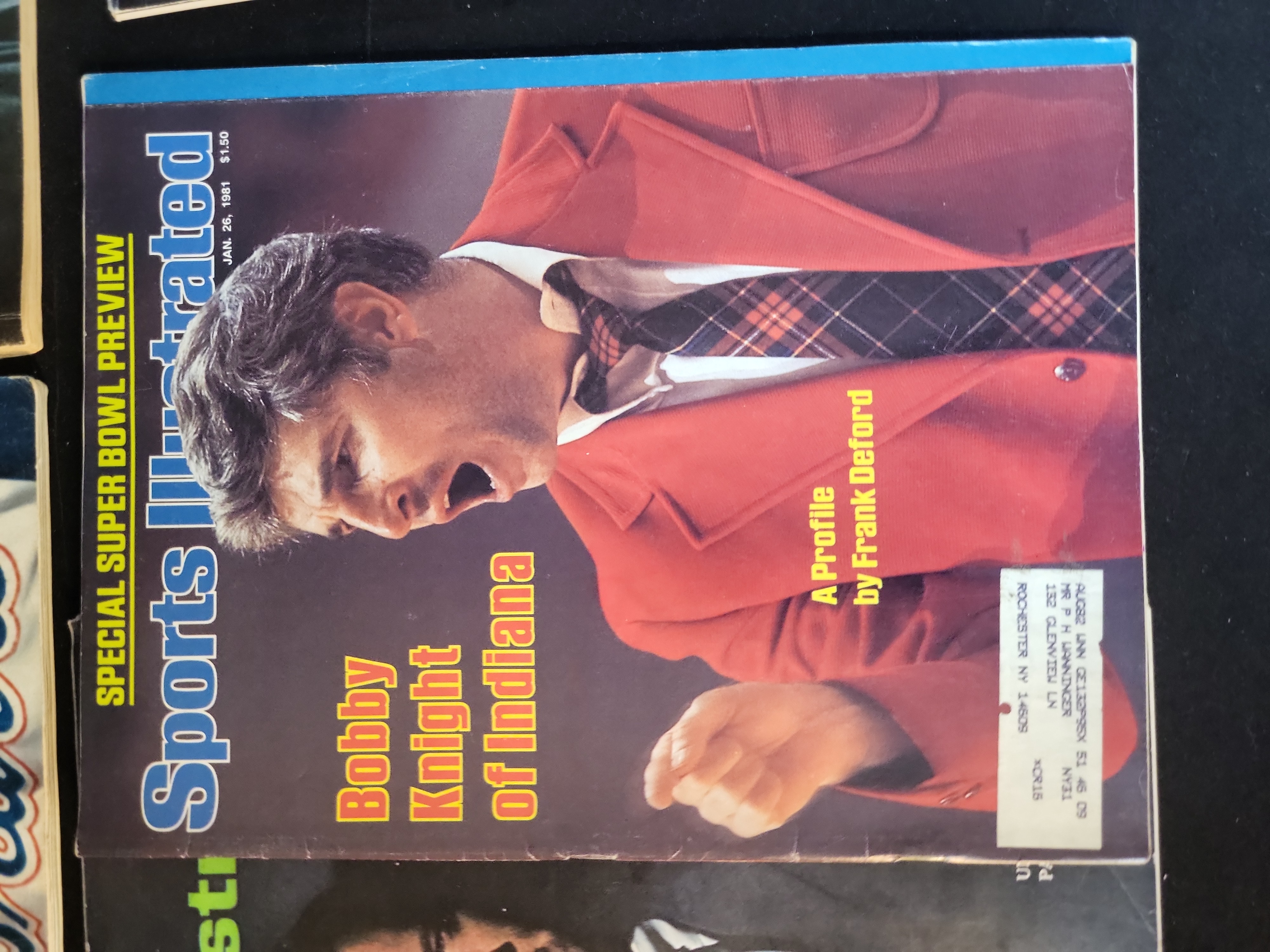 The magazines exhibit varying degrees of vintage wear consistent with age and handling. Original subscriber mailing labels are present on the front covers of the Larry Bird, Mike Tyson, and Bobby Knight issues. The Hank Aaron \"715\" issue shows notable surface paper loss and scuffing on the bottom right corner. Across the collection, there is evidence of light edge wear, corner blunting, and minor spine stress. These items are sold as-is for collectibility.
