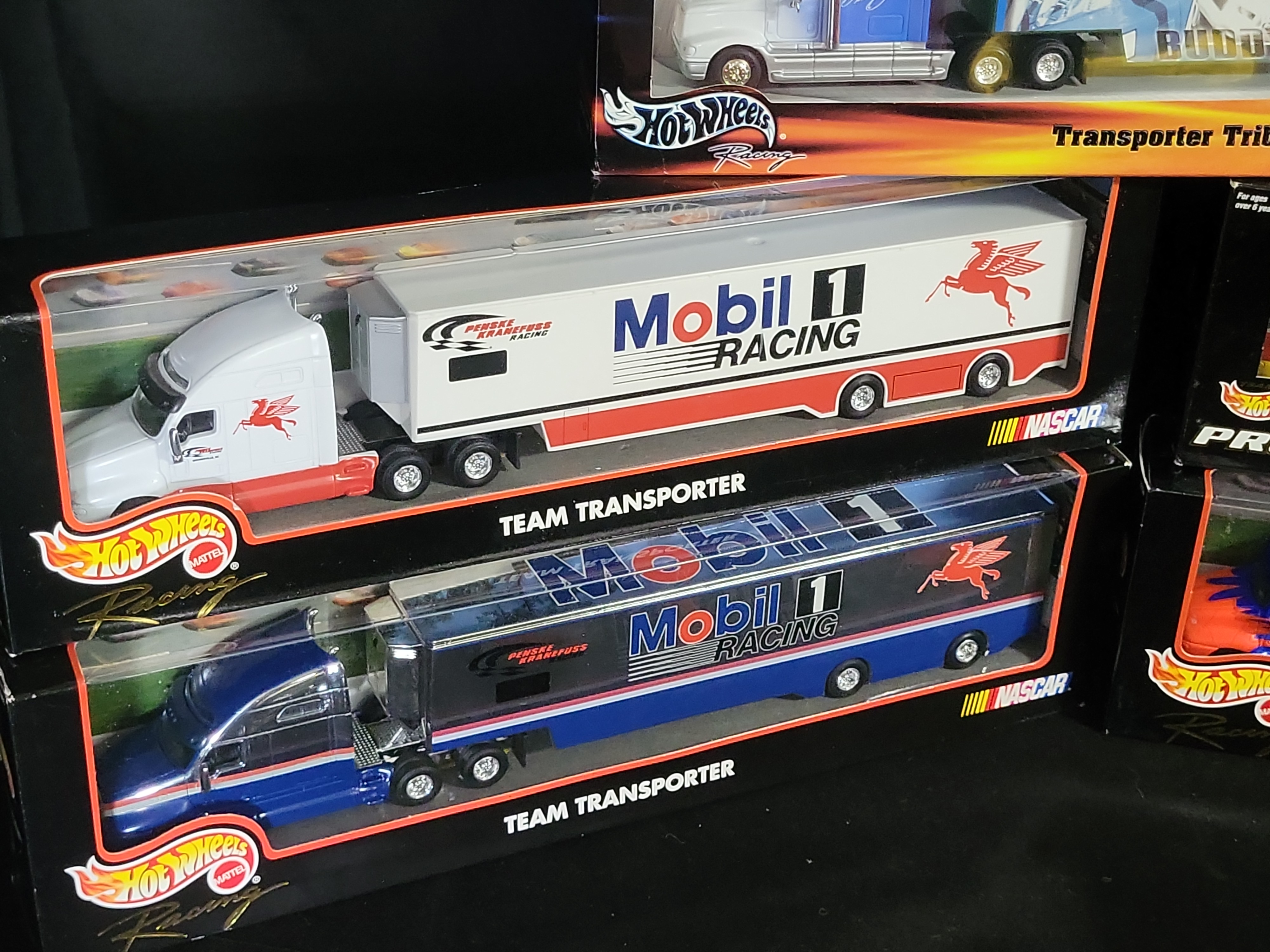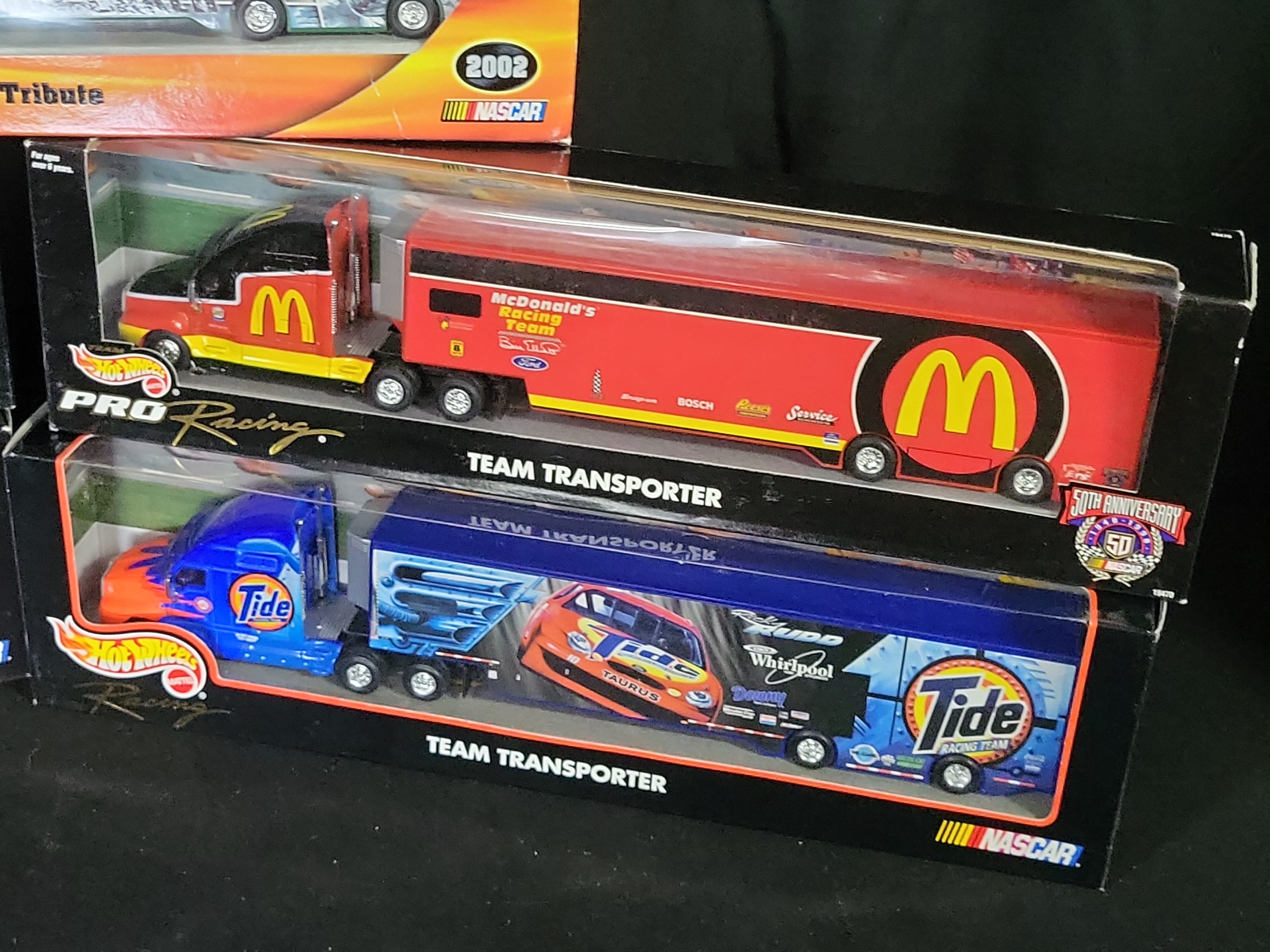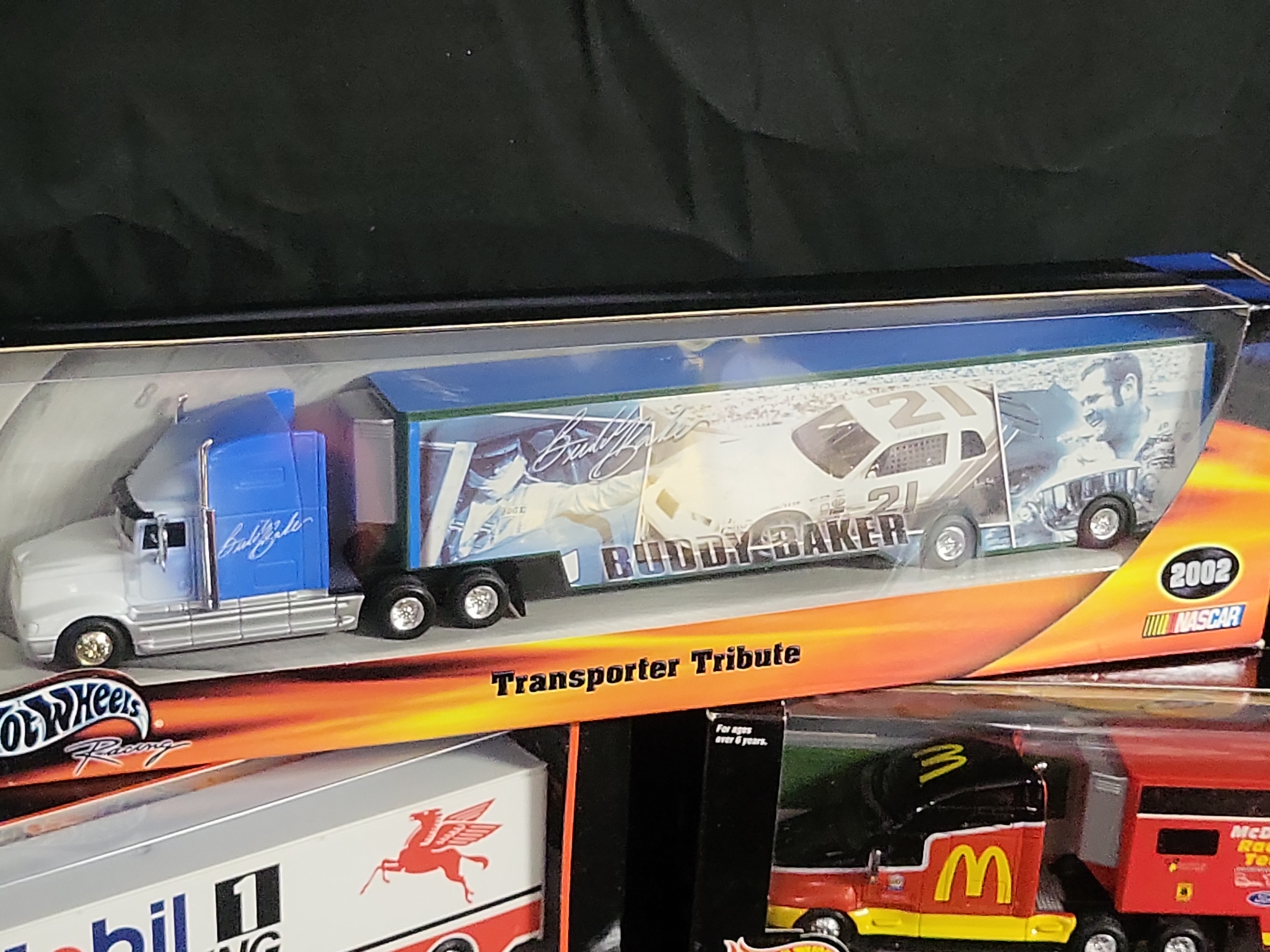 A group of five NASCAR-themed semi-truck transporters manufactured by Hot Wheels (Mattel). These approximately 1:64 scale models are constructed from die-cast metal and plastic components, featuring authentic racing liveries and sponsor graphics. The collection includes a 2002 Buddy Baker Transporter Tribute, two Mobil 1 Racing Team transporters (one in white/red and one in blue/chrome), a McDonald’s Racing Team transporter from the Pro Racing series, and a Tide Racing Team transporter. The truck cabs are modeled after Kenworth conventional semi-tractors. Each unit consists of a detailed tractor and a detachable trailer with rolling wheel mechanisms. All items are housed in their original retail window boxes, with the McDonald’s set featuring a NASCAR 50th Anniversary commemorative decal.