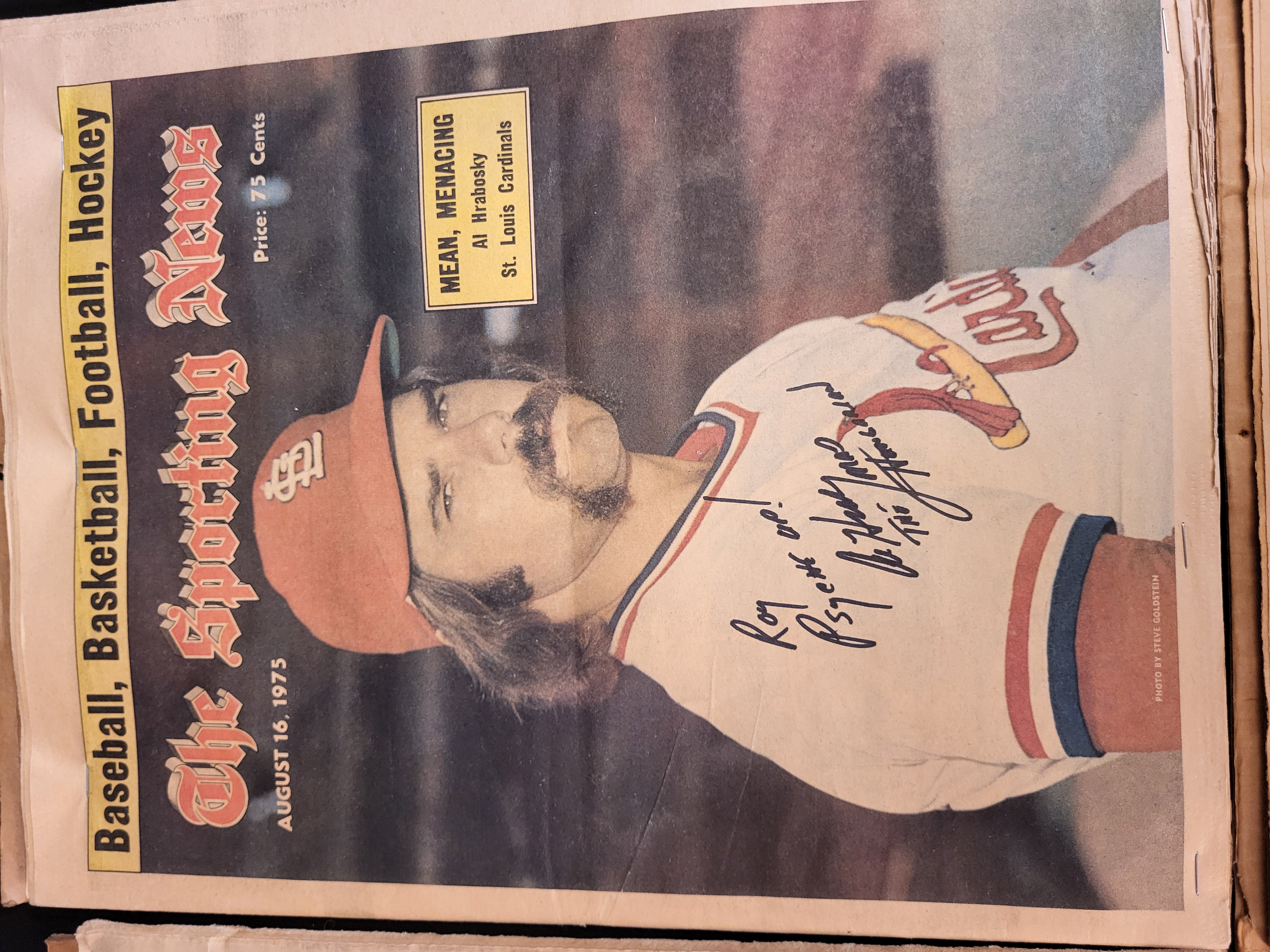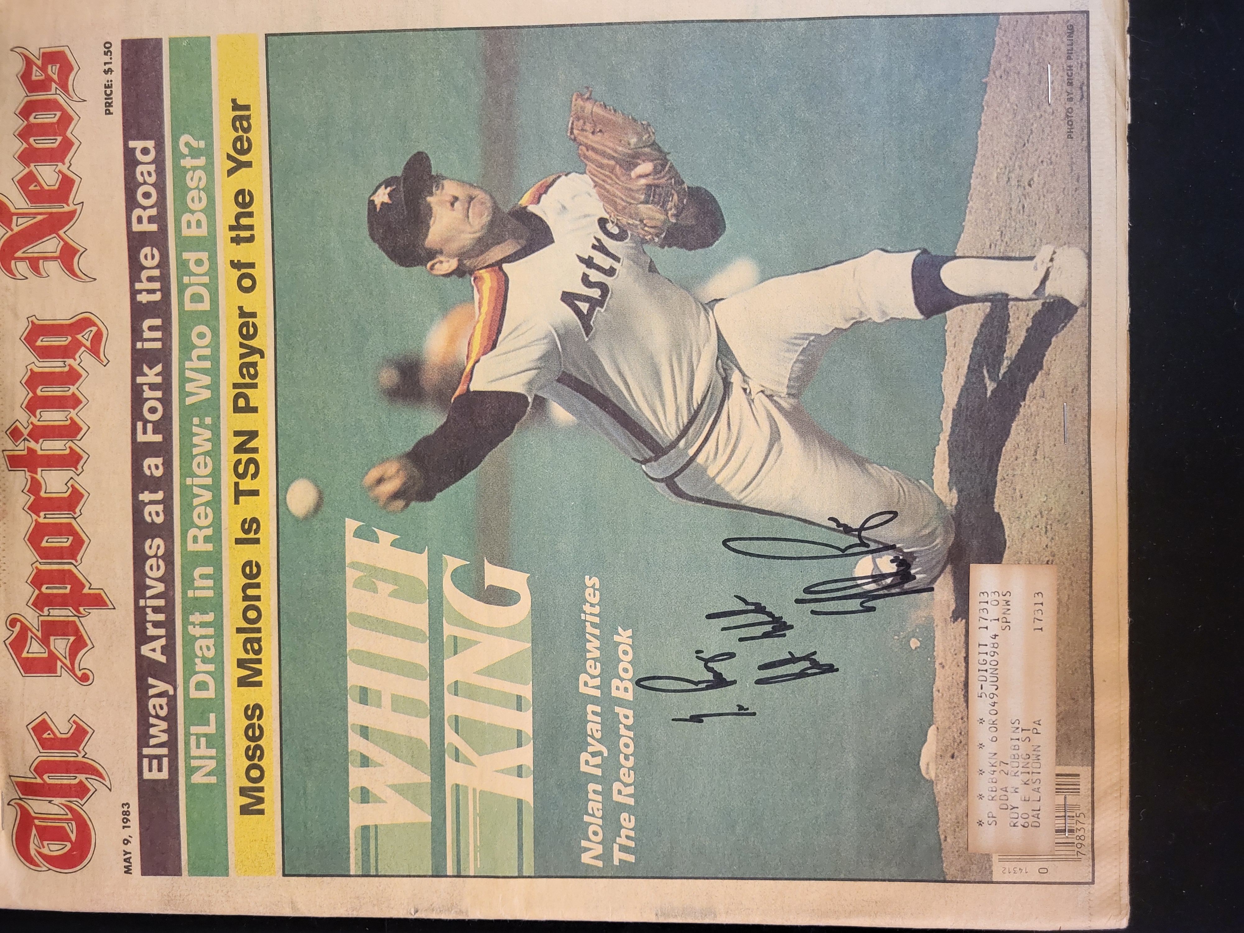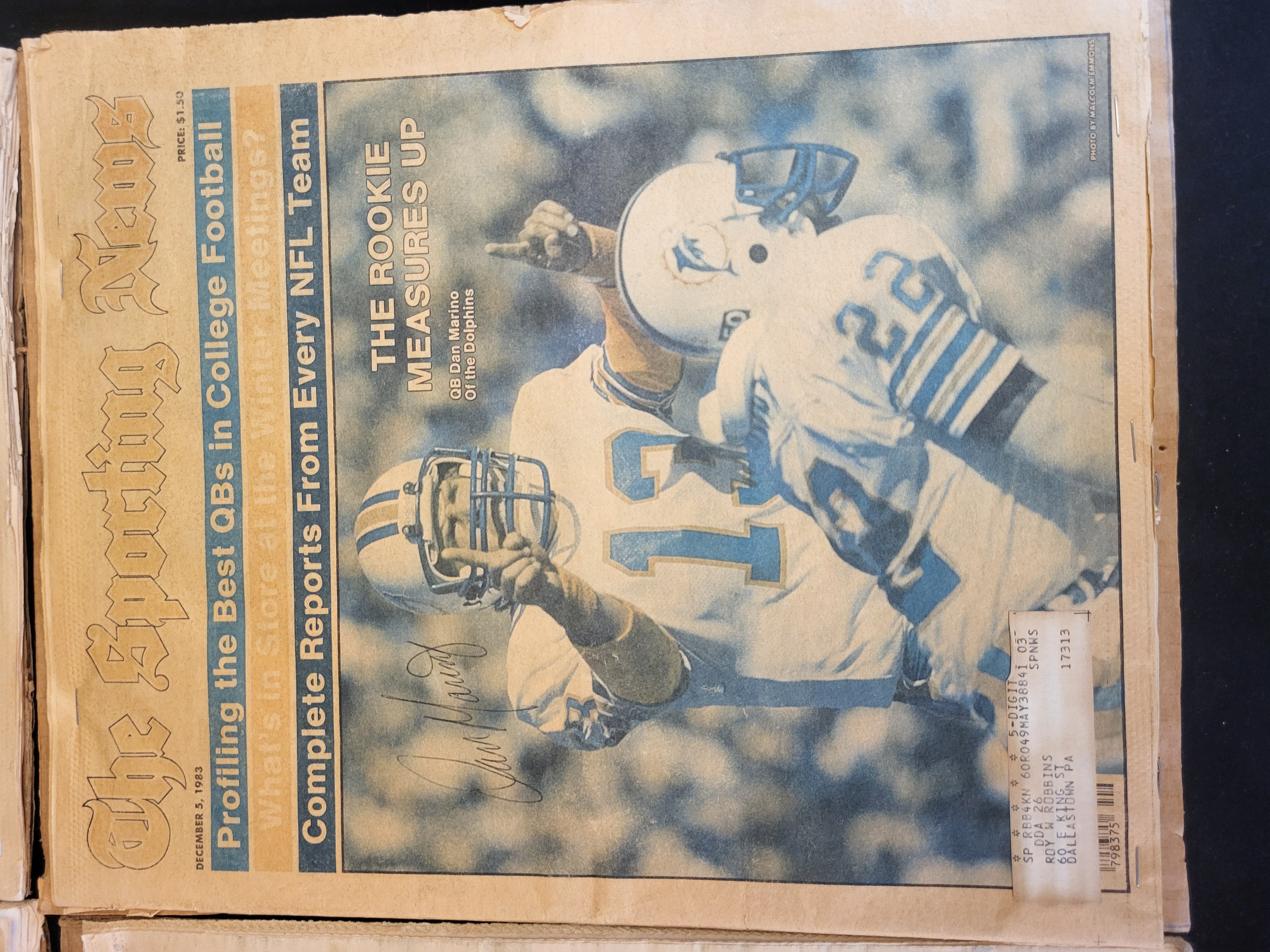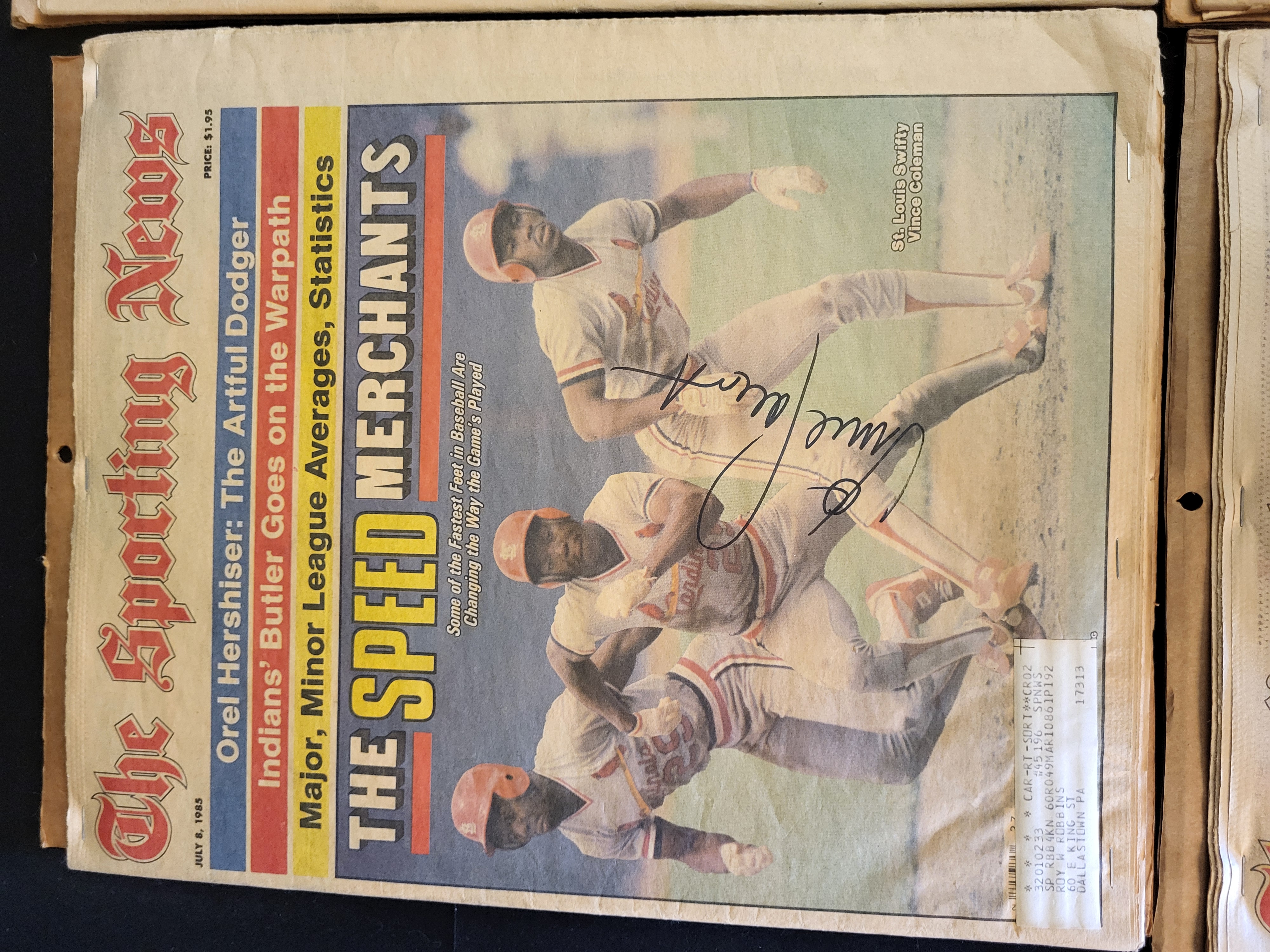 A group of vintage The Sporting News magazine covers and issues dating from the mid-1970s through the mid-1980s. The collection includes the August 16, 1975 issue featuring Al Hrabosky, the May 9, 1983 issue featuring Nolan Ryan, the December 5, 1983 issue featuring Dan Marino, and the July 8, 1985 issue featuring Vince Coleman. Each cover is hand-signed in ink by the featured athlete. The publications are printed on newsprint. Three of the covers have original mailing labels affixed to the lower right corner addressed to a recipient in Dallastown, Pennsylvania. Puncture marks are located along the left margins of the items.