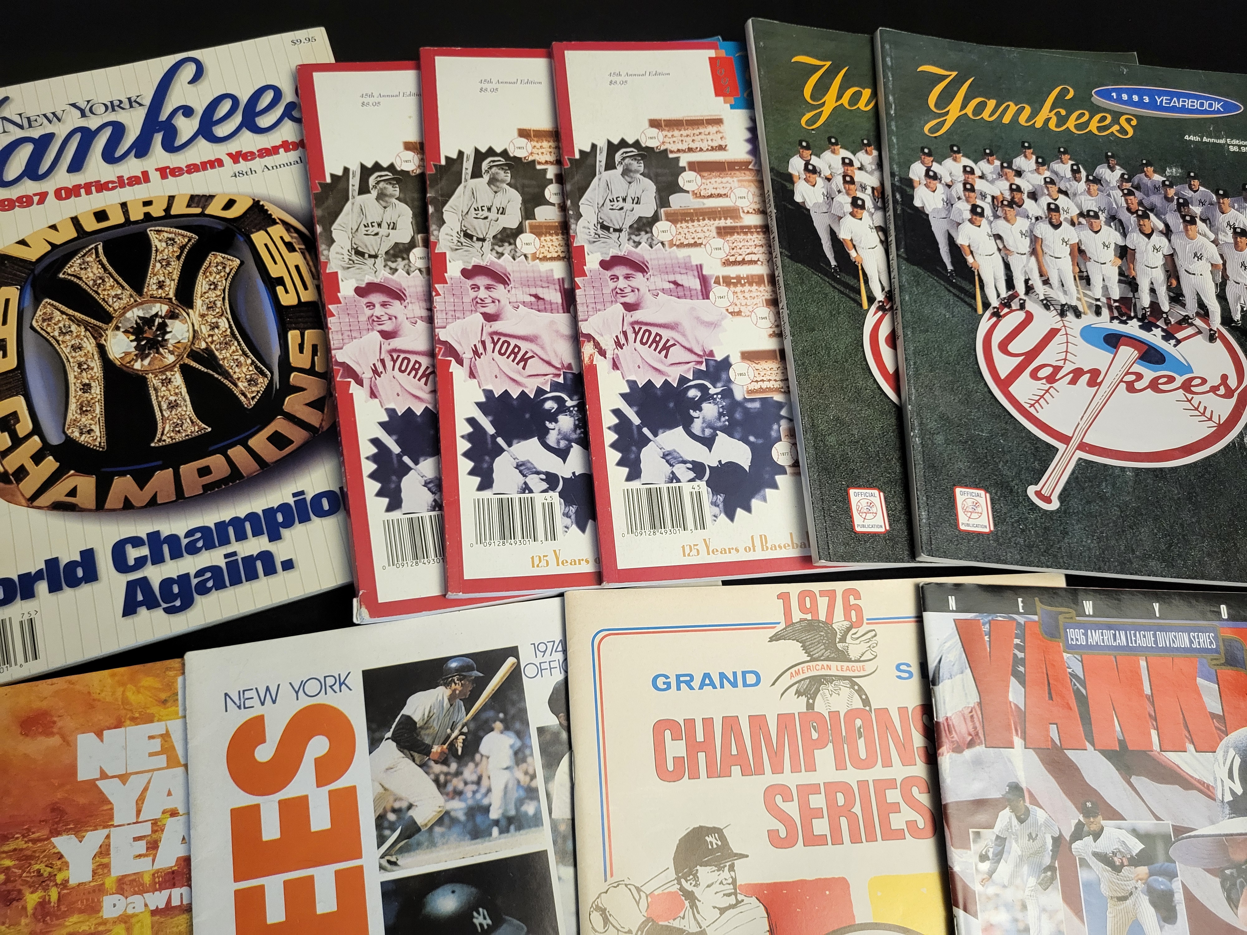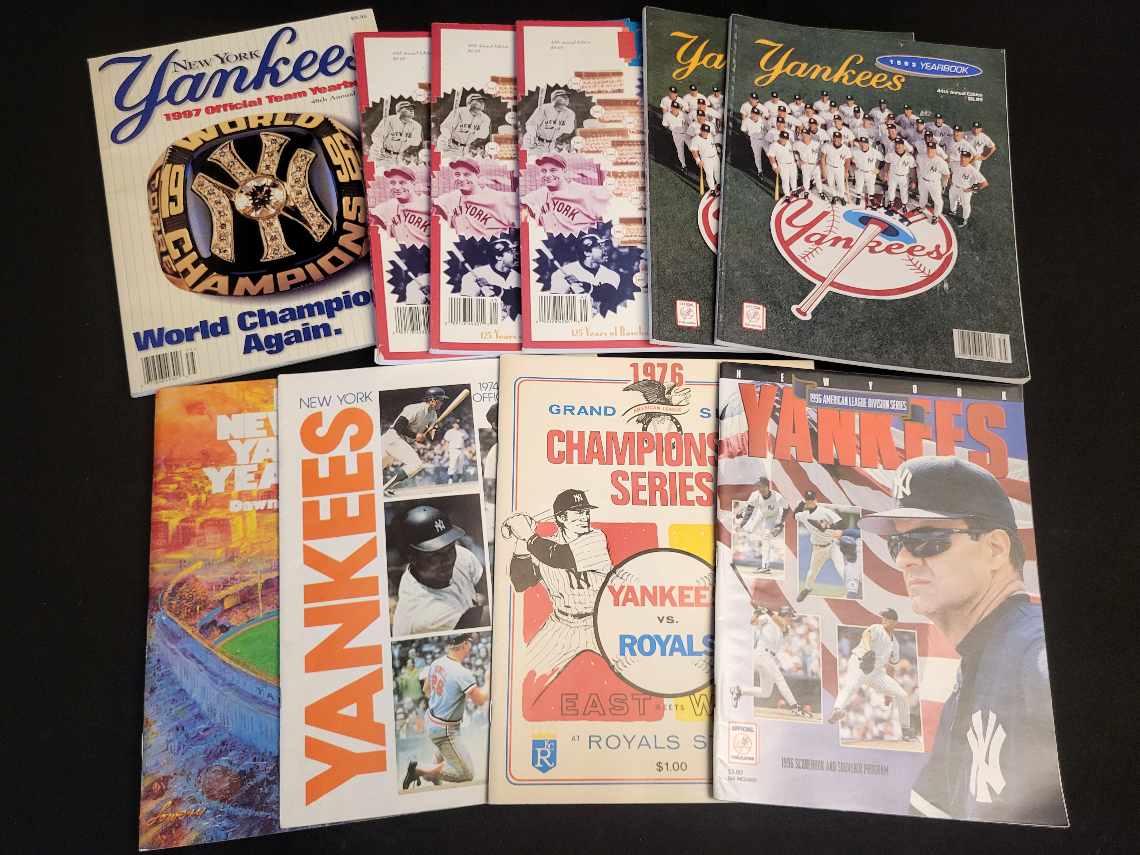 A collection of vintage New York Yankees printed ephemera dating from the mid-1970s through the late 1990s. The group includes an official 1974 program, a 1976 American League Championship Series program for the Yankees vs. Royals at Royals Stadium, and a 1993 official yearbook (44th annual edition). The assortment also features several 1994 yearbooks commemorating 125 Years of Baseball (45th annual edition), a 1996 American League Division Series scorebook and souvenir program, and a 1997 official team yearbook (48th annual edition) depicting a 1996 World Series championship ring on the cover. These paper items are illustrated with full-color and black-and-white photography, team rosters, and period advertisements.