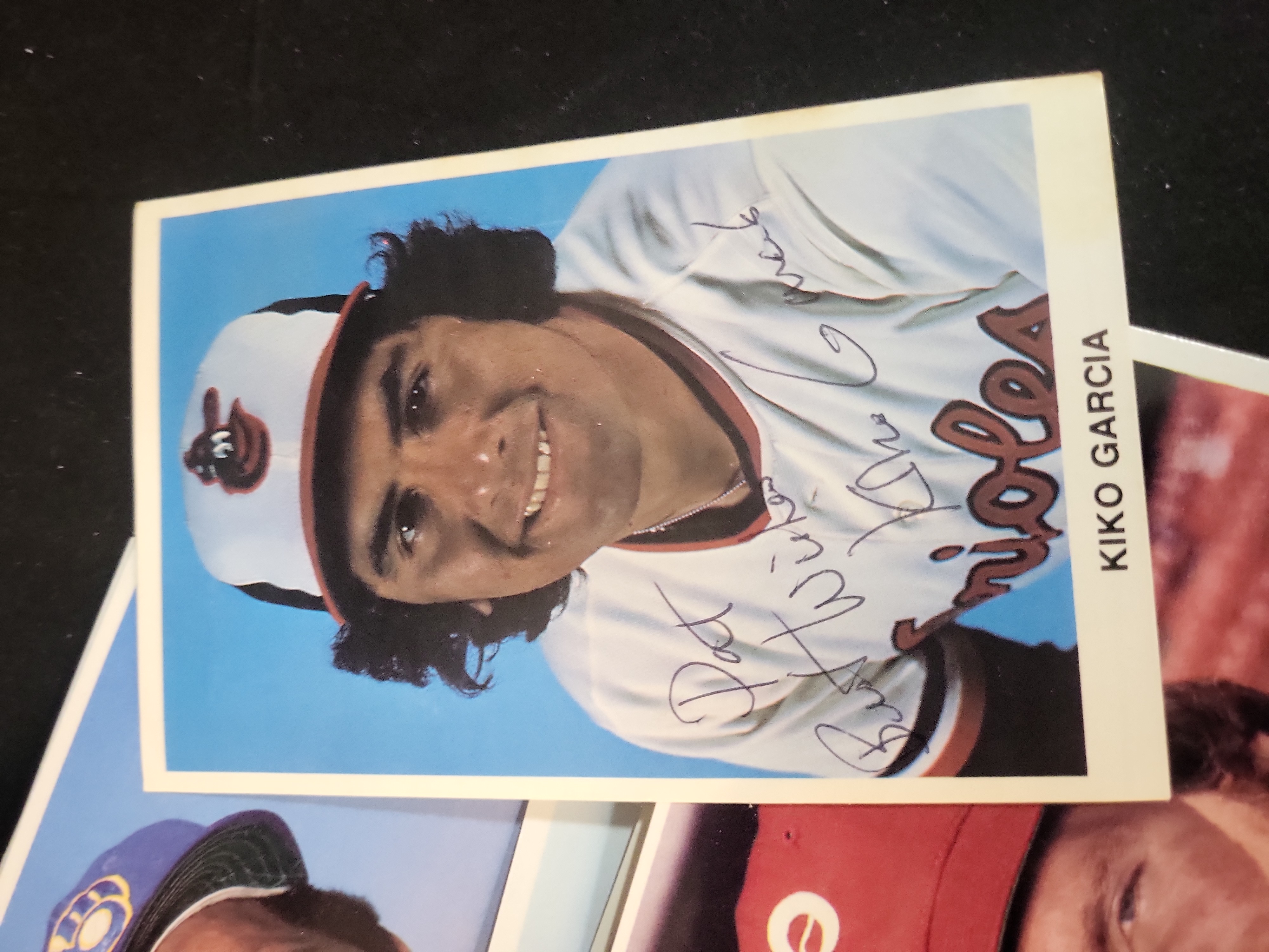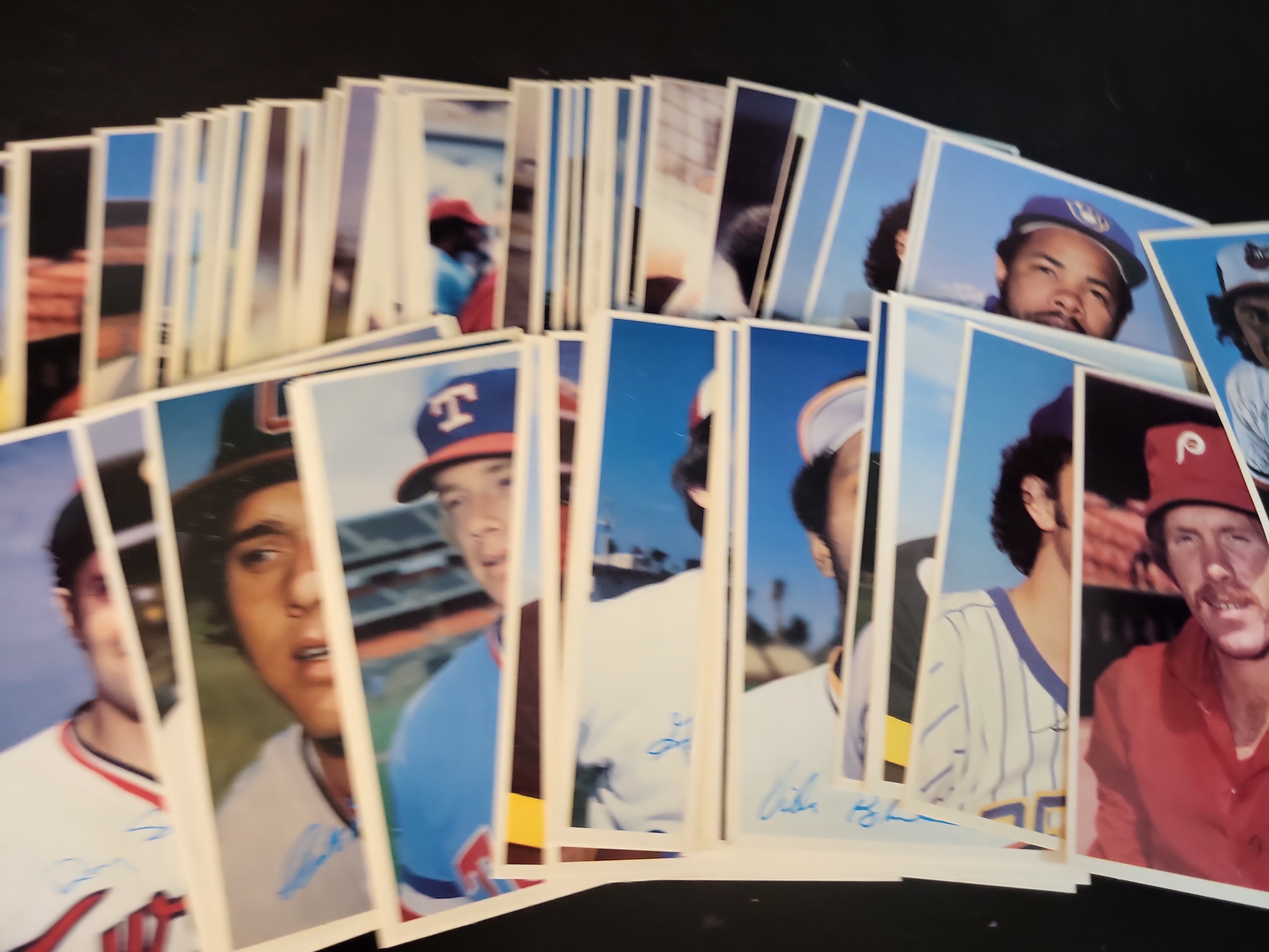 Topps, 1980, Superstar Photos 5×7 set. This lot includes Mike Schmidt (No. 3), Vida Blue (No. 4), Cecil Cooper (No. 20), Rick Cerone (No. 23), Kiko Garcia (No. 34), Pat Putnam (No. 49), and Roy Smalley (No. 53). The cards feature large color photographs and blue facsimile signatures. No rookie cards are identified. The Kiko Garcia card is hand-signed and autographed with a personalized ink inscription. This collection represents a significant portion of the 60-card set.