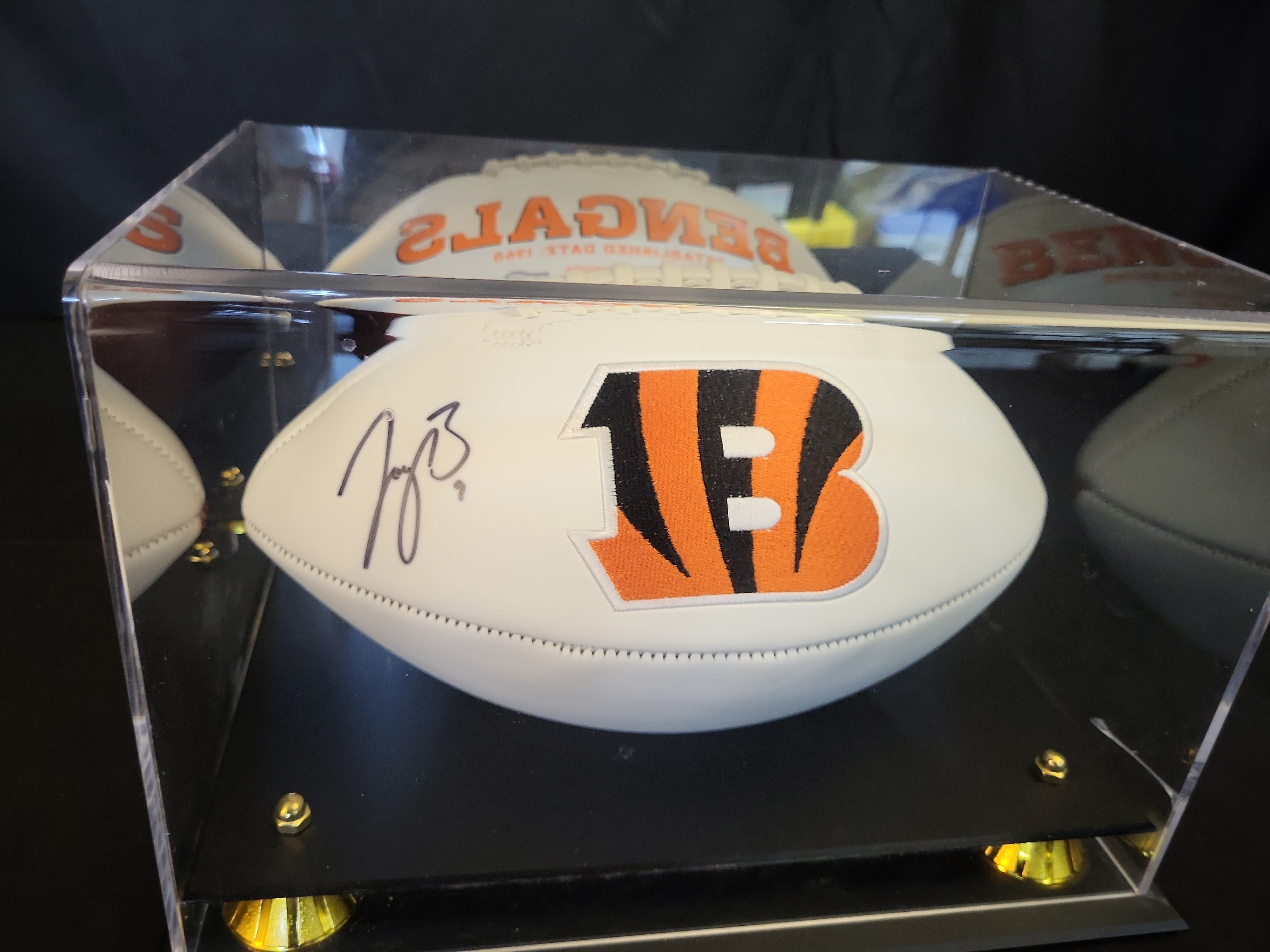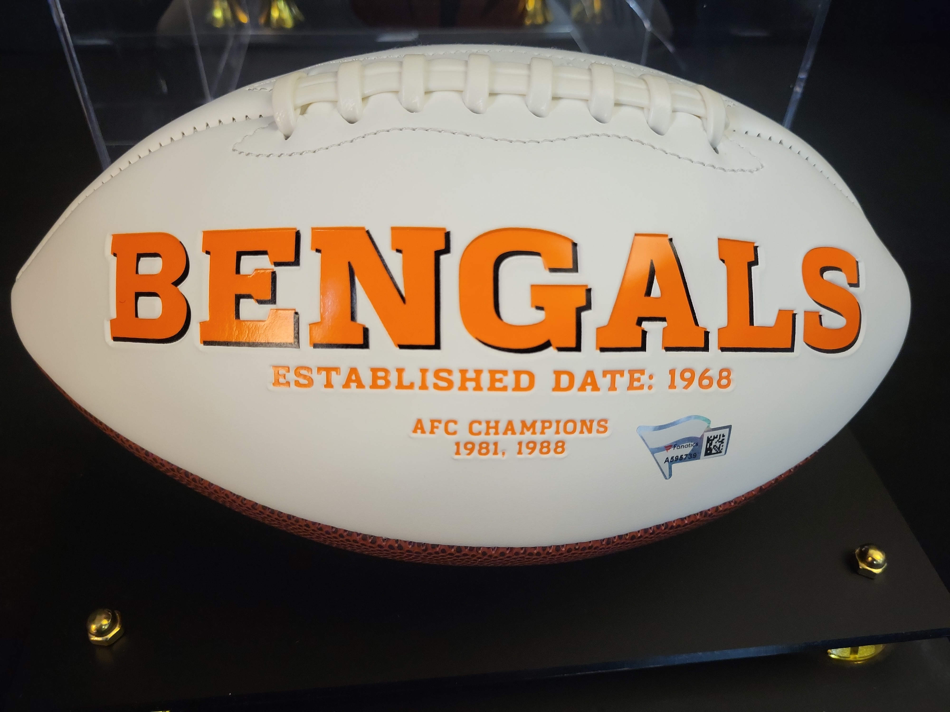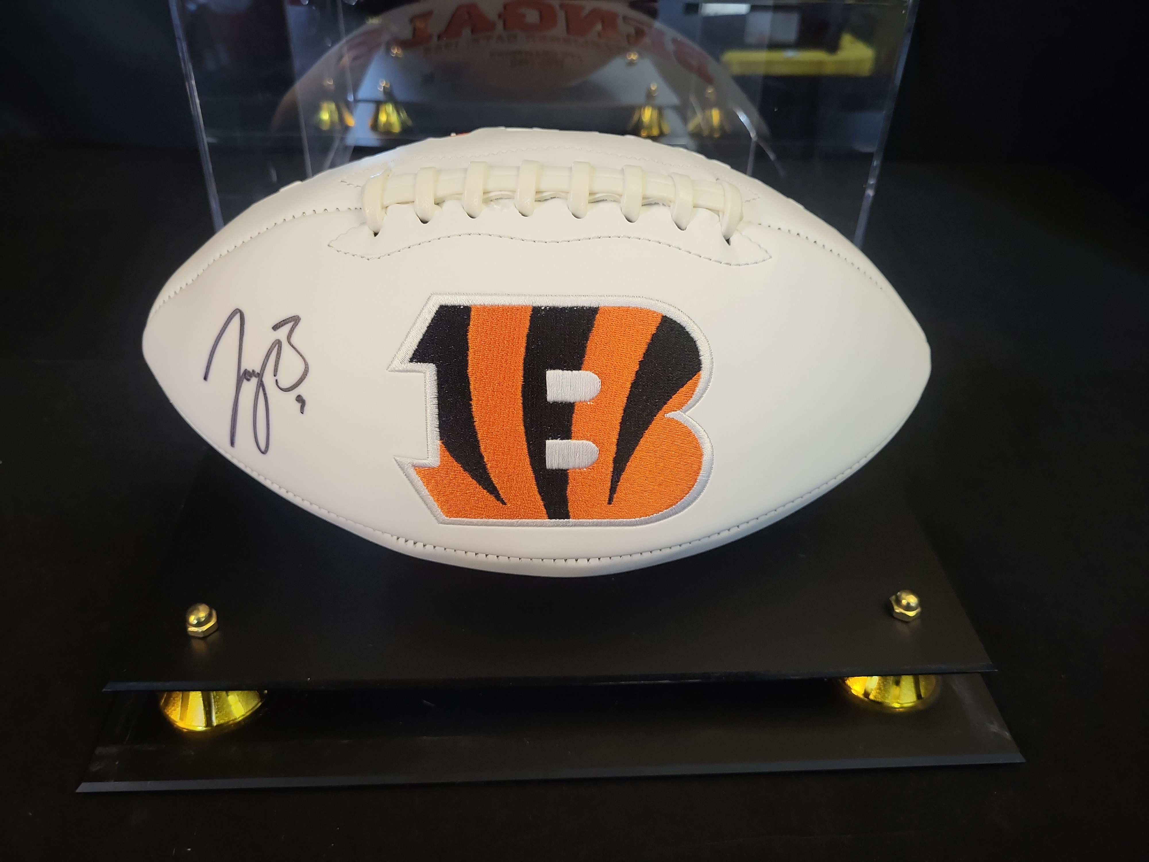 The football is in excellent, mint condition. The white panels remain bright with no visible scuffs, marks, or yellowing. The embroidered logo and printed text are crisp and free of fraying. The autograph is bold and well-preserved with no signs of fading, smudging, or ink bleeding. The acrylic display case is clear and free of significant scratches or cracks. The tiered base and gold-tone feet are securely attached and in excellent aesthetic condition.