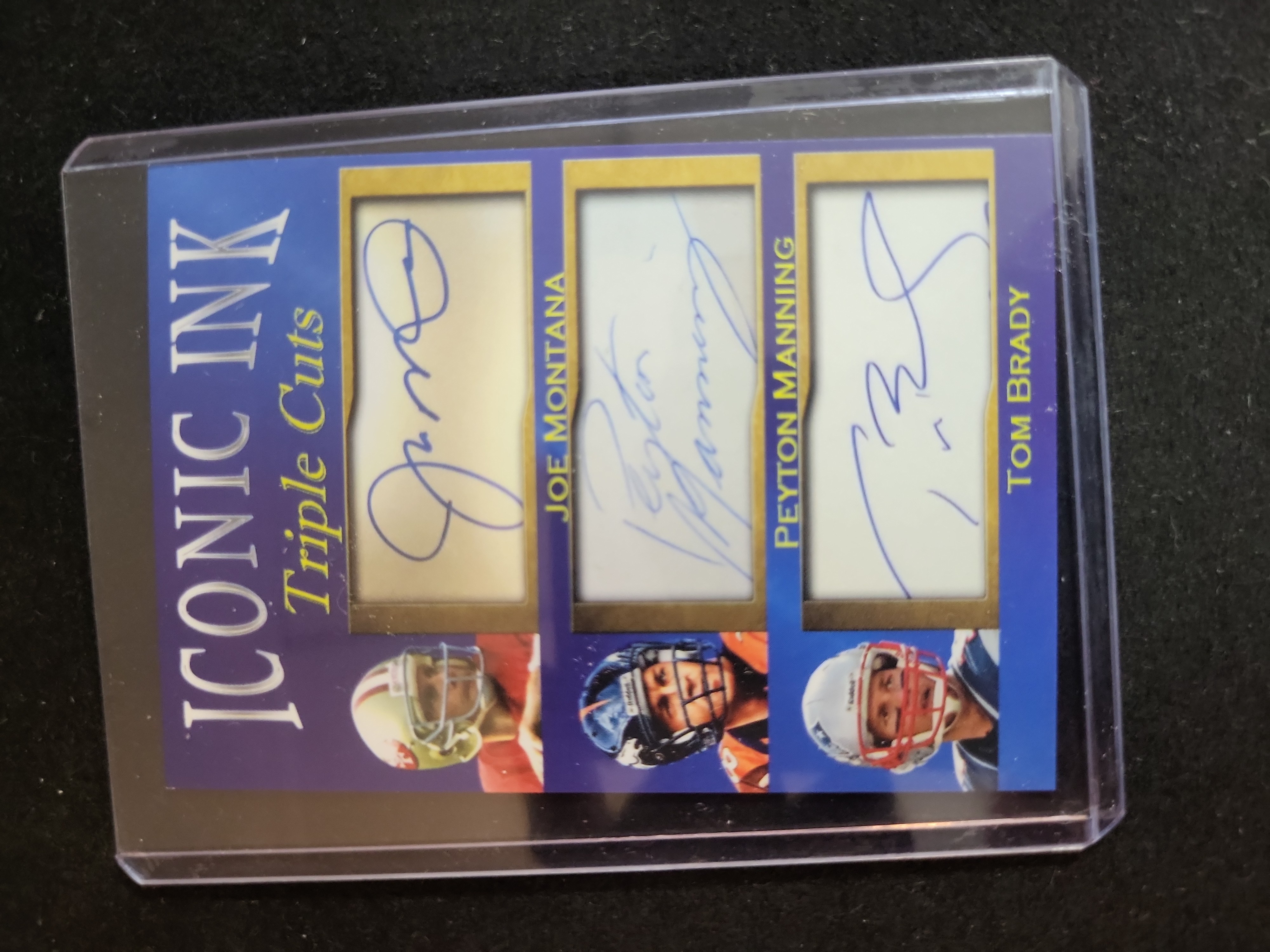 Brand: Iconic Ink. Year: c. 2020. Set: Triple Cuts. Card Number: N/A. Players: Joe Montana (San Francisco 49ers), Peyton Manning (Denver Broncos), and Tom Brady (New England Patriots). Rookie Status: N/A. Parallel Type: Triple Cut Signature Style. Certification: This is an unlicensed aftermarket card featuring printed facsimile signatures. The signatures are not hand-signed and have not been authenticated by a third-party service (PSA/DNA, JSA, or Beckett).