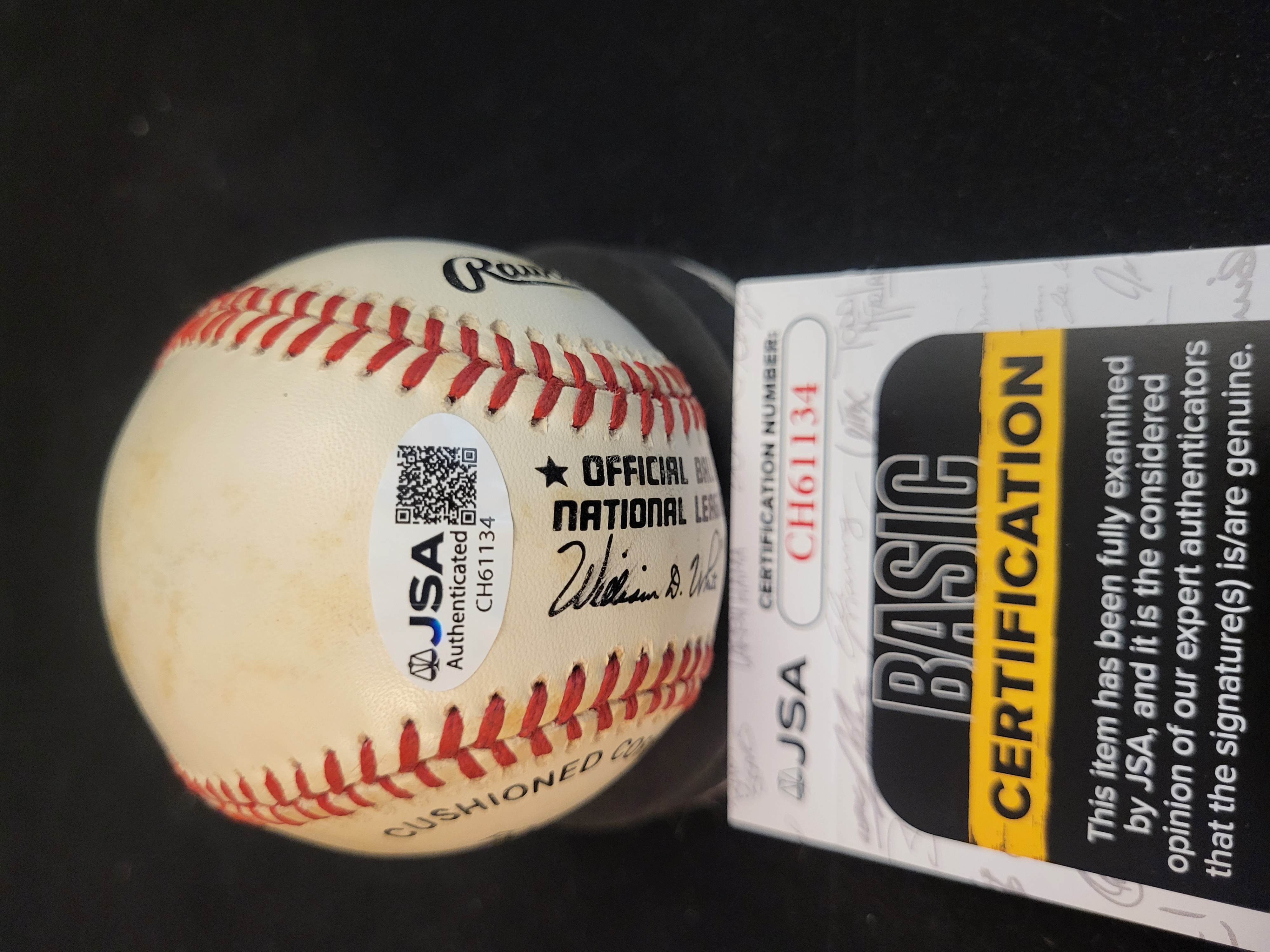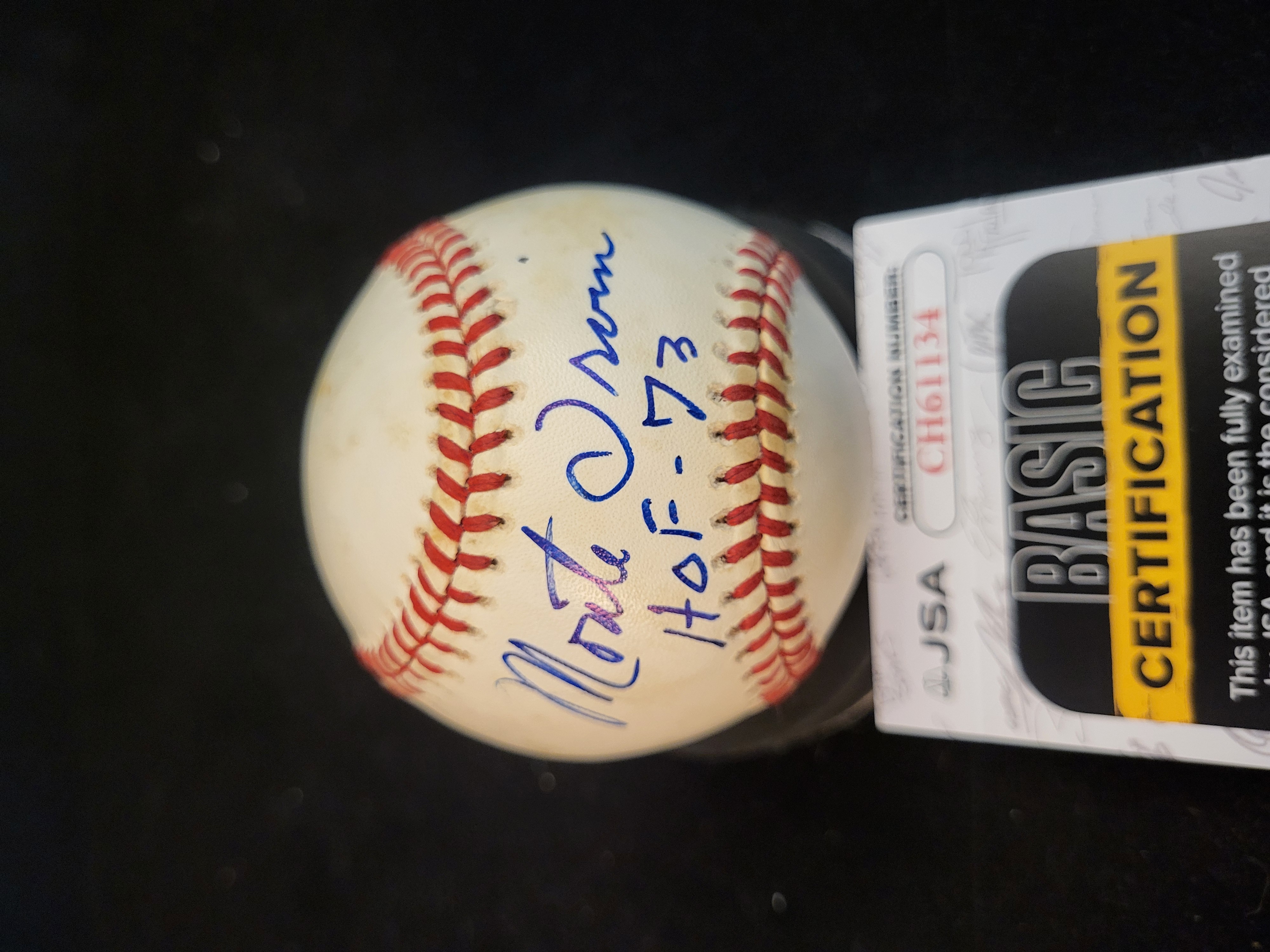 This professional auction lot features an autographed baseball hand-signed by New York Giants legend and Negro Leagues star Monte Irvin. The signature is executed in blue ink on a side panel of a Rawlings Official National League baseball (William D. White, President). In addition to his signature, Irvin provided the inscription "HOF – 73" to commemorate his 1973 induction into the Baseball Hall of Fame. The piece is fully authenticated by James Spence Authentication (JSA) with Basic Certification. The item includes a matching JSA certification sticker (CH61134) affixed directly to the ball and is accompanied by the corresponding JSA Certificate of Authenticity card.