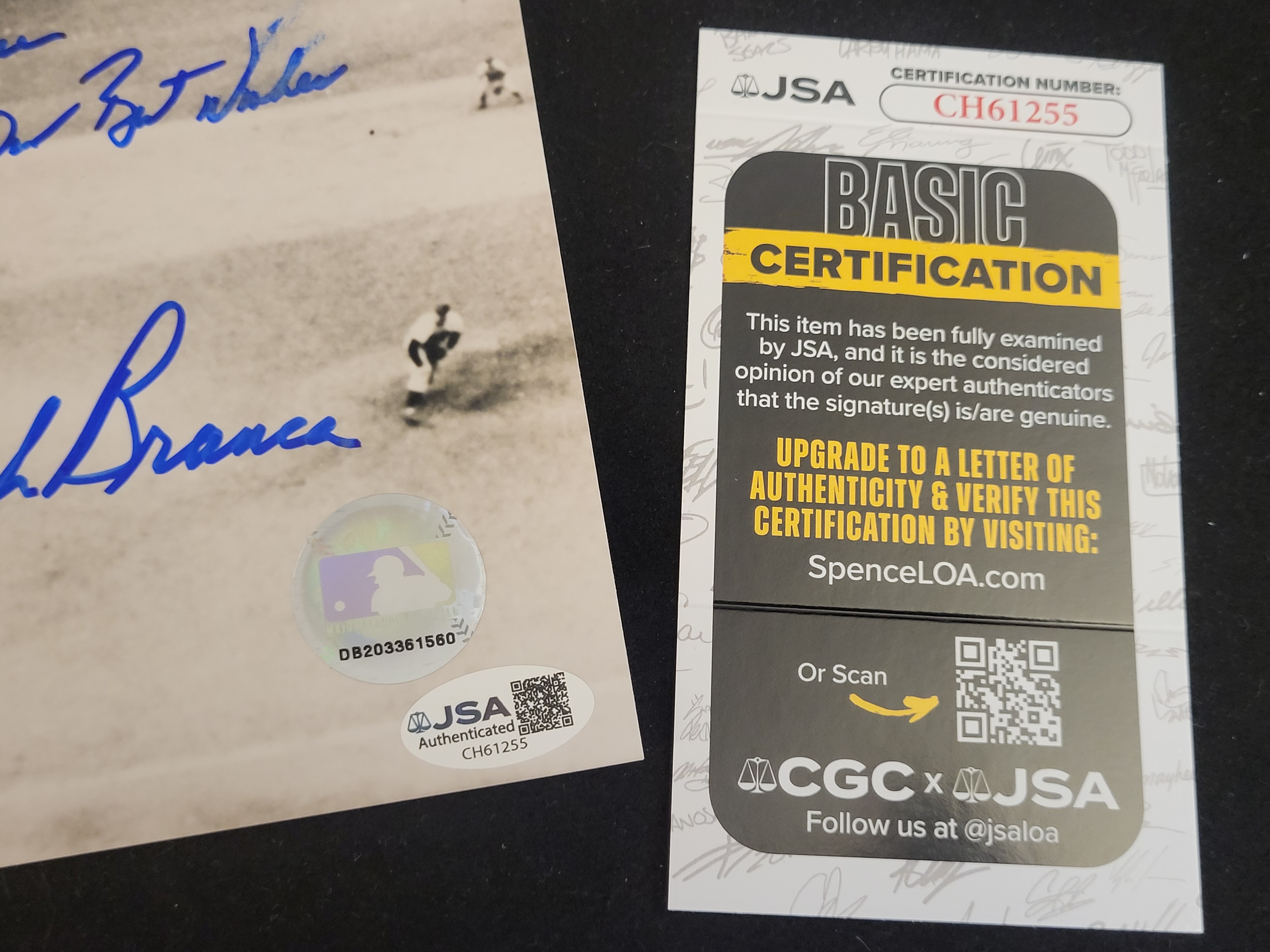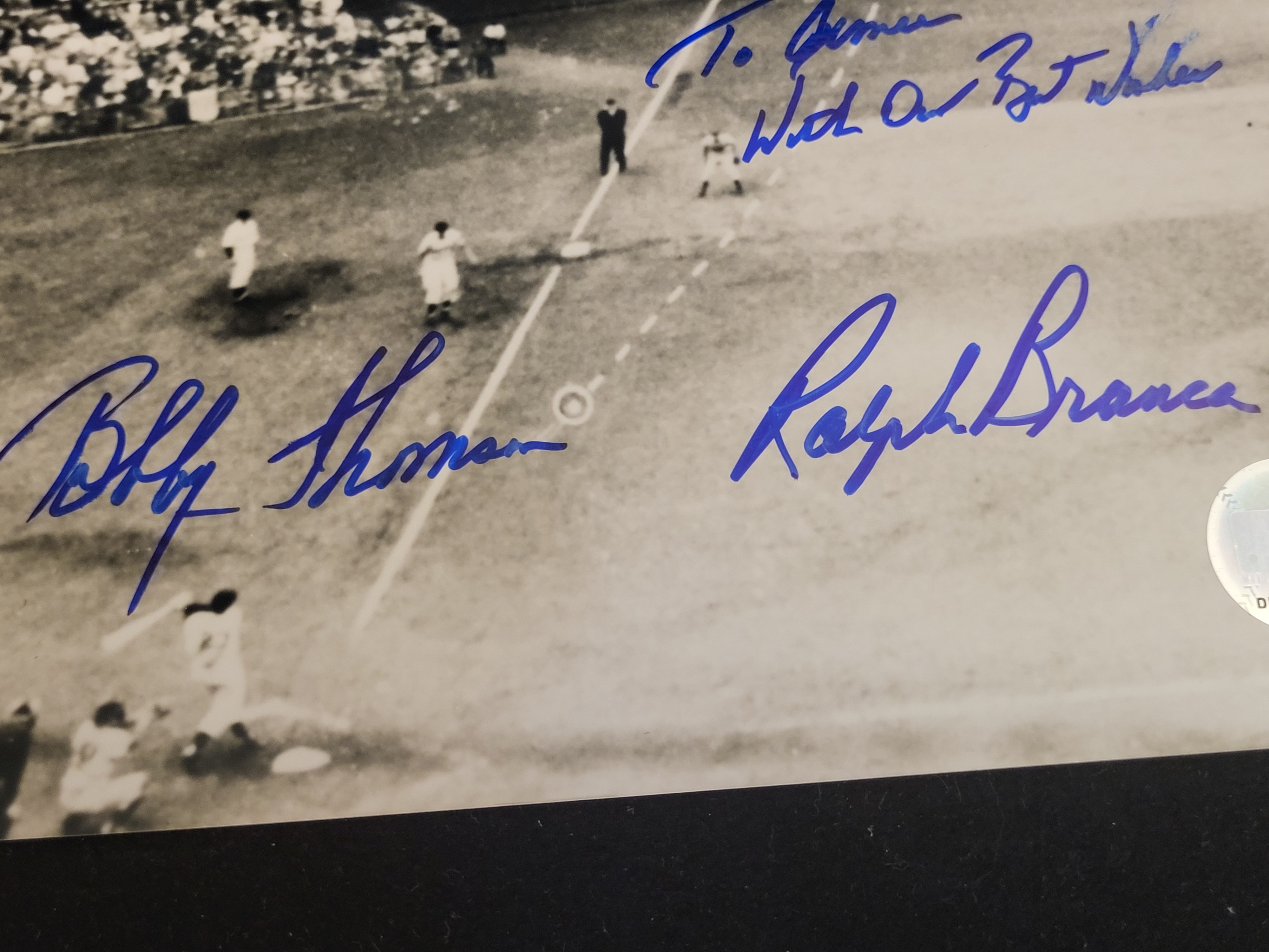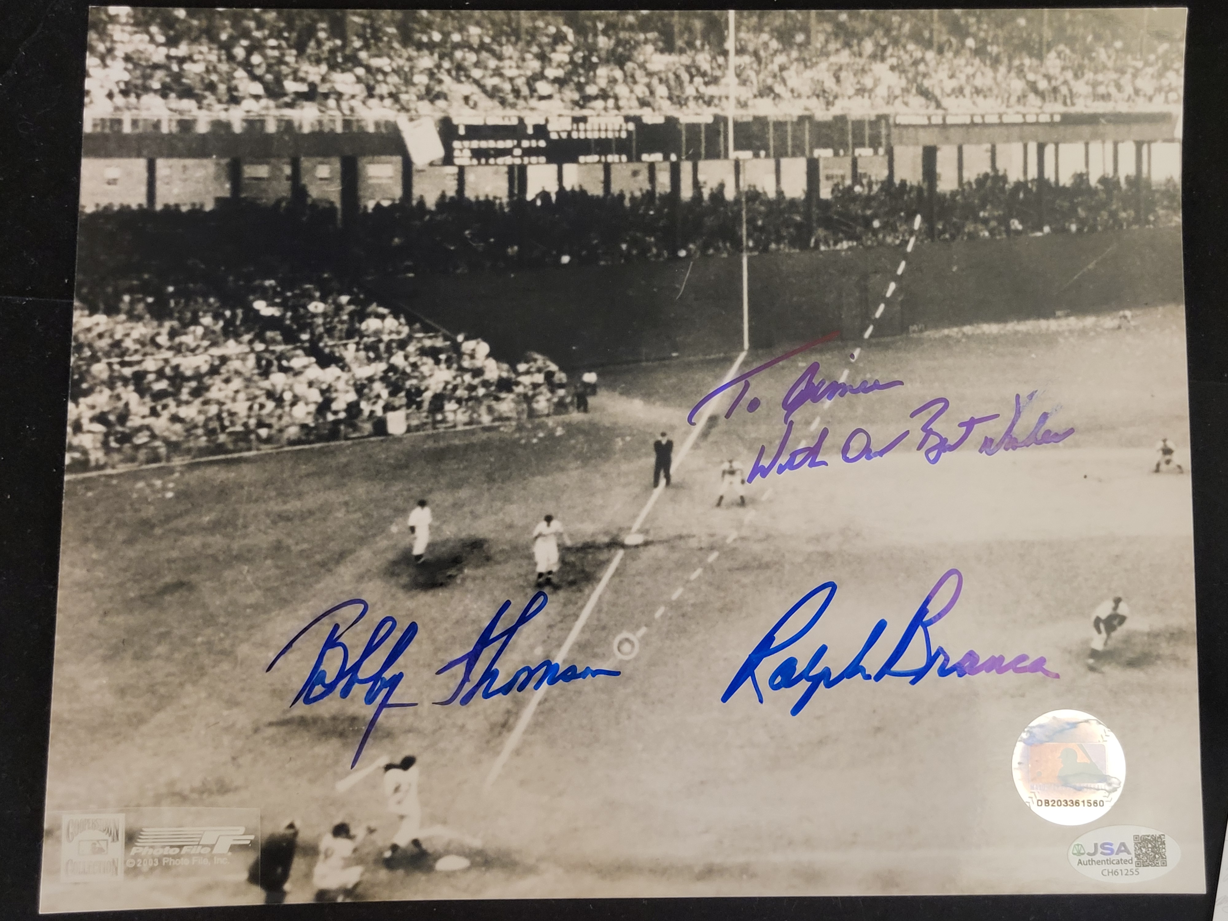 This professional 8" x 10" black and white photograph depicts one of the most iconic moments in Major League Baseball history: Bobby Thomson’s "Shot Heard ‘Round the World" during the 1951 National League Playoff at the Polo Grounds. The item is hand-signed in bold blue felt-tip marker by both central figures of the play: New York Giants outfielder Bobby Thomson and Brooklyn Dodgers pitcher Ralph Branca. The signatures are accompanied by a personalized inscription in the center that reads, "To Jimmie, With Our Best Wishes." This item is a licensed reproduction print from Photo File as part of the Cooperstown Collection, dated 2003. The piece is dual-authenticated for peace of mind. It includes a James Spence Authentication (JSA) Basic Certification card with a matching tamper-evident hologram (Certification Number: CH61255) and an official Major League Baseball (MLB) authenticated hologram sticker (Number: DB203361560). This photograph captures the historic walk-off three-run home run that secured the pennant for the Giants over their cross-town rivals.