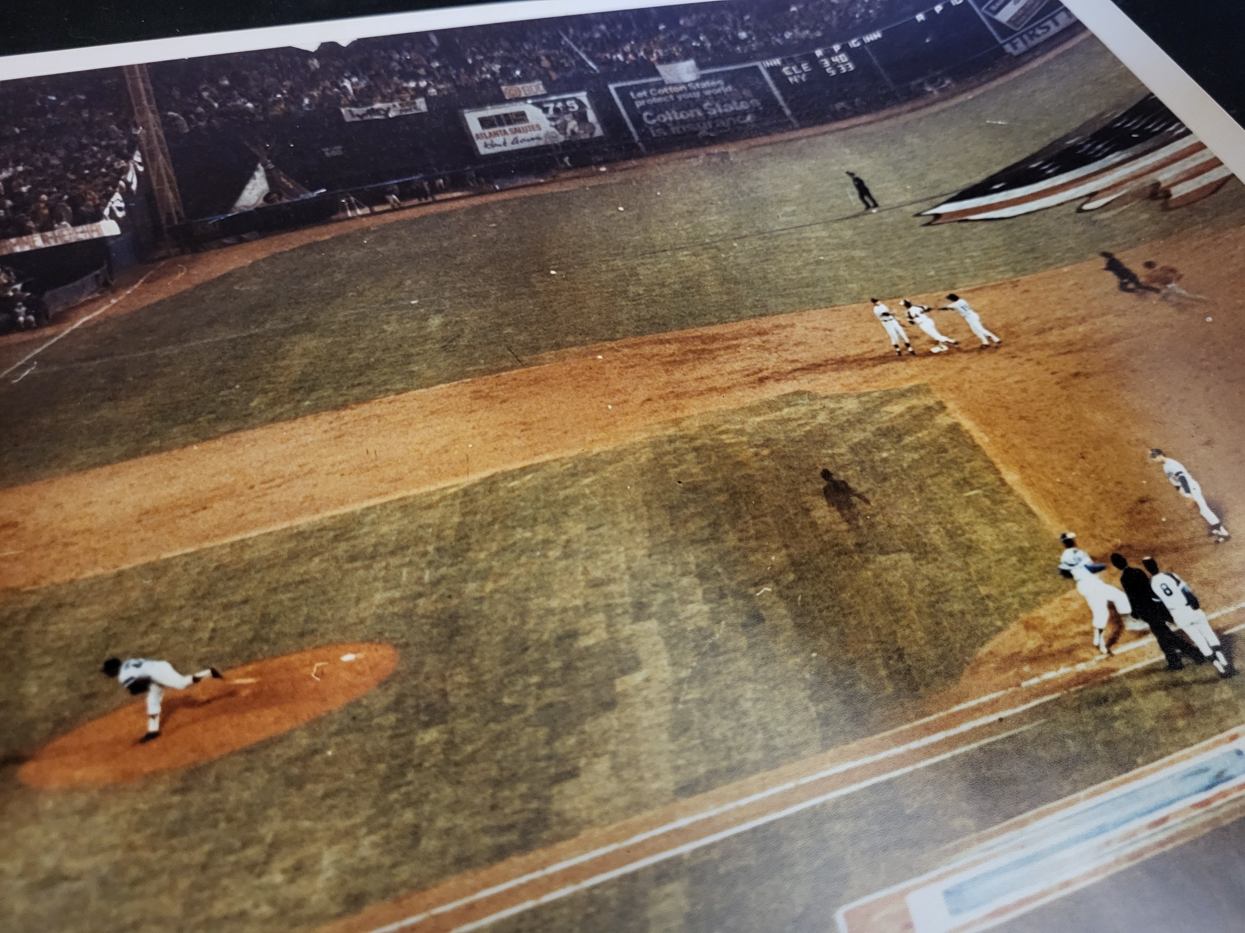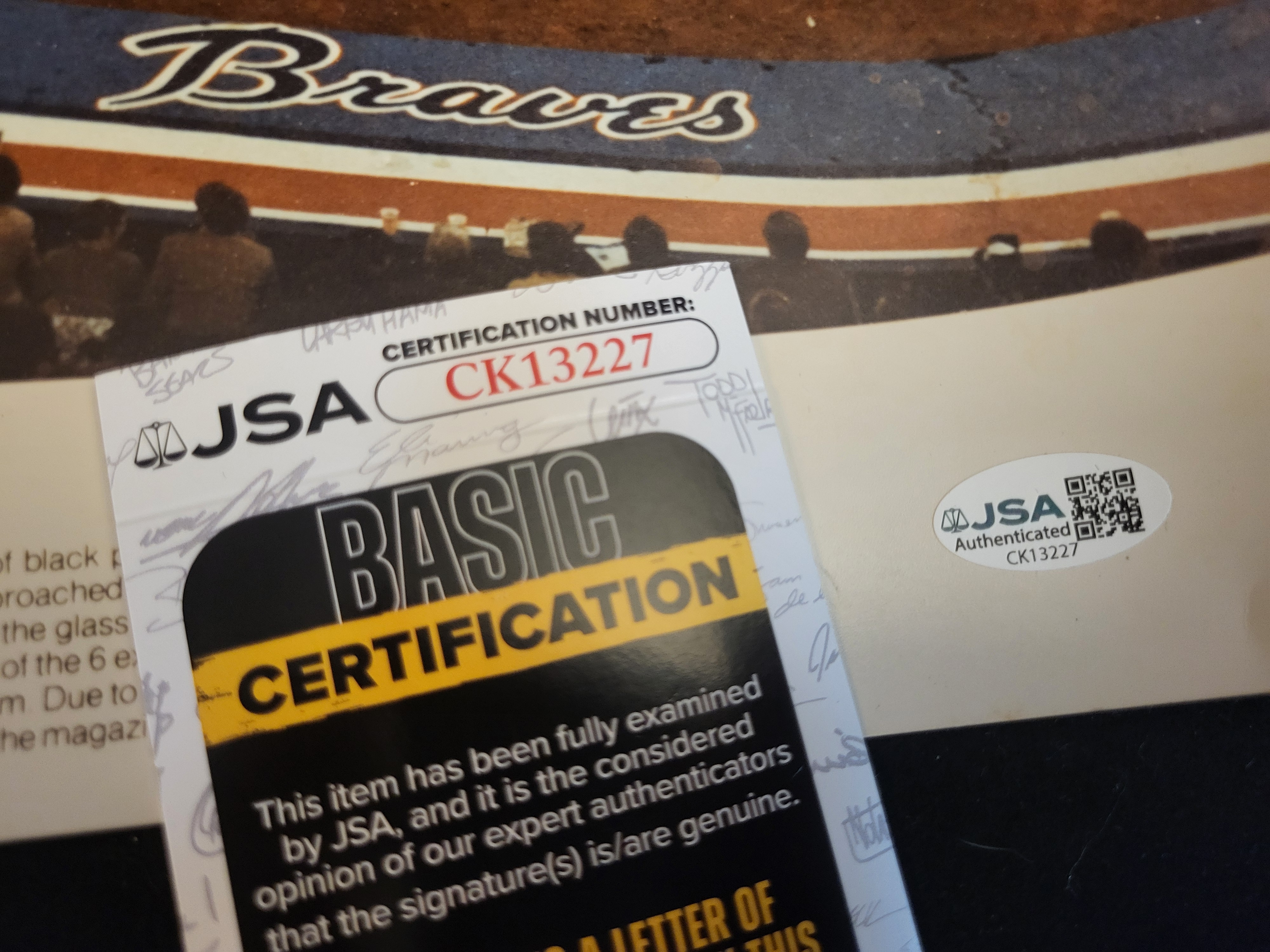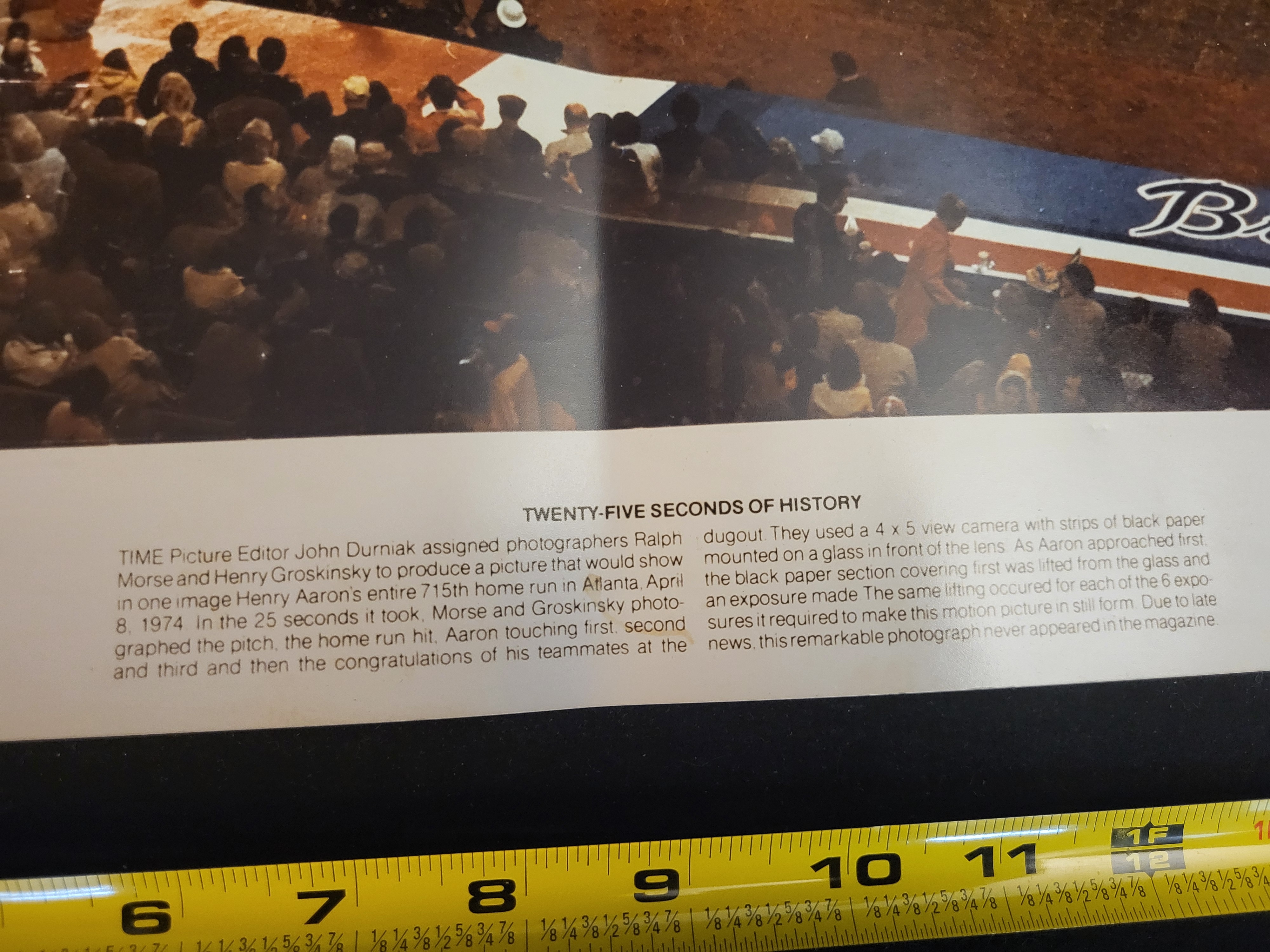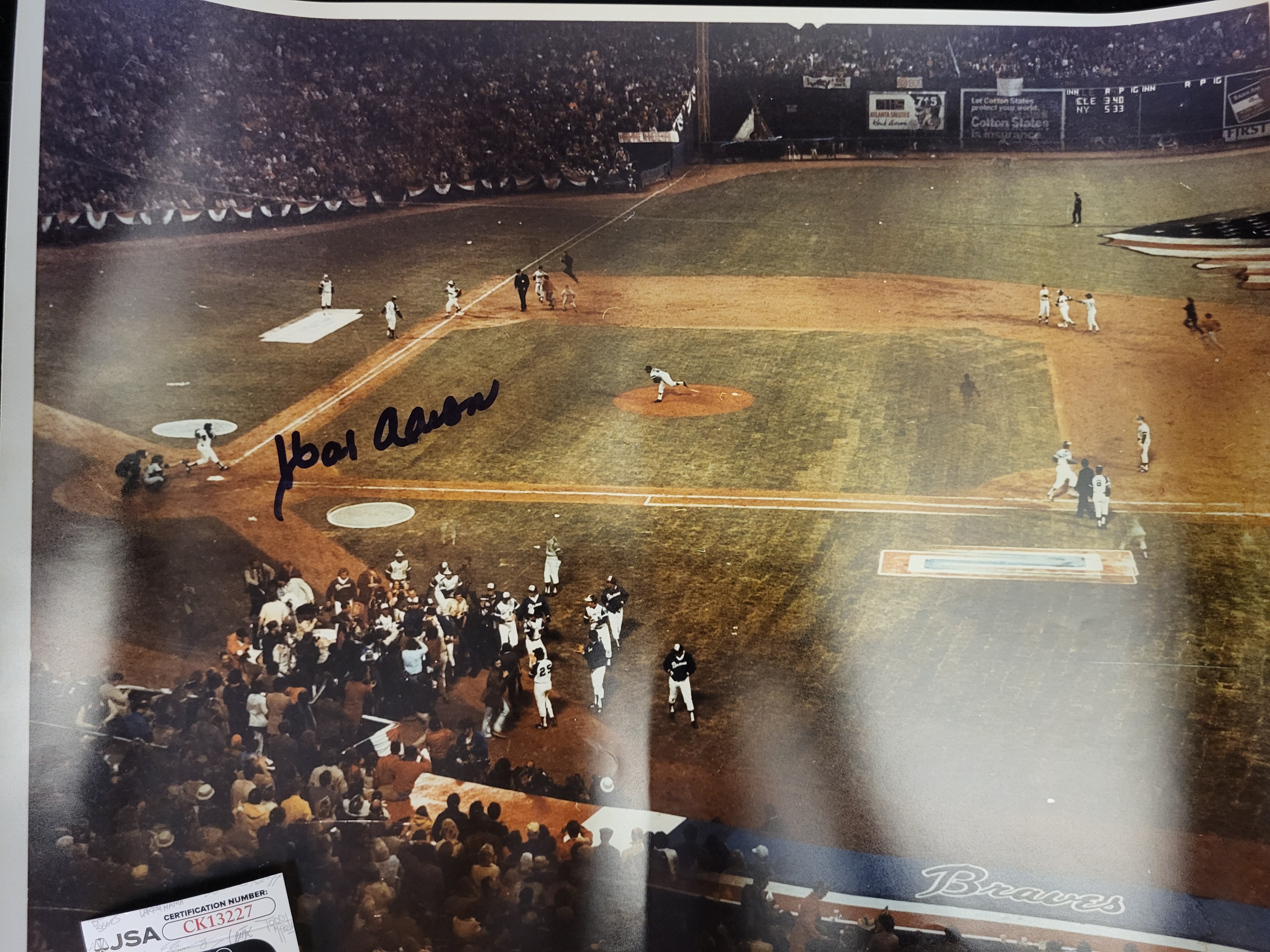 This lot features a significant piece of baseball history: a large-format color photography print titled Twenty-Five Seconds of History. The photograph is a remarkable technical achievement commissioned by TIME magazine editors and captured by photographers Ralph Morse and Henry Groskinsky. Using a complex multiple-exposure technique with a 4×5 view camera, the image captures the entire sequence of Atlanta Braves legend Hank Aaron’s record-breaking 715th career home run on April 8, 1974. The composite shows the pitch, the hit, Aaron rounding the bases, and the subsequent celebration at home plate at Atlanta-Fulton County Stadium, the moment he surpassed Babe Ruth’s long-standing record. The print is boldly hand-signed by Hank Aaron in black felt-tip marker across the center-left field area. The signature is fully authenticated by JSA (James Spence Authentication) with Basic Certification number CK13227. The lot includes the JSA Certificate of Authenticity (COA) card and a matching tamper-evident, serial-numbered sticker affixed to the lower-right corner of the print. Descriptive text at the bottom of the print provides a detailed history of the photograph’s creation. The print measures approximately 20 inches in width.