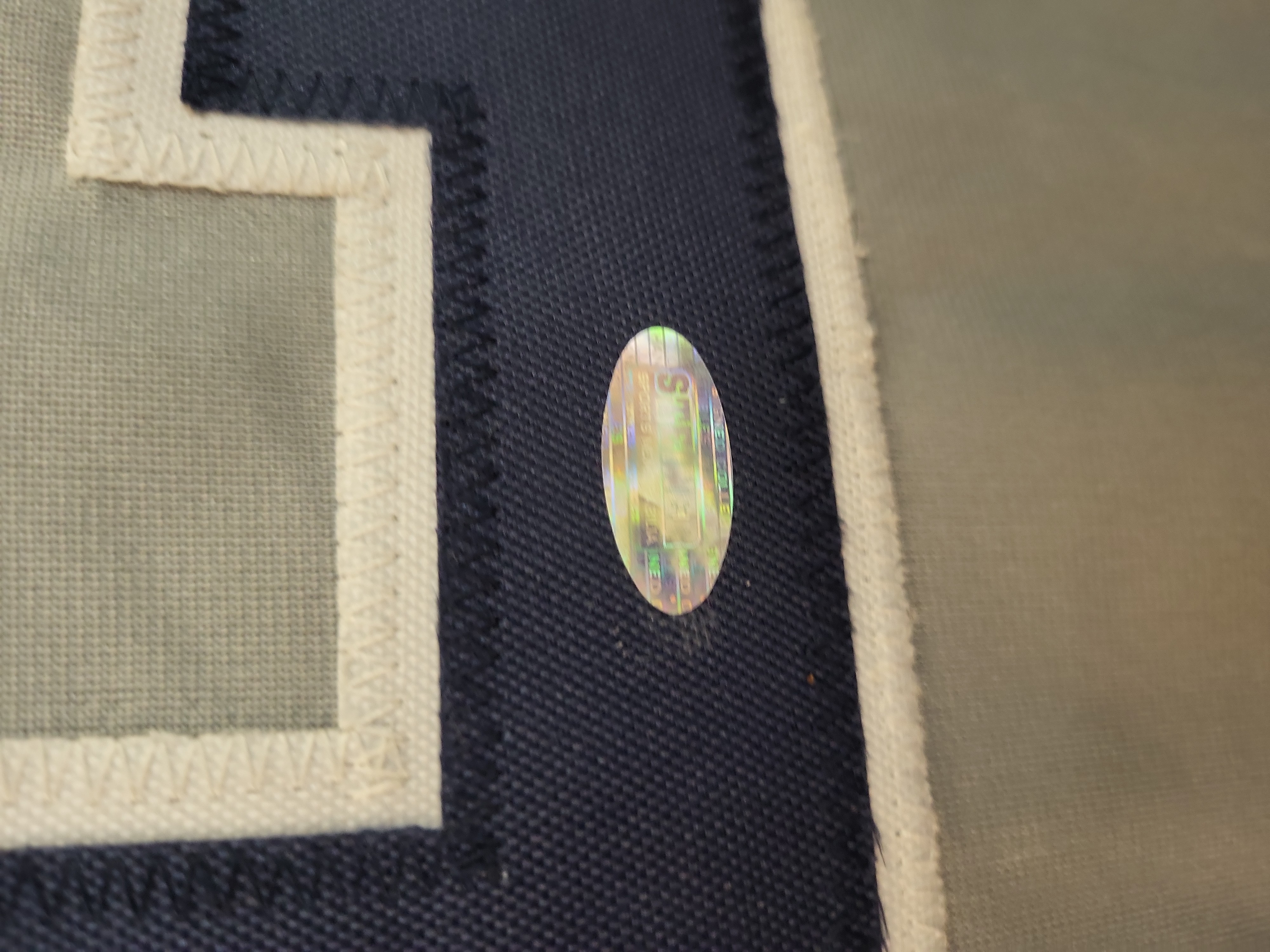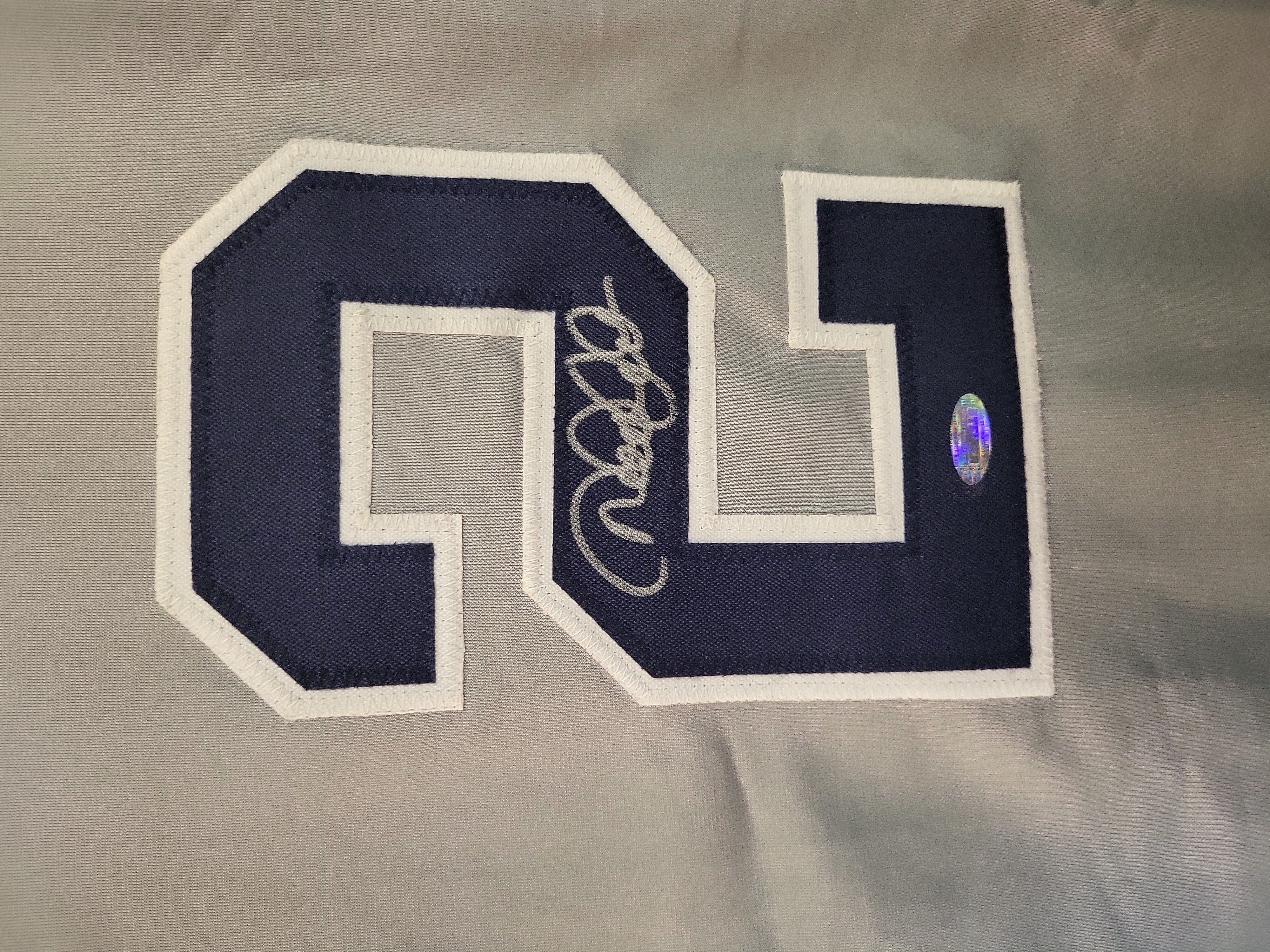 The jersey is in excellent condition, showing no signs of wear, fading, or fabric damage. The silver paint pen signature is bold and vibrant, with no evidence of smudging or ink degradation. The tackle twill numbering and commemorative patches remain crisp and securely attached.