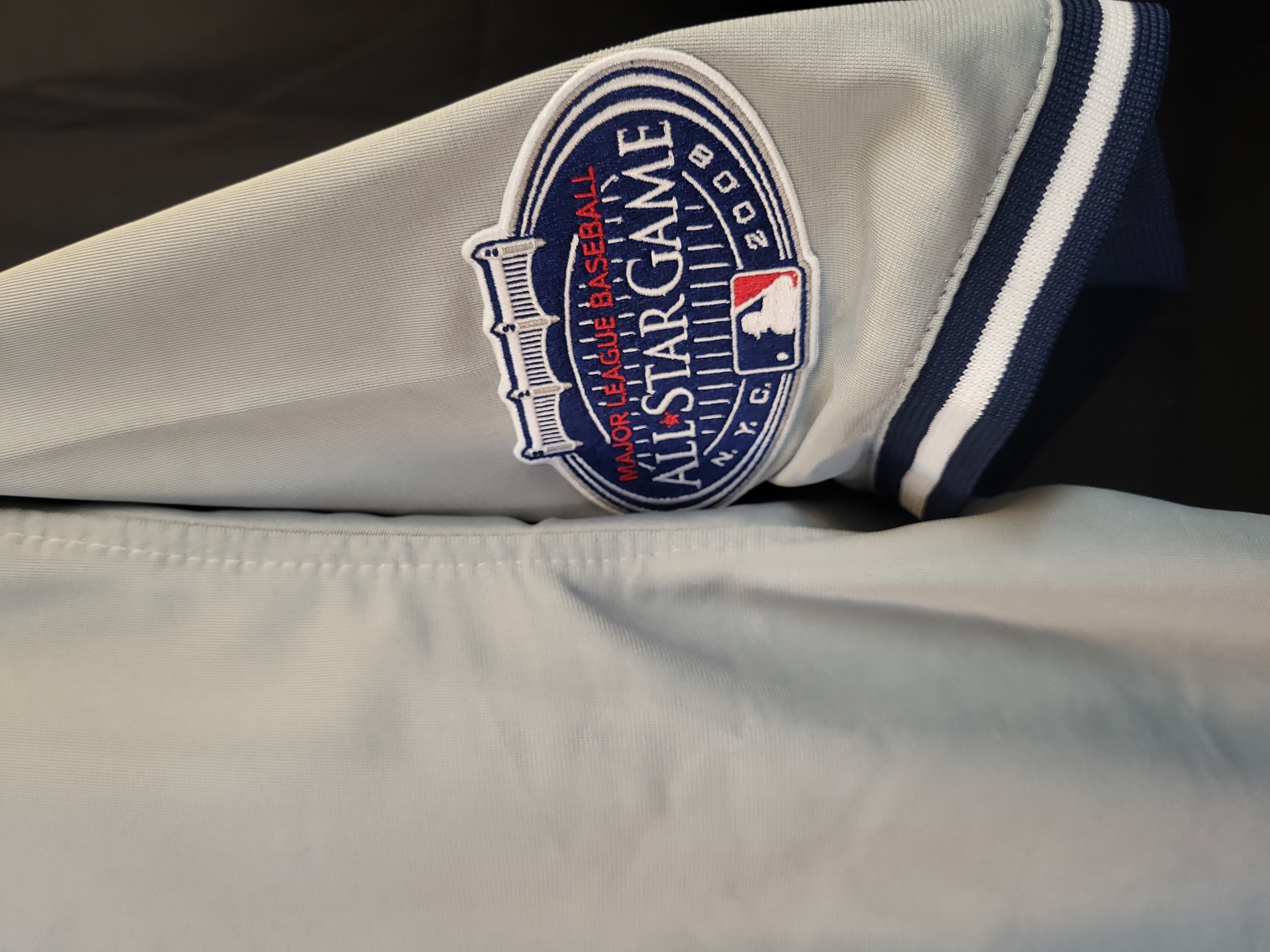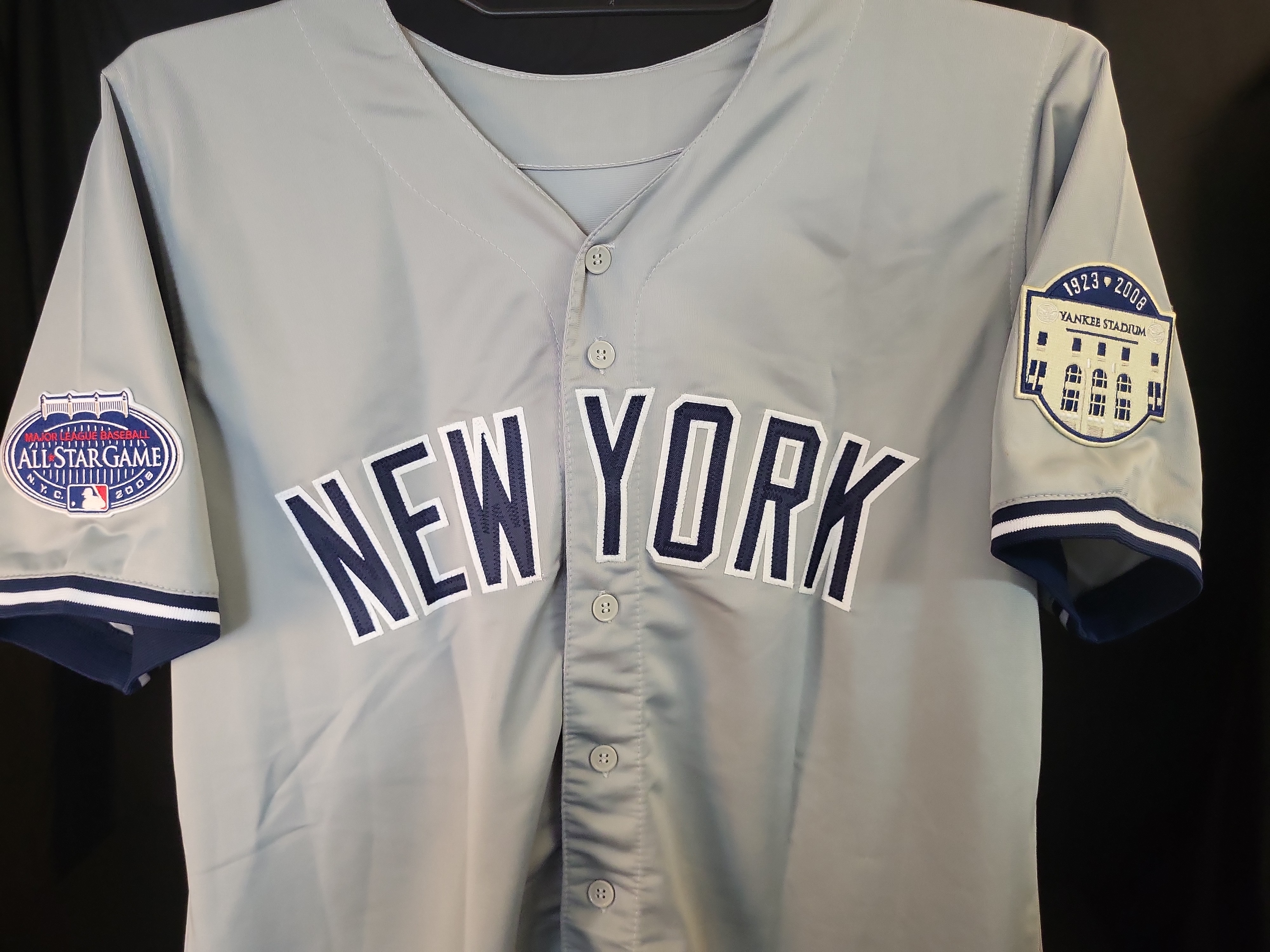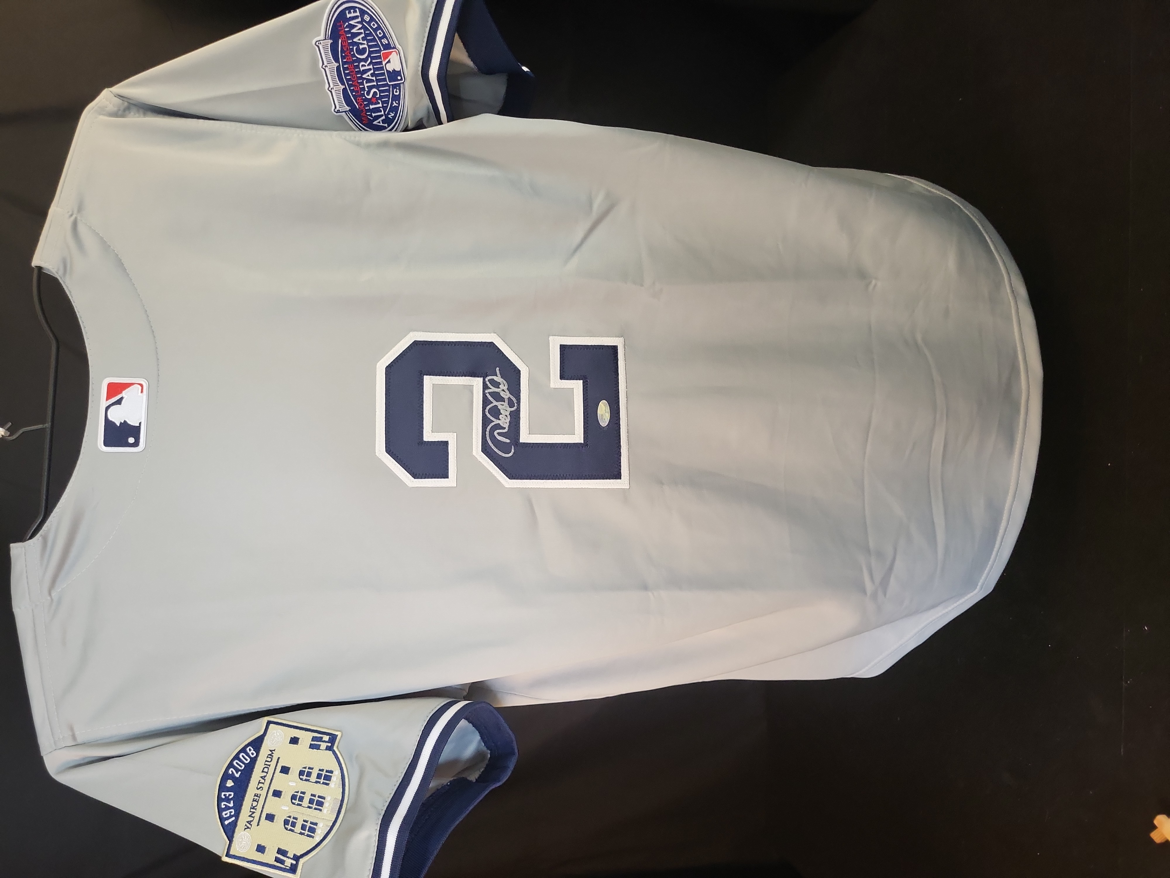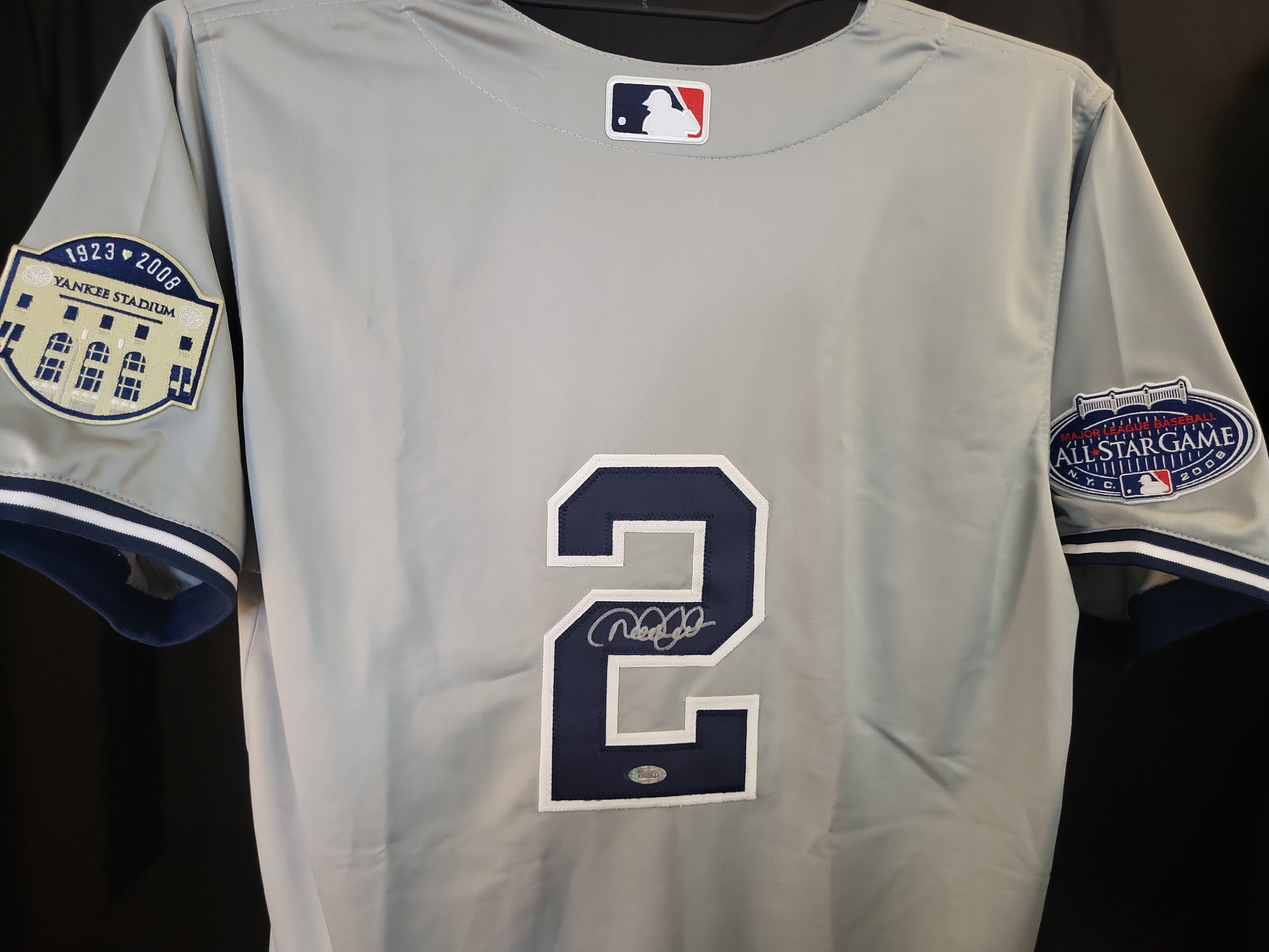 This professional-style gray road jersey commemorates Hall of Fame shortstop Derek Jeter and the 2008 MLB All-Star Game, which served as the final Midsummer Classic held at the original Yankee Stadium. The jersey features "NEW YORK" across the chest in navy-on-white tackle twill, with Jeter’s iconic number "2" on the reverse in matching tackle twill. The garment is adorned with two significant commemorative patches: the 1923–2008 Yankee Stadium "Final Season" patch on the left sleeve and the official 2008 MLB All-Star Game N.Y.C. logo patch on the right sleeve. An official MLB logo patch is situated on the back collar. The jersey is boldly signed by Derek Jeter in silver paint pen across the reverse number "2." The signature is clear, well-placed, and authenticated by a Steiner Sports hologram (serial number visible) located on the lower portion of the number "2." Steiner Sports was the long-term exclusive autograph partner for Derek Jeter, providing ironclad provenance for the signature. This is a high-quality commemorative piece produced for the memorabilia market and is not a game-used item.