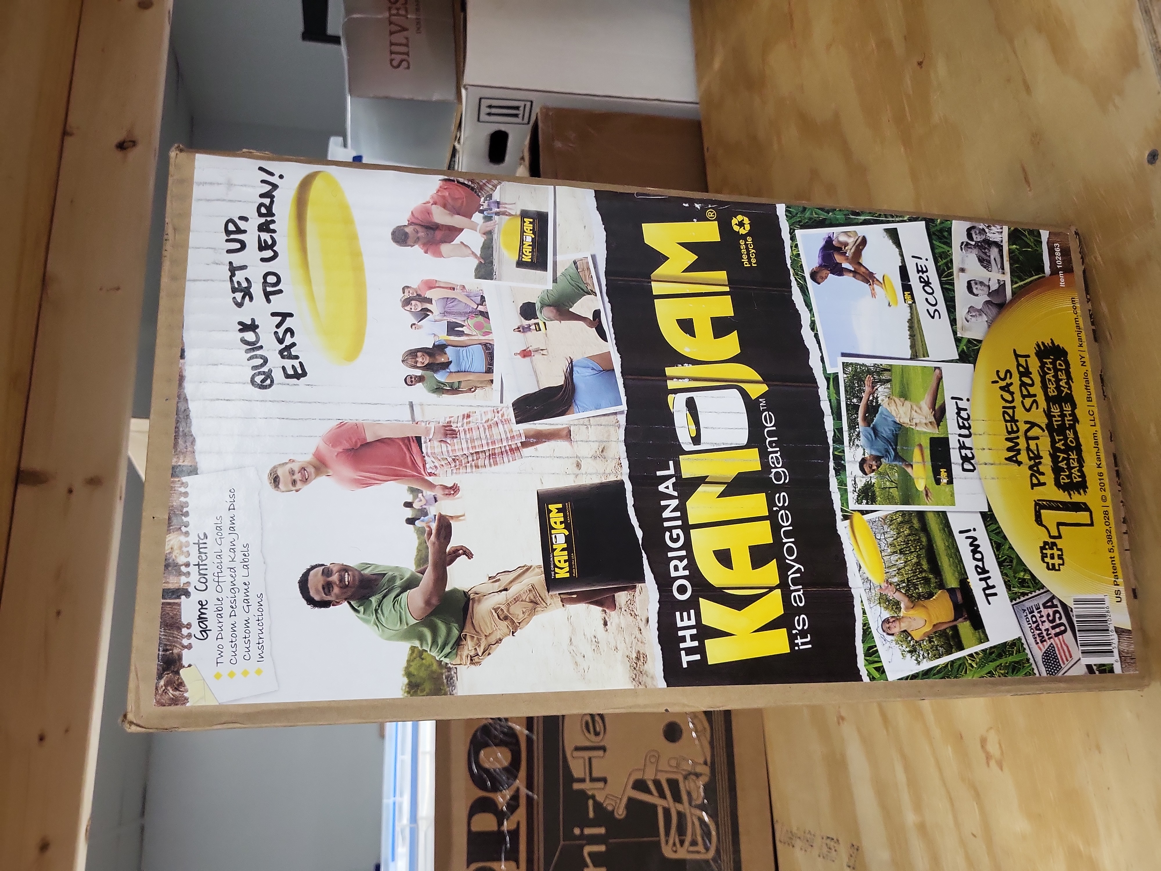 Manufactured by KanJam, LLC of Buffalo, New York, this is a retail-boxed set of The Original Kan Jam, a four-player outdoor flying disc game. The set consists of plastic components housed in a color-printed cardboard box. According to the printed contents list, the package includes two durable official goals, one custom-designed Kan Jam disc, custom game labels, and an instruction manual. The box features action graphics of the game being played and includes a Proudly Made in the USA logo. The front of the packaging is marked with the copyright date of 2016 and the tagline it’s anyone’s game.