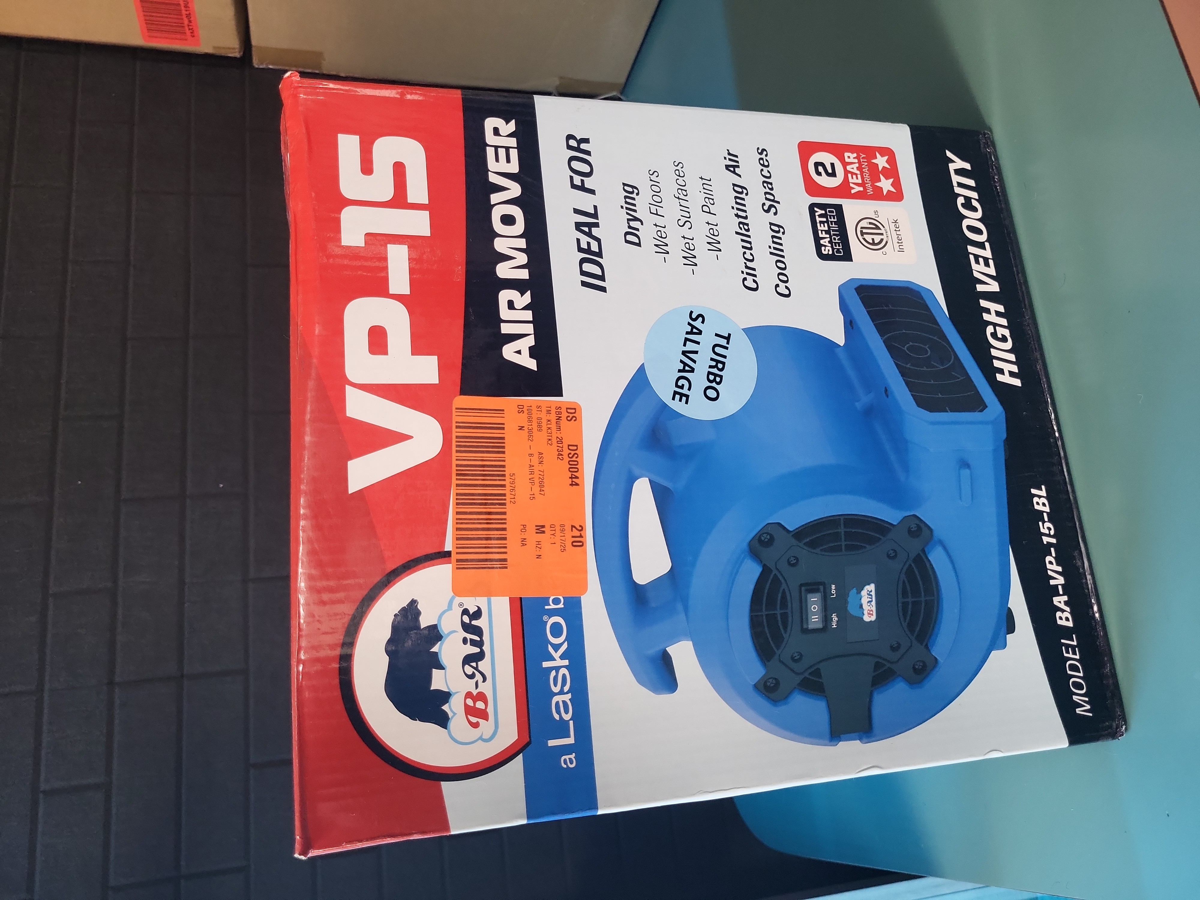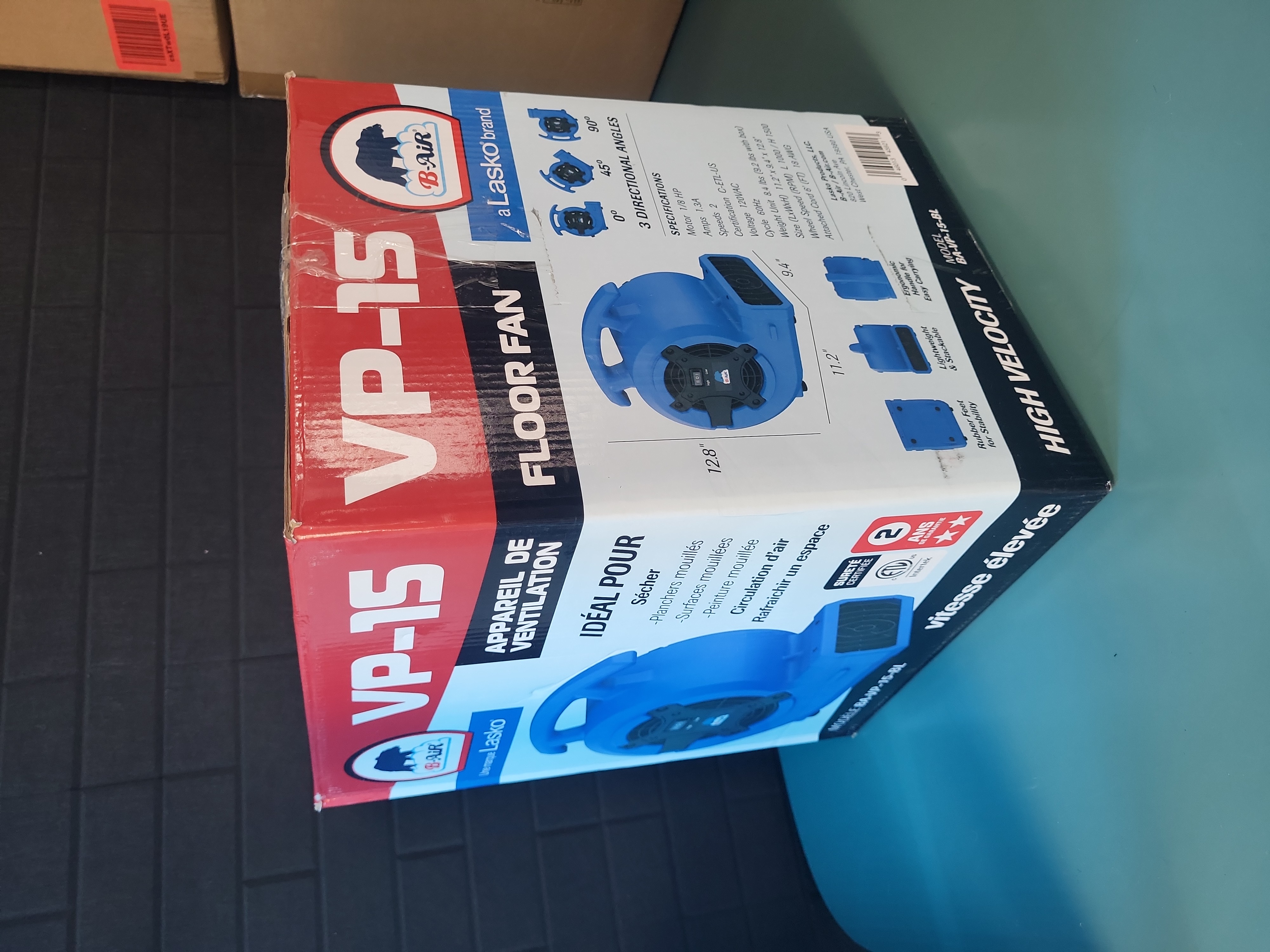 Manufacturer: B-Air (a Lasko brand). Model: BA-VP-15-BL. Capacity: 1/8 HP. This high-velocity floor fan is designed for professional restoration, drying, and ventilation tasks. Features include a two-speed control (Low/High), three directional airflow angles (0, 45, and 90 degrees), and a stackable design for efficient storage. The unit is equipped with an ergonomic carrying handle, rubber feet for stability, and an attached 6-foot power cord. Electrical specifications: 1.3 Amps, 120VAC, 60Hz. ETL safety certified. 11.2 x 9.4 x 12.8 inches.