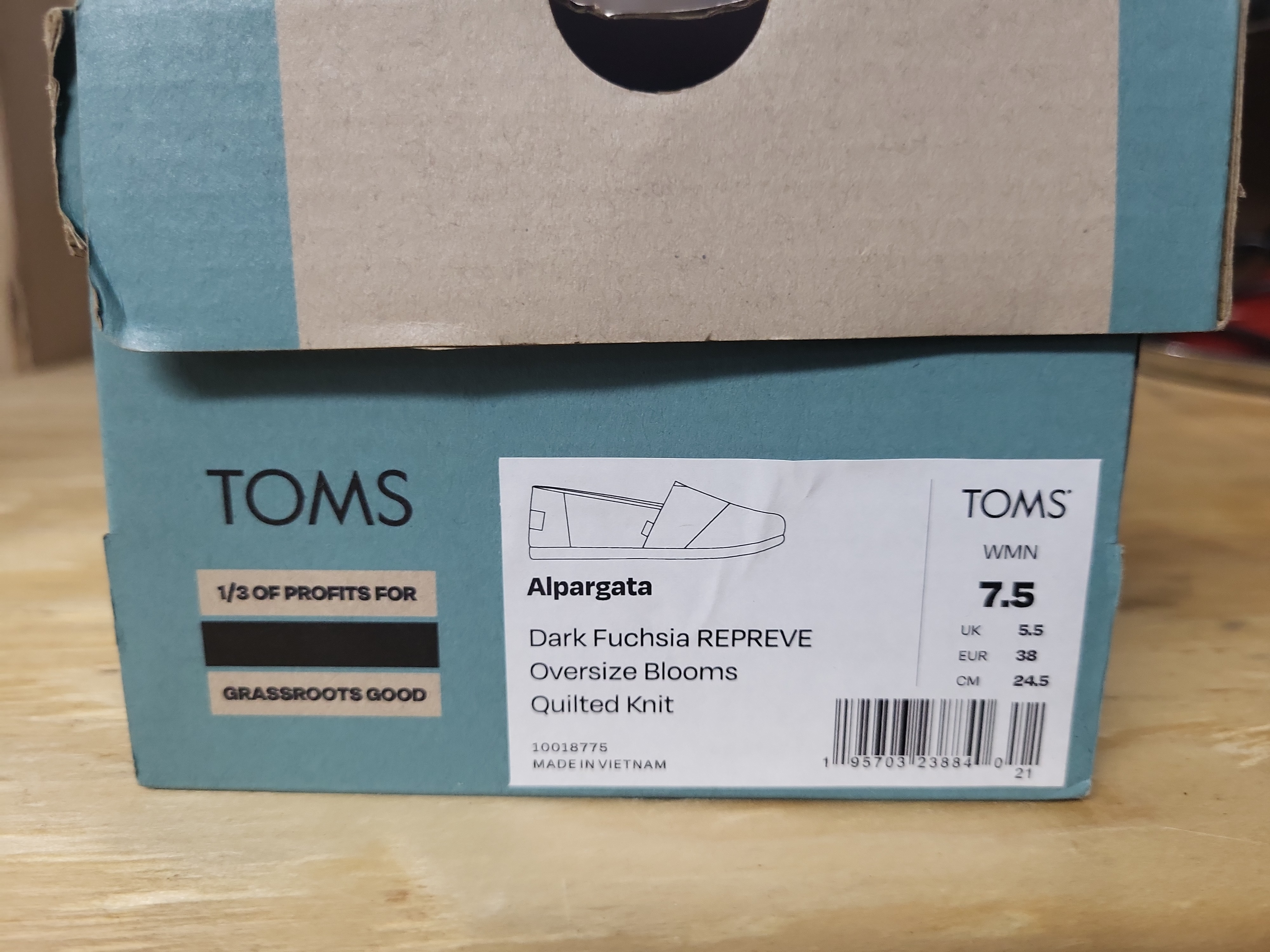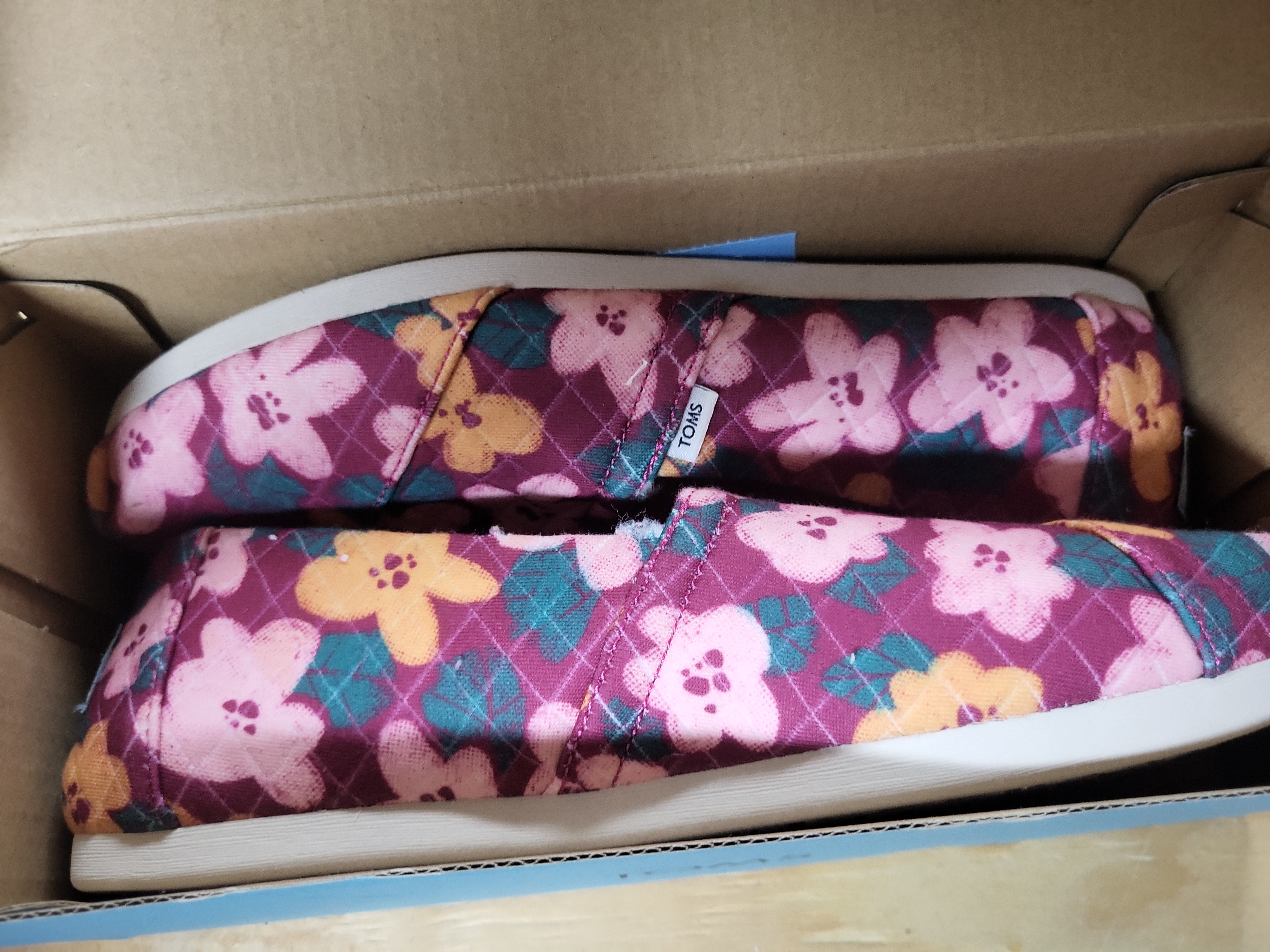 A pair of TOMS Alpargata slip-on shoes in women’s size US 7.5, UK 5.5, EUR 38, and CM 24.5. The uppers are constructed from Dark Fuchsia REPREVE recycled polyester quilted knit featuring an Oversize Blooms floral pattern in shades of pink, yellow, and teal. These flat shoes feature a synthetic sole and the signature TOMS fabric tag on the outer side. The item includes the original manufacturer’s box.