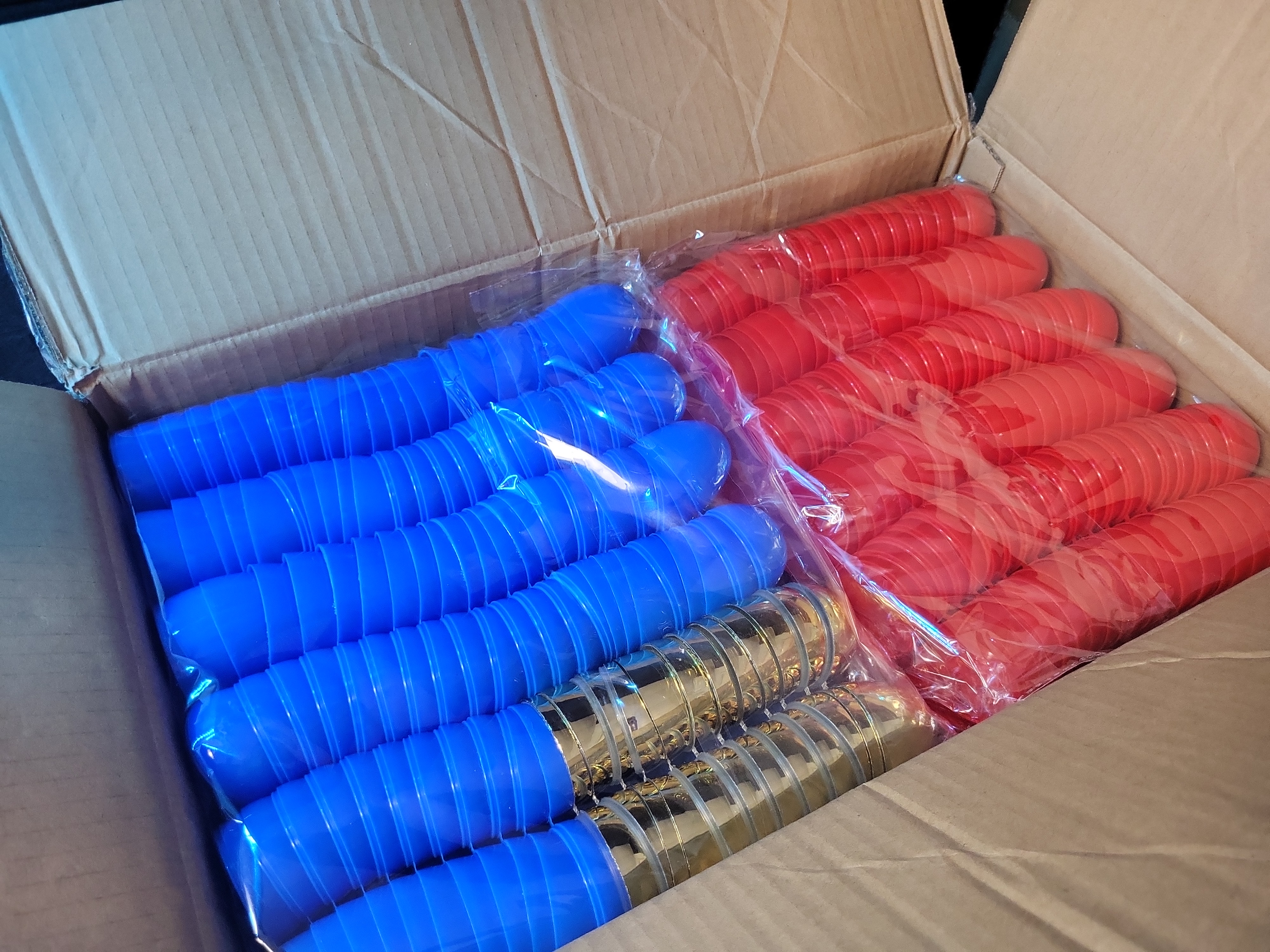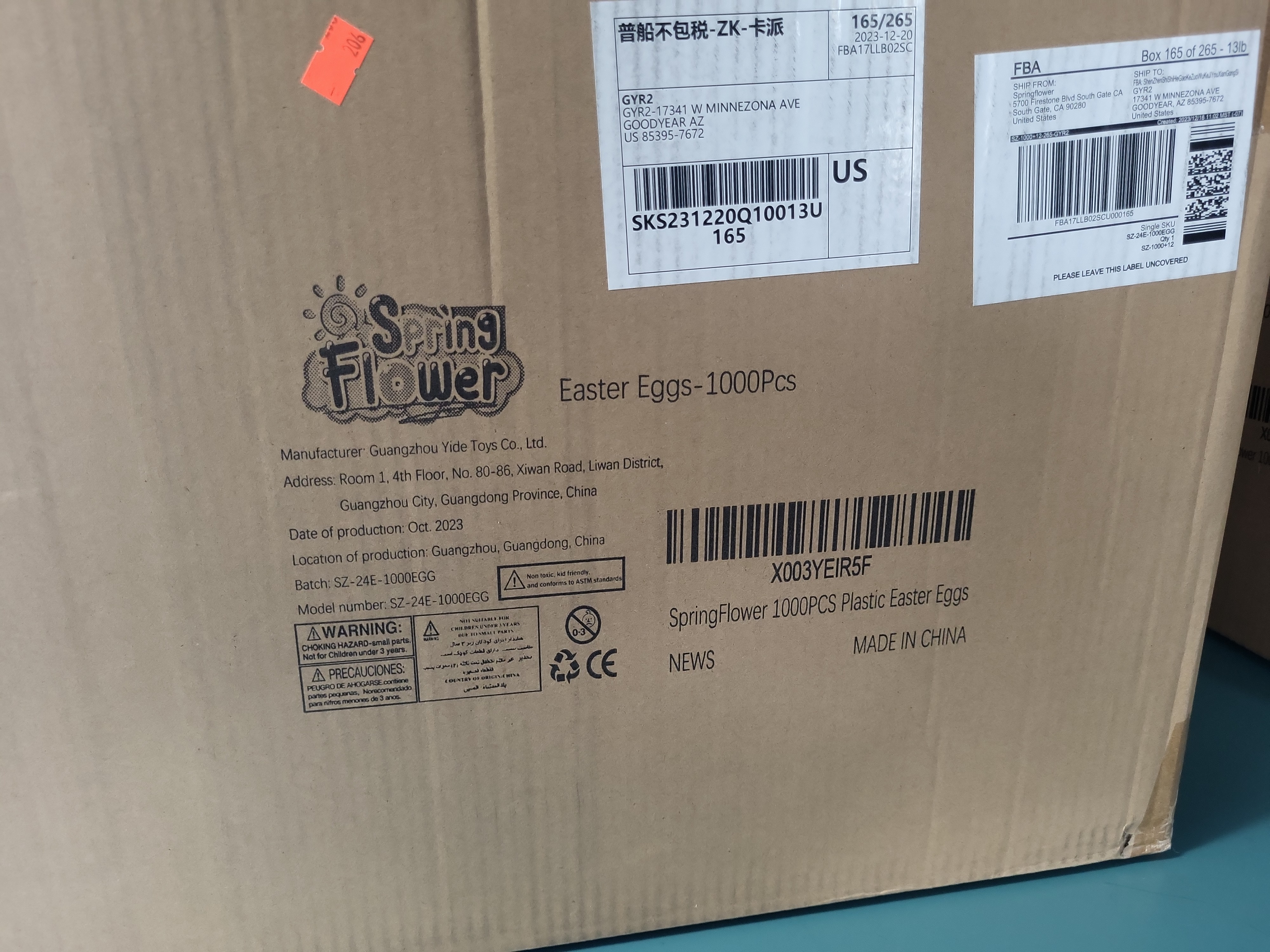 This wholesale lot features a large quantity of plastic Easter eggs from the brand SpringFlower. The collection includes 1,000 pieces of nested plastic egg halves in blue, red, and gold colors. The items were manufactured by Guangzhou Yide Toys Co., Ltd. (Model number: SZ-24E-1000EGG) with a production date of October 2023. These eggs are ideal for large-scale holiday events, community egg hunts, or retail resale. The contents are organized in clear plastic sleeves and housed within the original manufacturer’s cardboard shipping carton.