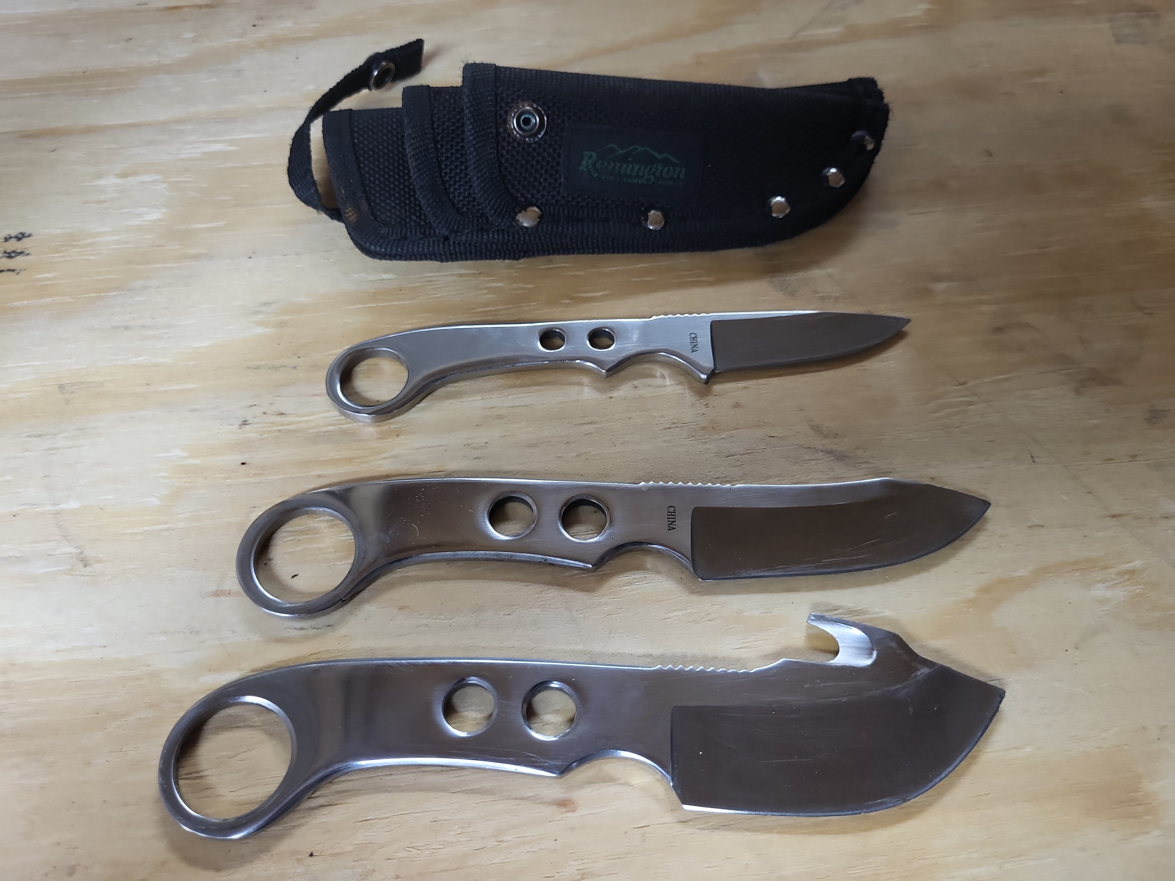 A Remington Sportsman Series three-piece field dressing set. This set includes a caping knife, a drop-point utility knife, and a large skinning knife featuring an integrated gut hook on the spine. Each knife is constructed from a single piece of polished stainless steel with a skeletonized handle design. The handles feature a large finger ring at the pommel and two circular cutouts for weight reduction. The spines include jimping for improved thumb control. The tangs are stamped CHINA. The set is housed in a black woven nylon multi-knife sheath with a Remington Sportsman Series embroidered patch. Blade lengths are approximately 2.5 inches, 3.5 inches, and 4 inches.