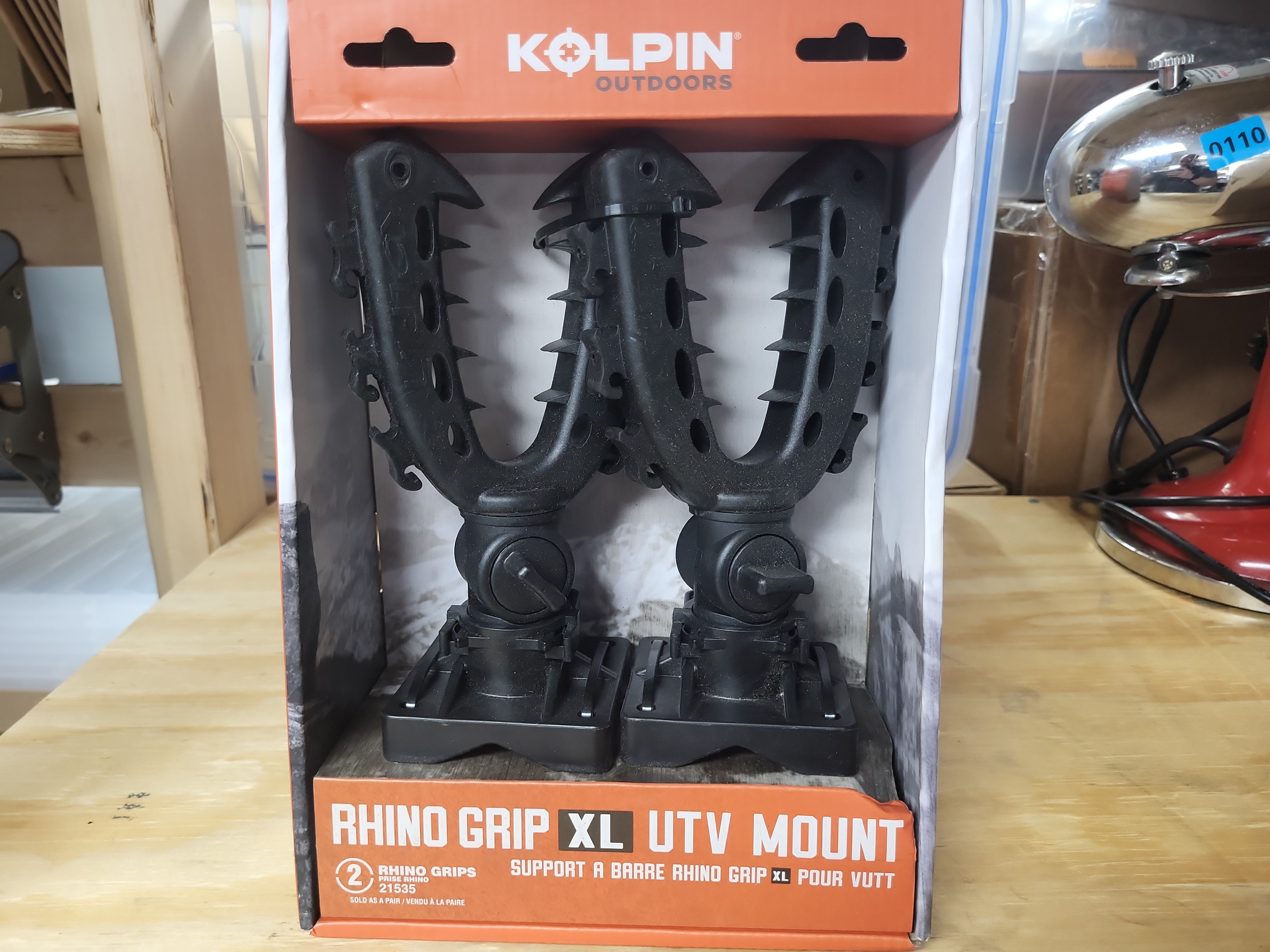 Manufacturer: Kolpin Outdoors. Model: Rhino Grip XL, Part Number 21535. Serial Number: N/A. Caliber: Universal. Action: N/A. Barrel Length: N/A. Stock: Heavy-duty black synthetic flexible grips with integrated notched teeth and adjustable plastic bases. This universal gear transport mount features 360-degree rotation and a tilting design adjustable up to 160 degrees in 40-degree increments. It includes a Kwik-Clip design for rapid rotation or removal of the grip from the base. Mounting is compatible with flat surfaces or round tubing from 5/8 inch to 2 inches. Rated for up to 15 lbs of transport weight. Legal disclaimer: All applicable laws apply to purchase and transfer.