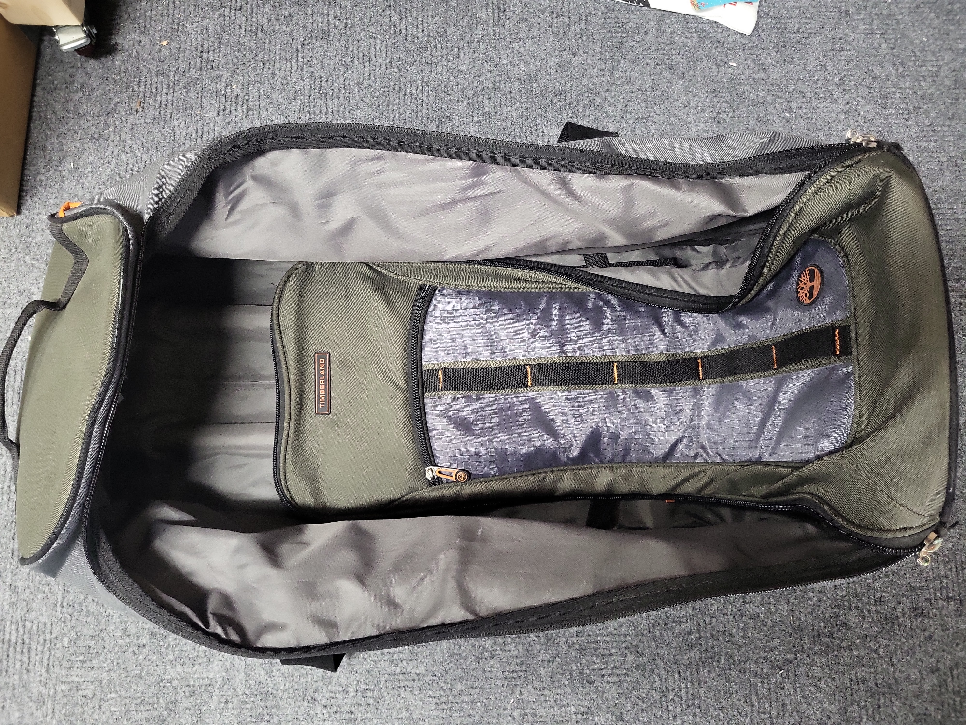 BID PER WHAT YOU SEE IN THE PHOTO, NOT THE AI GENERATED TITLES AND DESCRIPTIONS! Timberland Large Rolling Duffel Bag, Synthetic Canvas, Olive and Gray