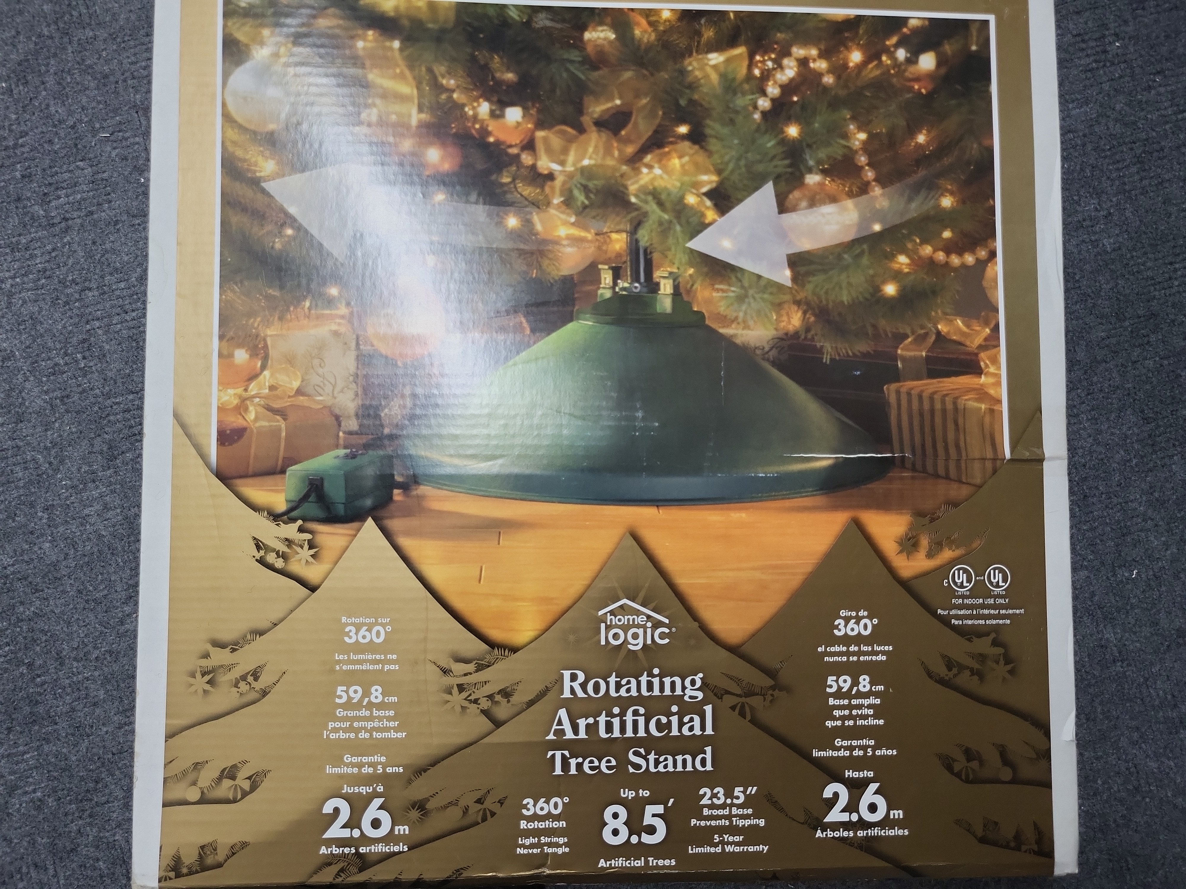 This contemporary rotating artificial tree stand is manufactured by Home Logic for holiday use. The unit features a 360-degree rotation mechanism designed to showcase a decorated tree while preventing light strings from tangling. It is engineered to support artificial trees up to 8.5 feet in height and features a broad base for stability. The stand is UL listed for indoor use and is contained within its original retail packaging with specifications provided in English, French, and Spanish. Base diameter: 23.5 inches.