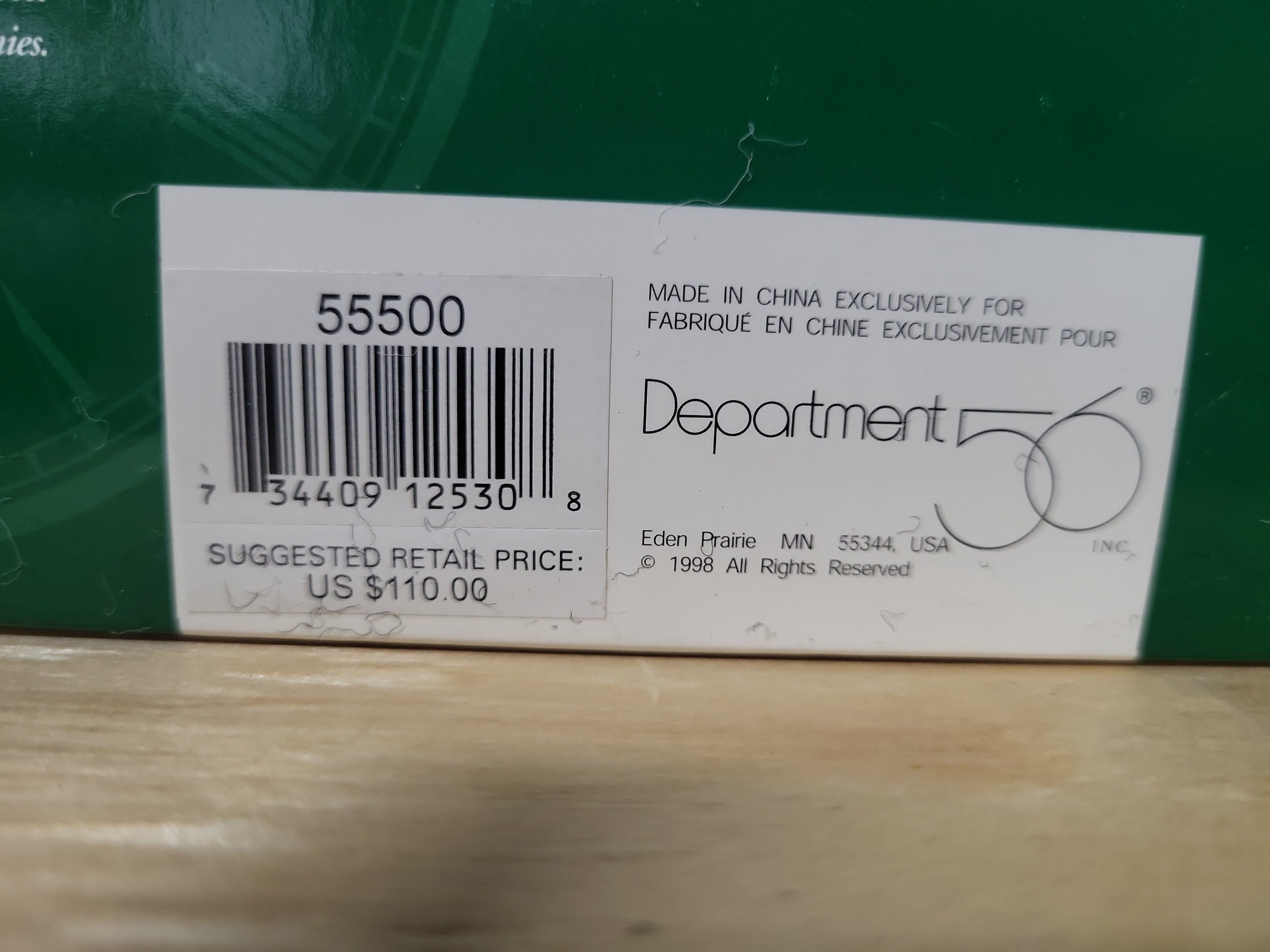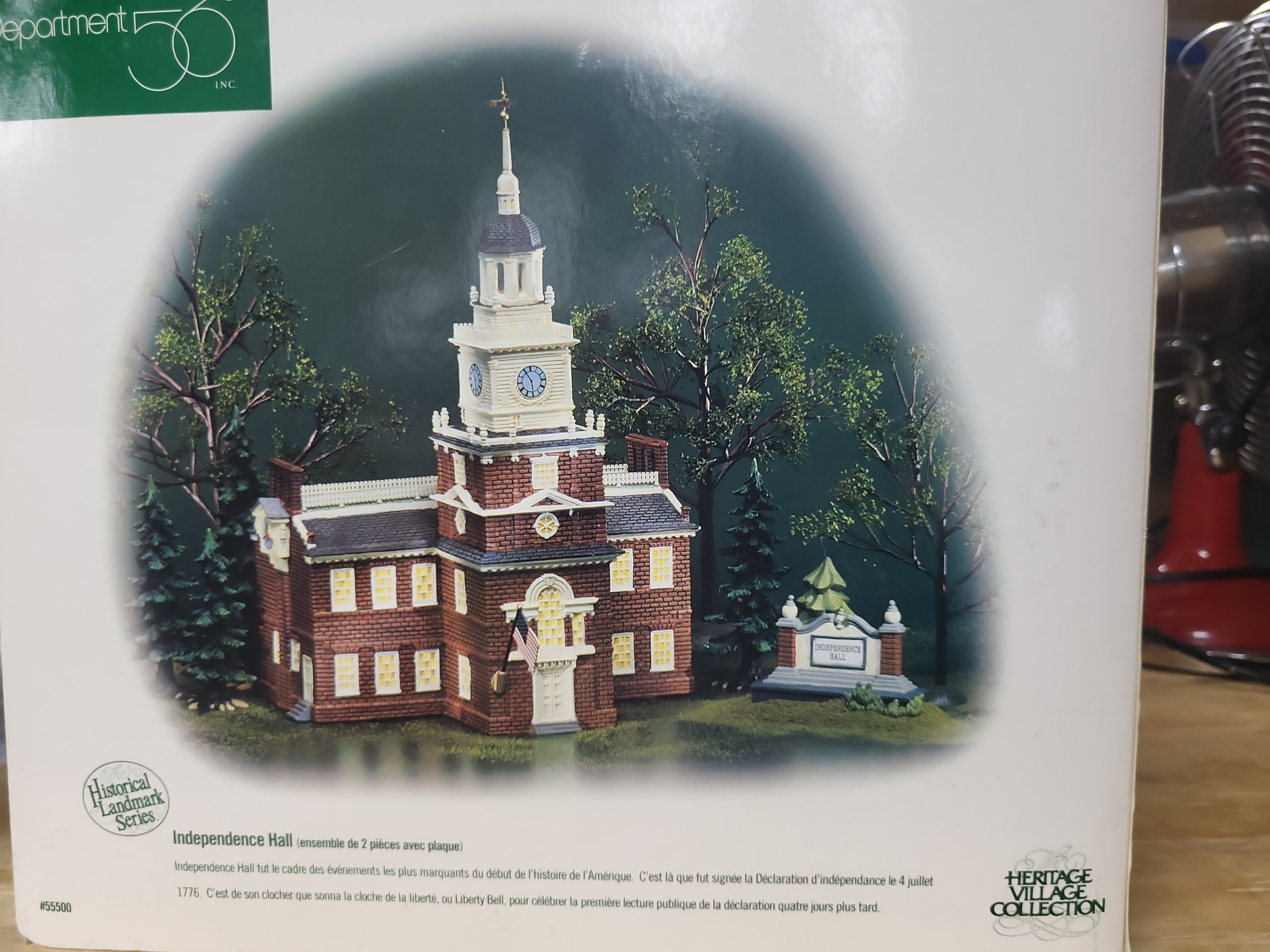 Manufactured by Department 56, this hand-painted porcelain architectural miniature depicts Philadelphia’s Independence Hall. The item is part of The Historical Landmark Series within the Heritage Village Collection. This two-piece ensemble includes the primary building and a separate commemorative plaque. The miniature features a detailed red brick facade, a multi-tiered white steeple with a clock face, and a small American flag detail near the entrance. The item is designed for internal illumination via a standard clip-on light cord. The box features the Department 56 green square logo, The Historical Landmark Series circular seal, and the Heritage Village Collection logo. A manufacturer’s sticker identifies this as item #55500, made in China exclusively for Department 56, Inc. of Eden Prairie, Minnesota, with a copyright date of 1998.