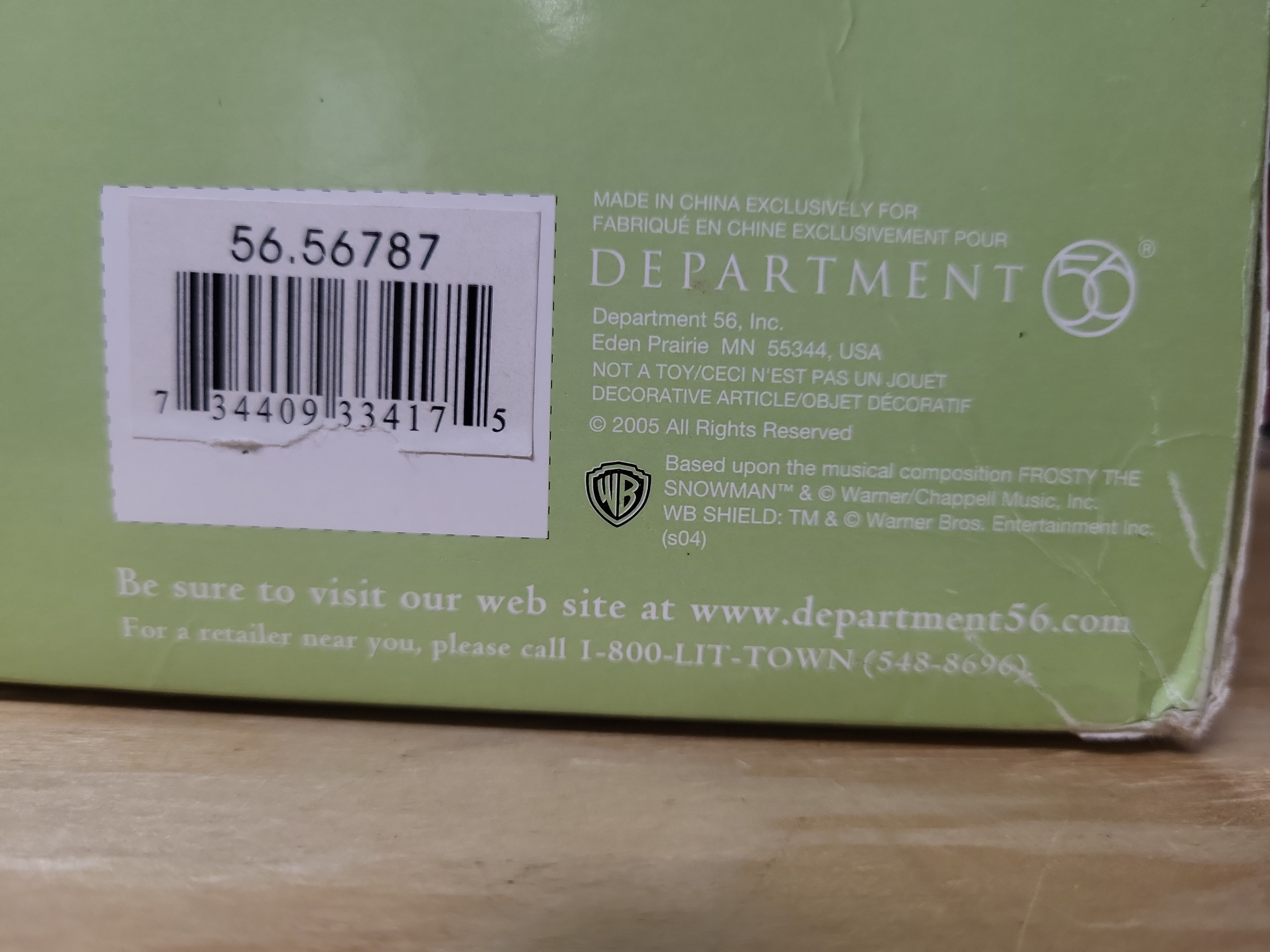 Manufactured by Department 56, this Frosty’s Christmas Weather Station is a decorative holiday village building from the North Pole Series. Released in 2005, this piece is constructed of hand-painted porcelain and features official licensing from Warner Bros. Entertainment Inc. based on the Frosty the Snowman character. The whimsical design includes a blue multi-level structure with snow-capped roofs, a weather vane, red flags, and a prominent black top hat facade. The building is designed for internal illumination. Markings on the packaging include the Department 56 logo, item number 56.56787, and copyright dates for 2005.