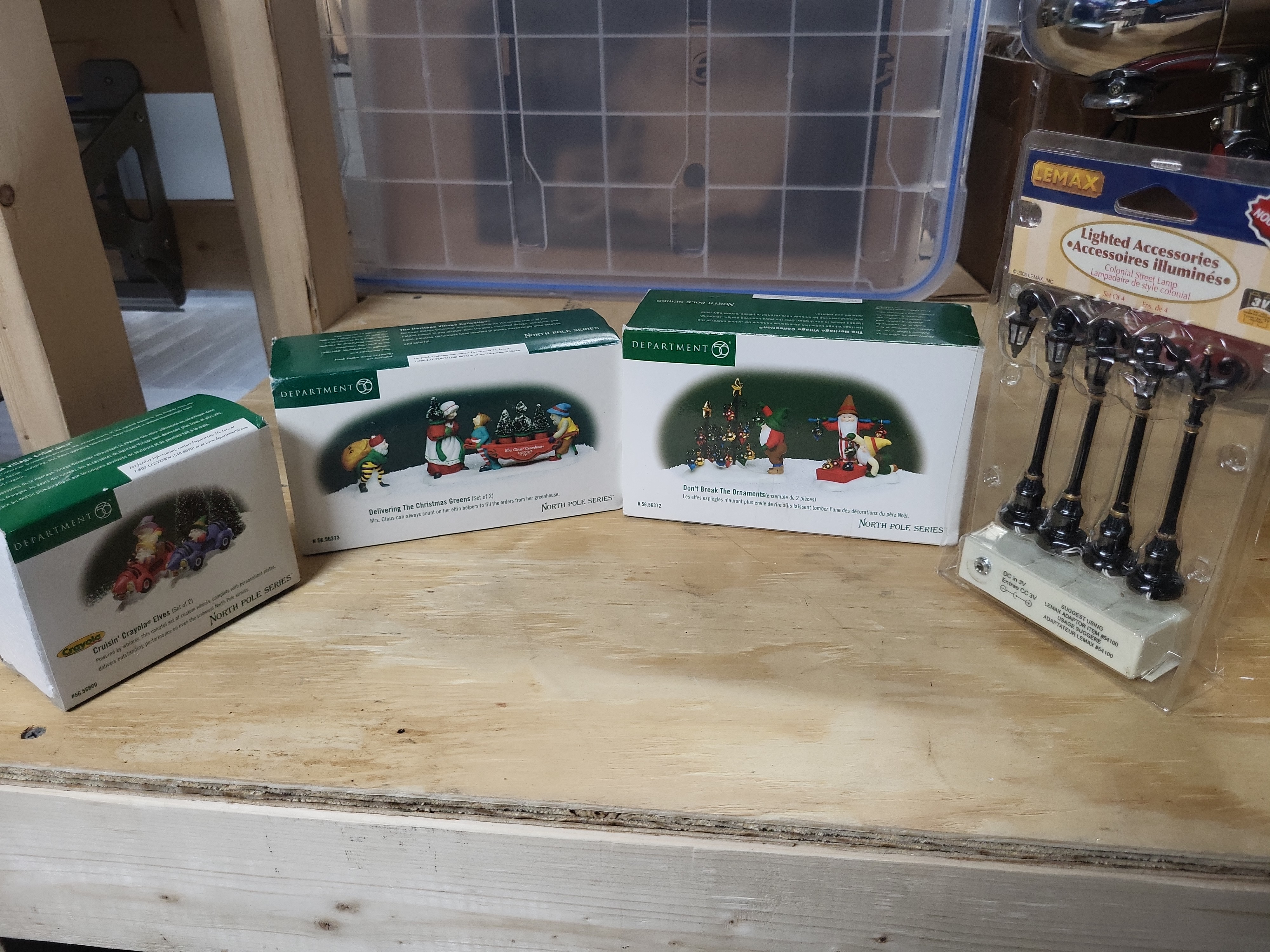 This collection features four sets of miniature village collectibles manufactured by Department 56 and Lemax. The Department 56 items are part of the North Pole Series and are crafted from hand-painted ceramic. The group includes Cruisin Crayola Elves (item 56.56800, 2000), featuring two elves in Crayola-branded vehicles; Delivering The Christmas Greens (item 56.56373, 1999), depicting Mrs. Claus and elfin helpers with a wagon of trees; and Don’t Break The Ornaments (item 56.56372, 1999), featuring Santa Claus and an elf decorating a tree. The fourth item is a Lemax Colonial Street Lamp set (2005), consisting of four battery-operated lighted accessories made of plastic and metal. All items are housed in their original packaging. Markings on the Department 56 boxes include the manufacturer name, specific part numbers, and copyright dates of 1999 and 2000. The Lemax set is marked with the manufacturer name and a 2005 copyright.