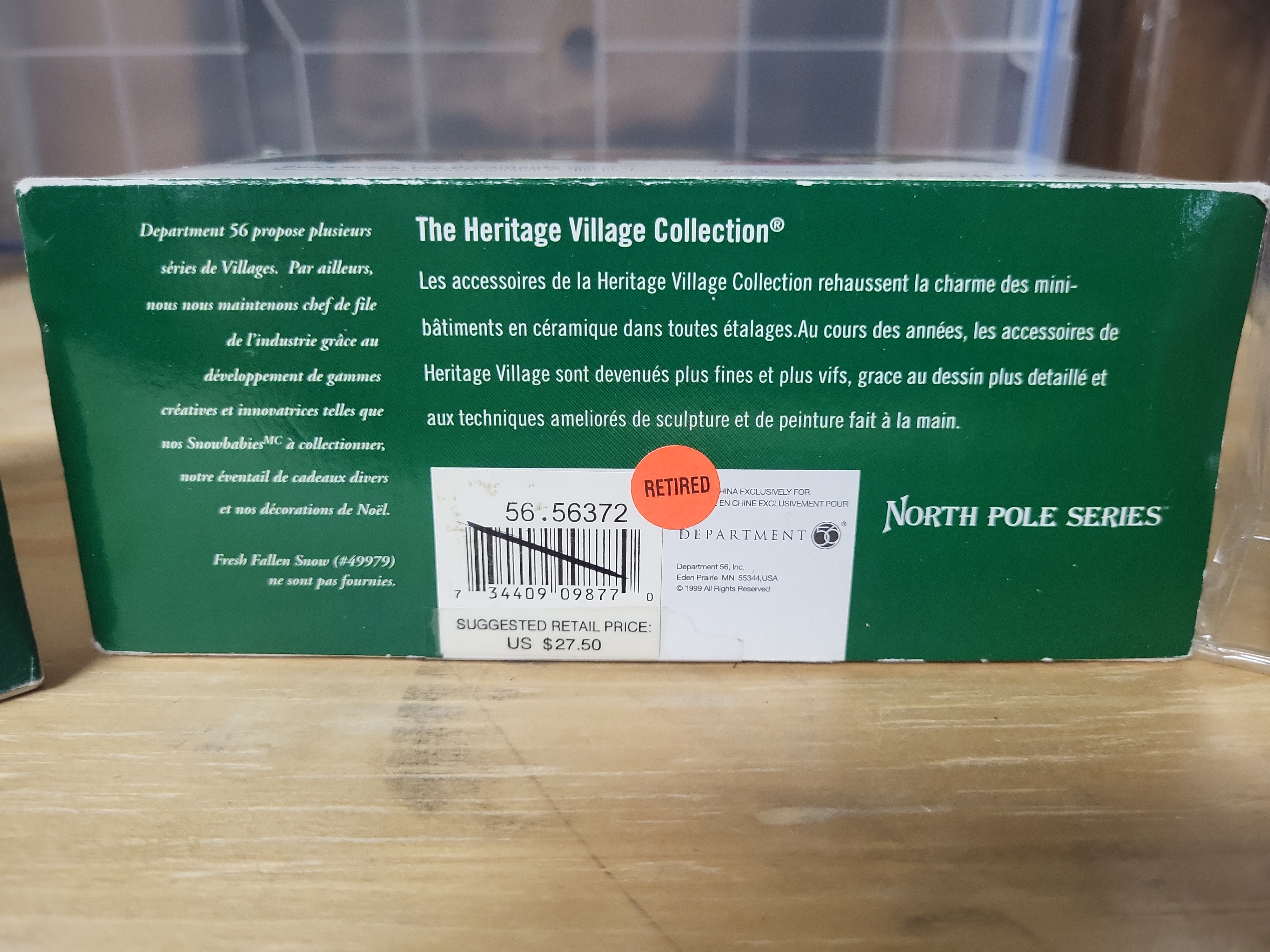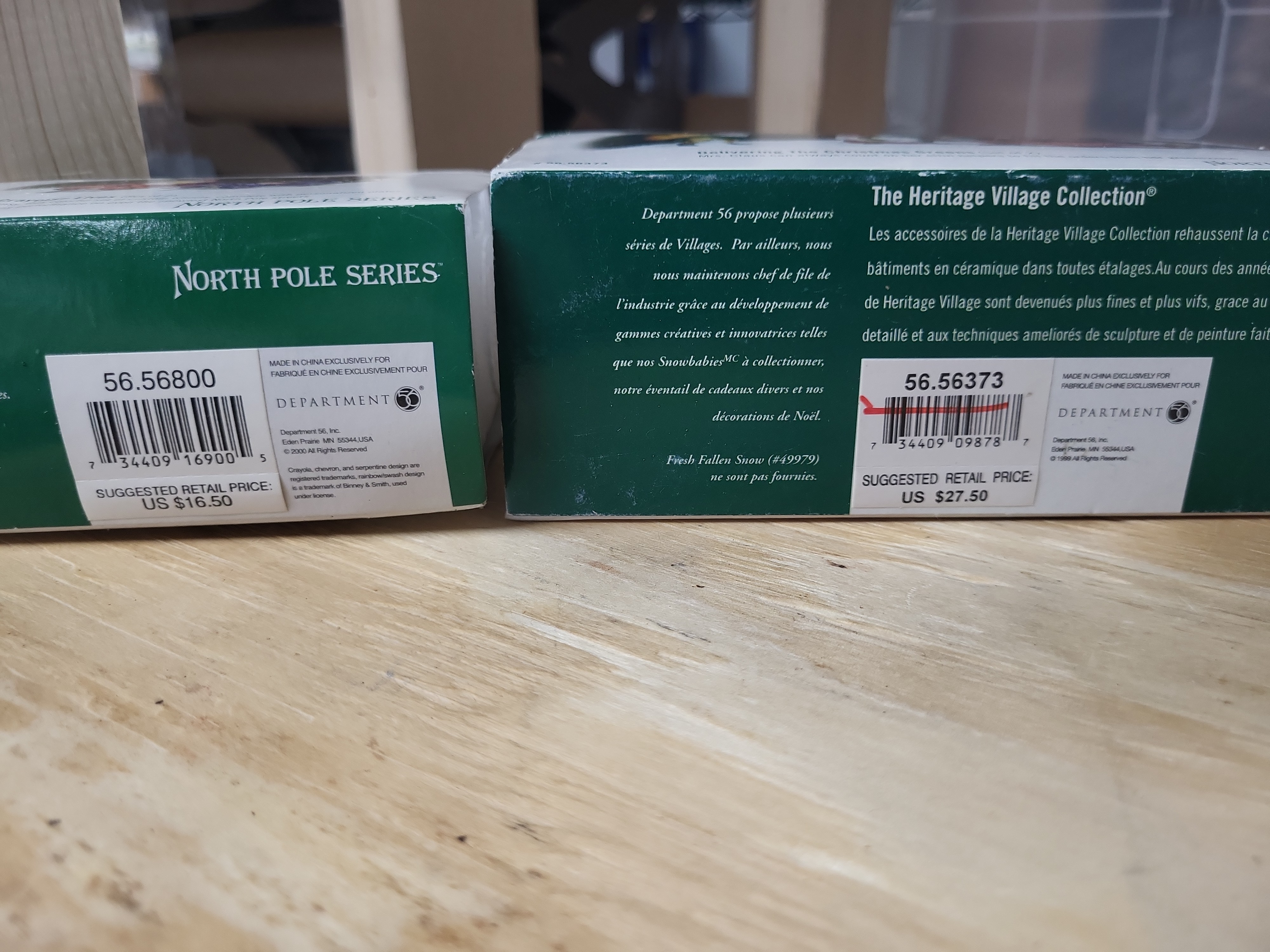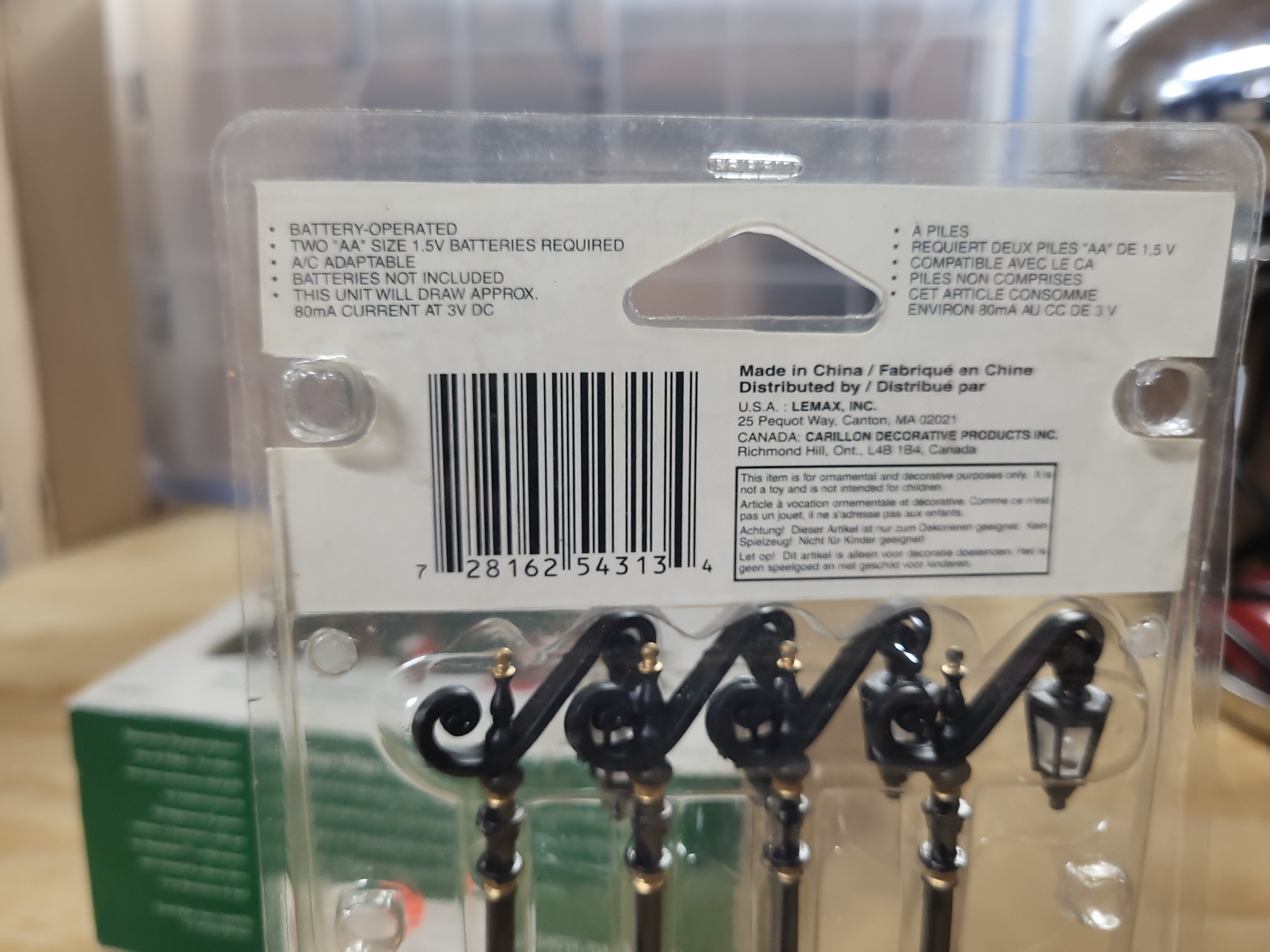 The three Department 56 figurine sets appear complete and in good condition within their original boxes. The boxes exhibit light shelf wear; specifically, the Delivering The Christmas Greens box has a red mark through the barcode, and the Don\'t Break The Ornaments box features an orange Retired sticker and a black mark through the barcode. The Lemax street lamps are new in their original blister pack. The battery-operated light mechanism has not been tested and requires two AA batteries for operation. Paint on the ceramic figurines remains vibrant with no observed chips or cracks.