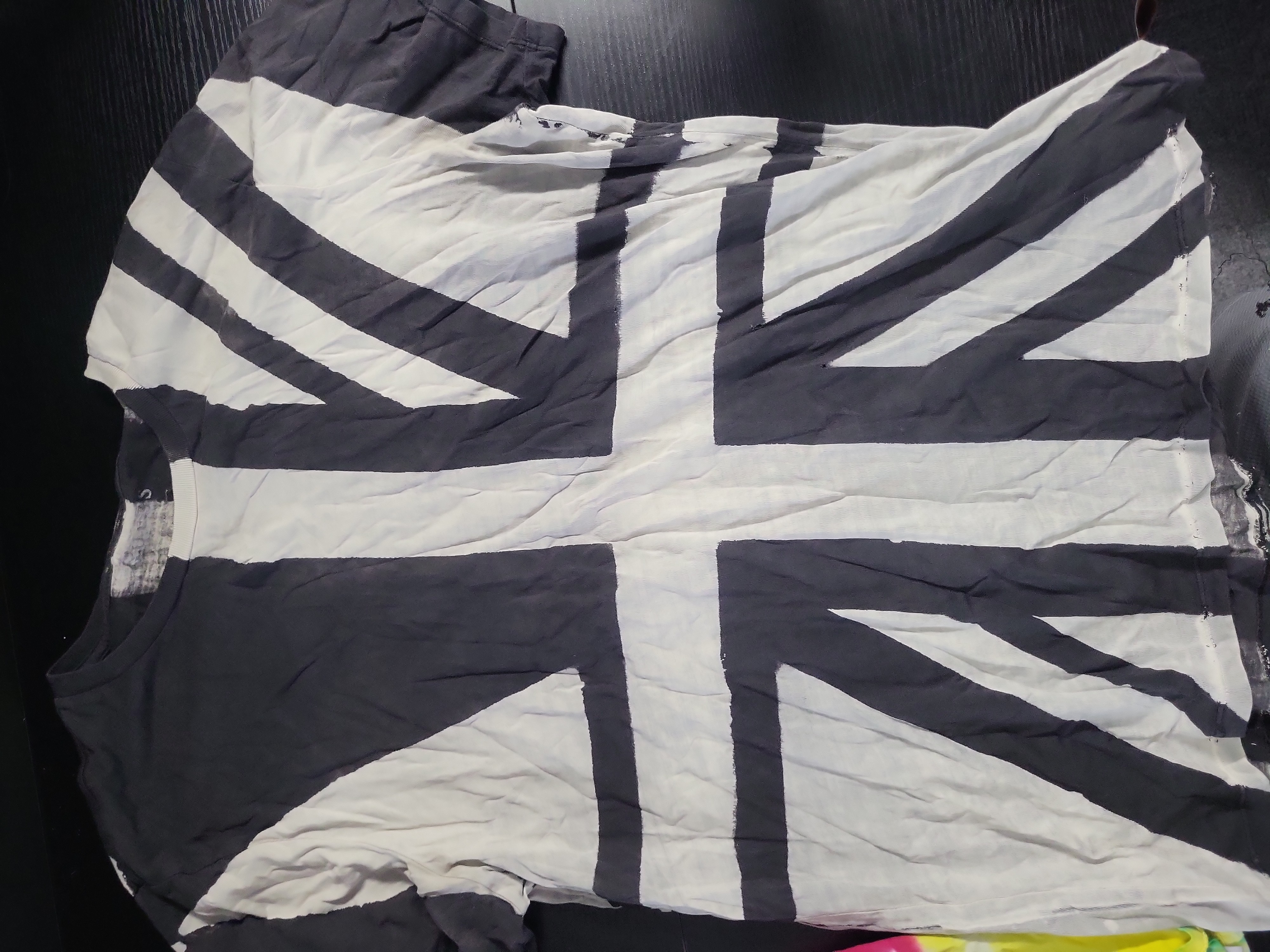 The items range in condition from New With Tags to gently used. Several pieces, most notably the Union Jack shirt, feature intentional factory-applied distressing such as frayed necklines, raw-edge hems, and small decorative holes as part of the original design aesthetic. There are no significant unintended stains, repairs, or signs of heavy wear. Overall condition is very good.