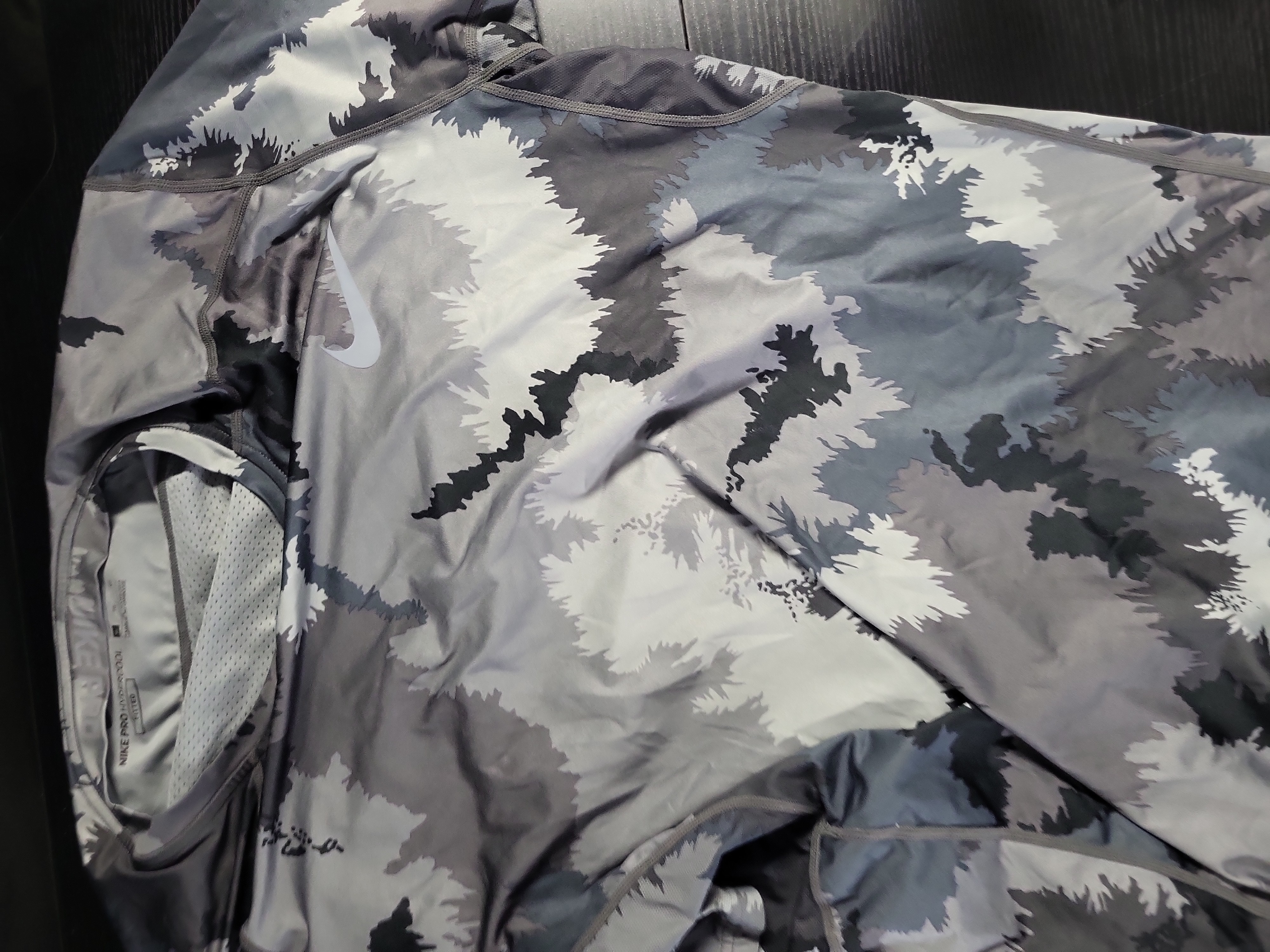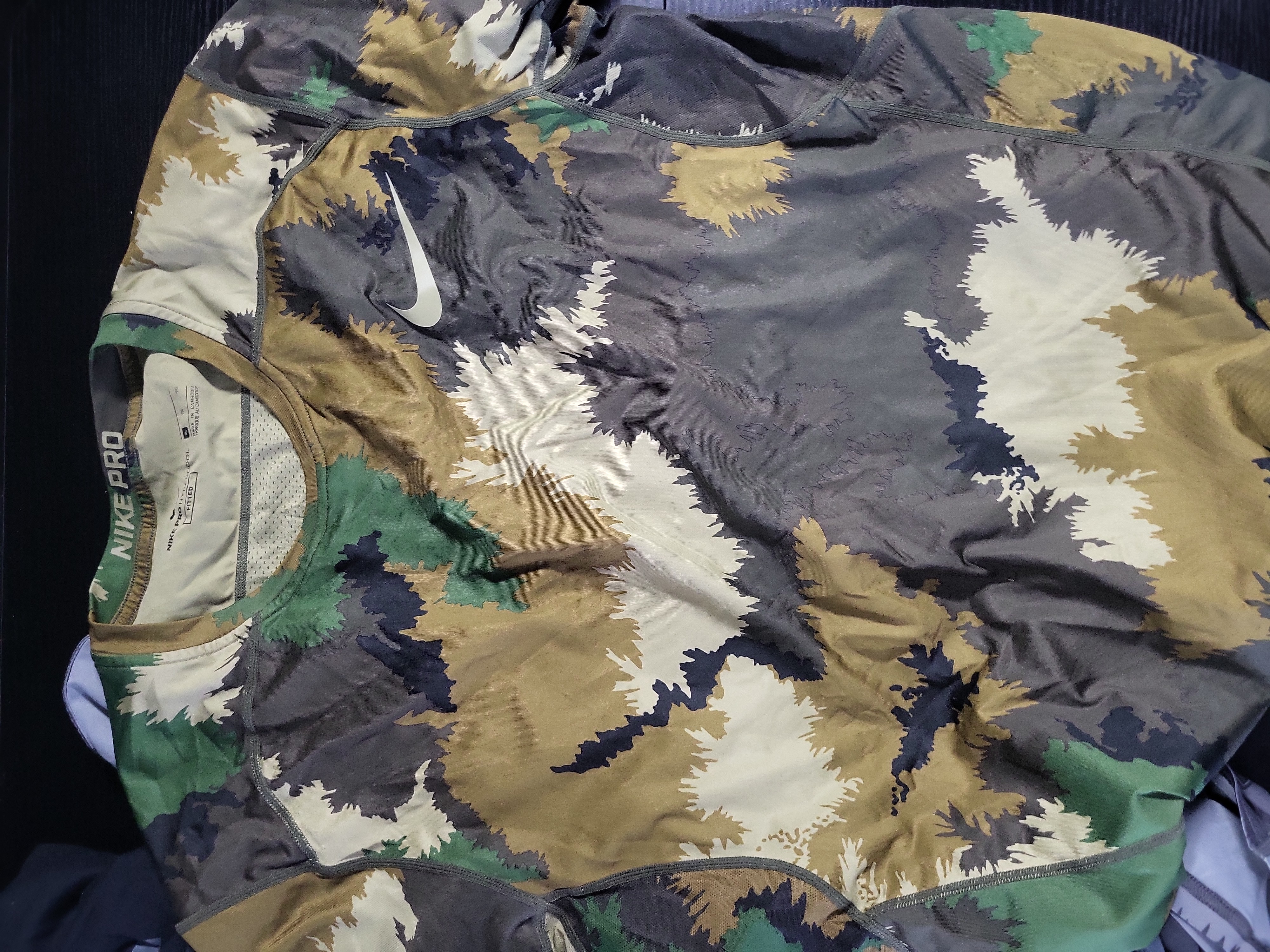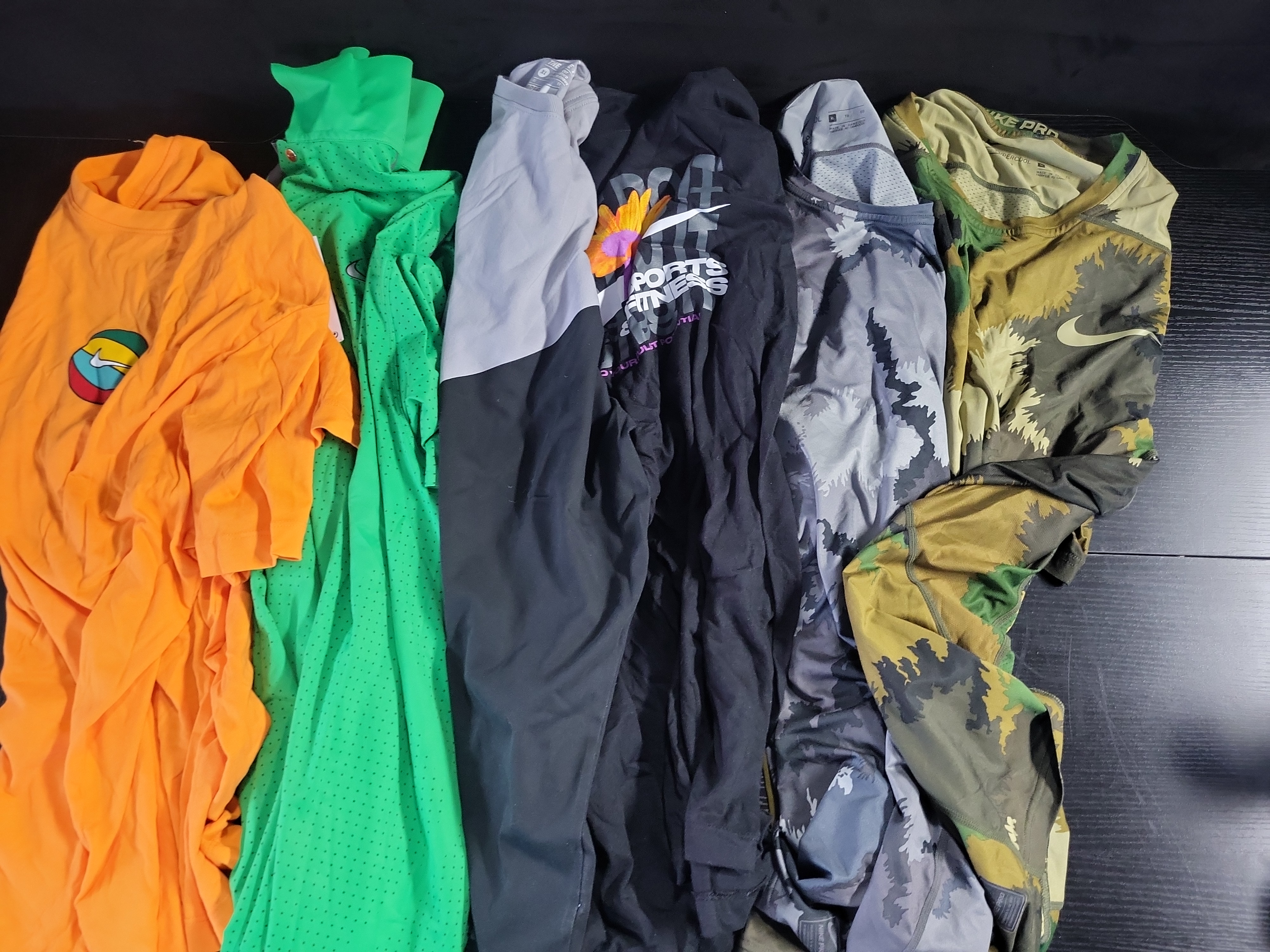 This lot features a collection of six contemporary Nike tops from the 2010s to the 2020s, including both performance-oriented and casual styles. The selection includes a bright green short-sleeved polo from the Tiger Woods Collection, crafted from technical Dri-FIT mesh-perforated fabric with a three-button metal snap placket. Performance wear is represented by two Nike Pro Hypercool Fitted tops: a long-sleeved version in a gray and white camouflage pattern and a short-sleeved version in a traditional forest camouflage palette. Casual offerings include a New With Tags orange crew-neck t-shirt featuring a circular swoosh graphic, a black Nike Sports Fitness NYC-themed t-shirt with a floral sunflower motif, and a gray and black color-blocked long-sleeved athletic top. Performance garments are constructed from synthetic polyester and elastane blends featuring Dri-FIT and Hypercool moisture-wicking technologies with flatlock seam construction. Casual items are composed of cotton or cotton-poly blends. Labels include Nike Pro Hypercool, Nike Pro, and Tiger Woods Collection.