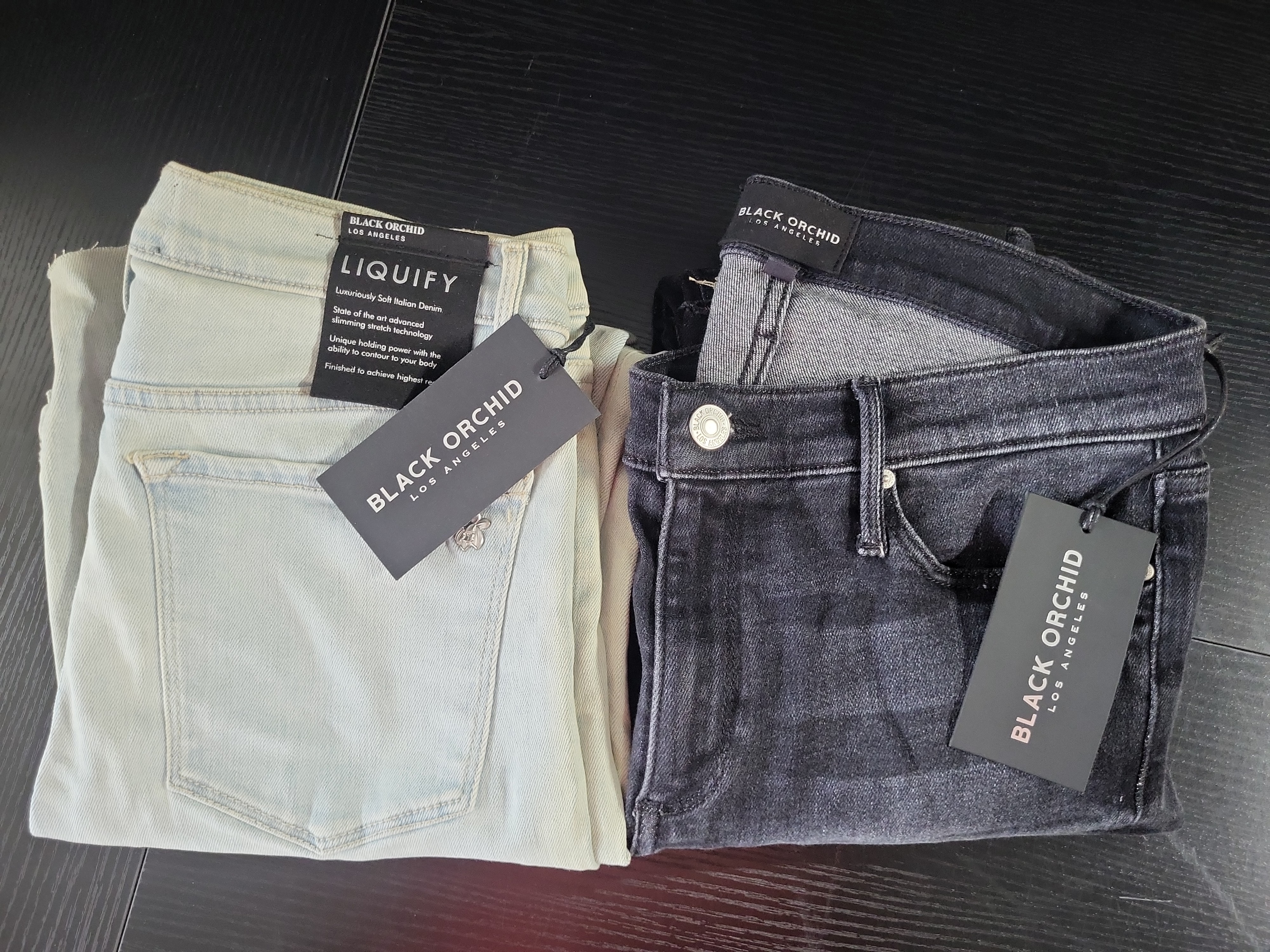 A collection of two pairs of contemporary designer denim jeans by Black Orchid, Los Angeles. The first pair is a light wash denim from the brand’s Liquify line, featuring luxuriously soft Italian denim with advanced slimming stretch technology designed for body contouring. This pair is styled with a classic five-pocket construction, belt loops, a raw-edge frayed hem, and a signature metallic charm on the rear pocket. The second pair is a faded black or dark grey wash featuring tonal stitching, a five-pocket design, and a metal button closure with a concealed fly. Both garments are crafted from a cotton-blend denim with integrated stretch. Woven waistband labels and paper hangtags identify the manufacturer as Black Orchid, Los Angeles. The dark grey pair is marked as a size 27.