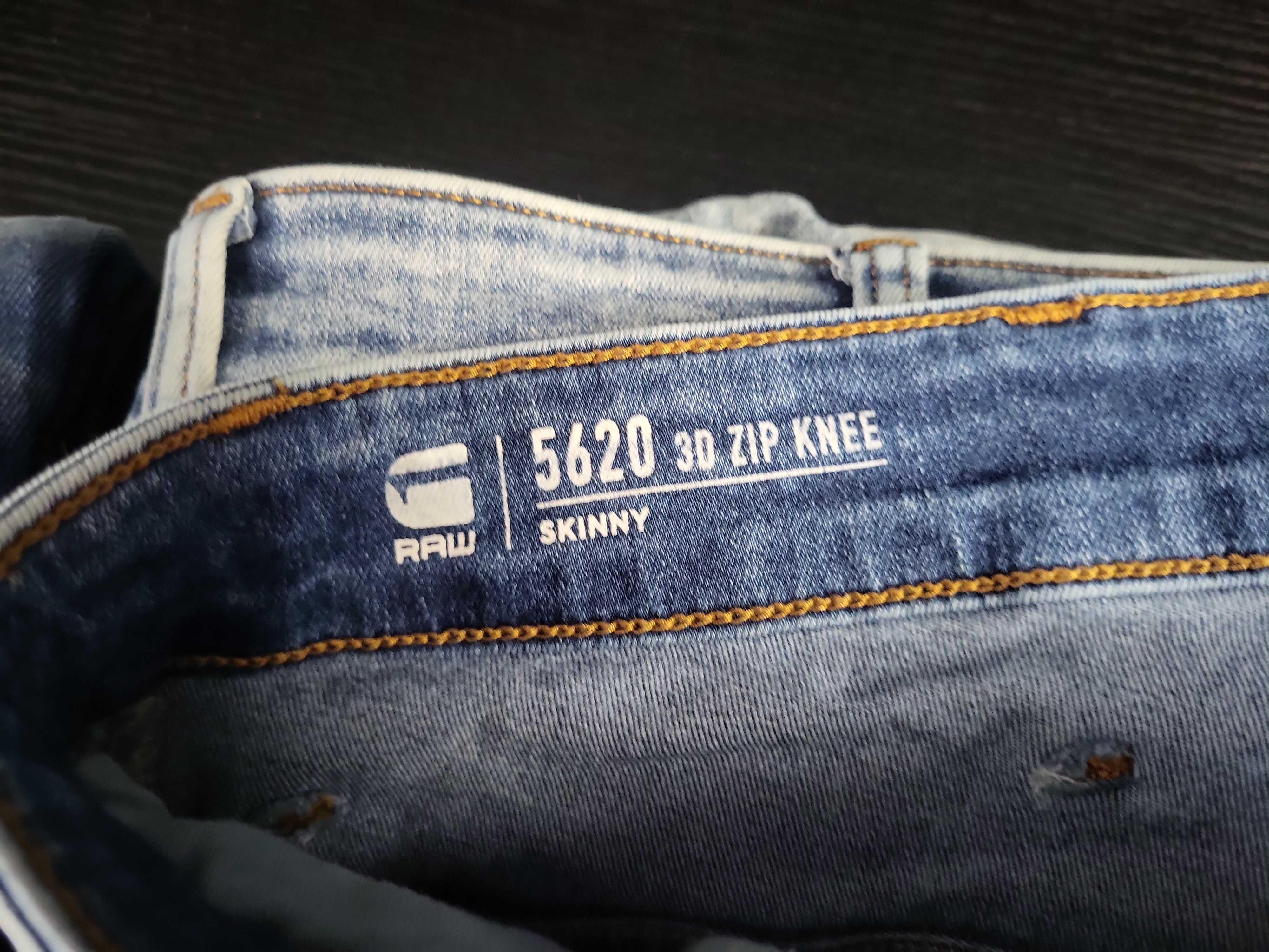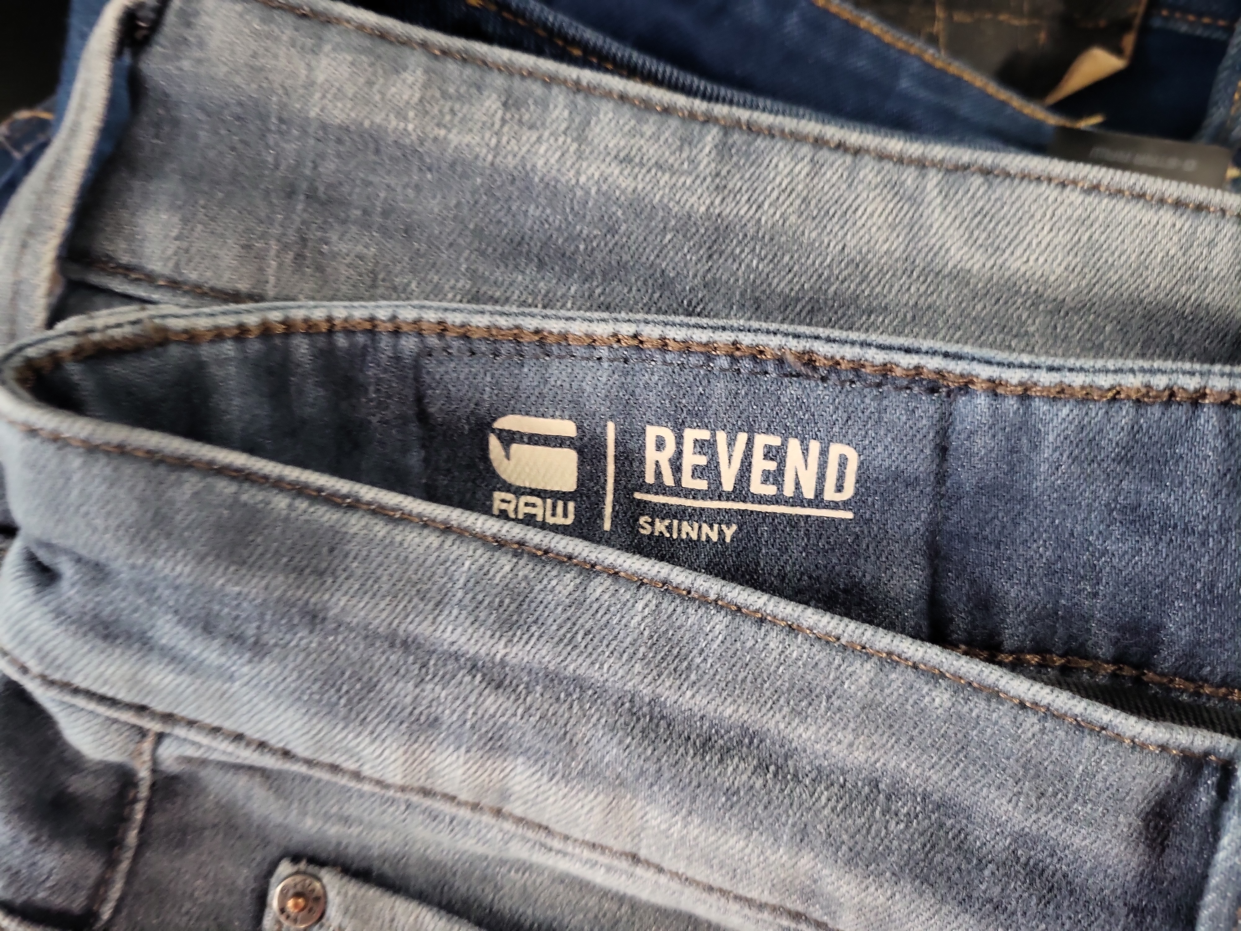 This collection features four pairs of contemporary men’s trousers from the Dutch designer brand G-Star RAW. The lot includes a diverse range of the brand’s signature 3D engineered silhouettes and denim washes. Included is a pair of 5622 3D Tapered trousers in a heavyweight red and black horizontal striped cotton twill, featuring articulated knee paneling and reinforced pocket details. The denim selection comprises a pair of Revend Skinny jeans in a light-wash blue with factory whiskering and fading, and a pair of 5620 3D Zip Knee Skinny jeans in a medium-wash distressed denim featuring the iconic Elwood anatomical construction. The final pair consists of dark-wash blue denim with contrasting orange topstitching and a black rectangular brand patch on the rear waistband. All garments feature authentic G-Star RAW interior waistband labeling and branded metal hardware. Measurements: Various sizes.